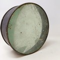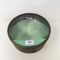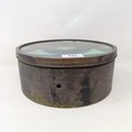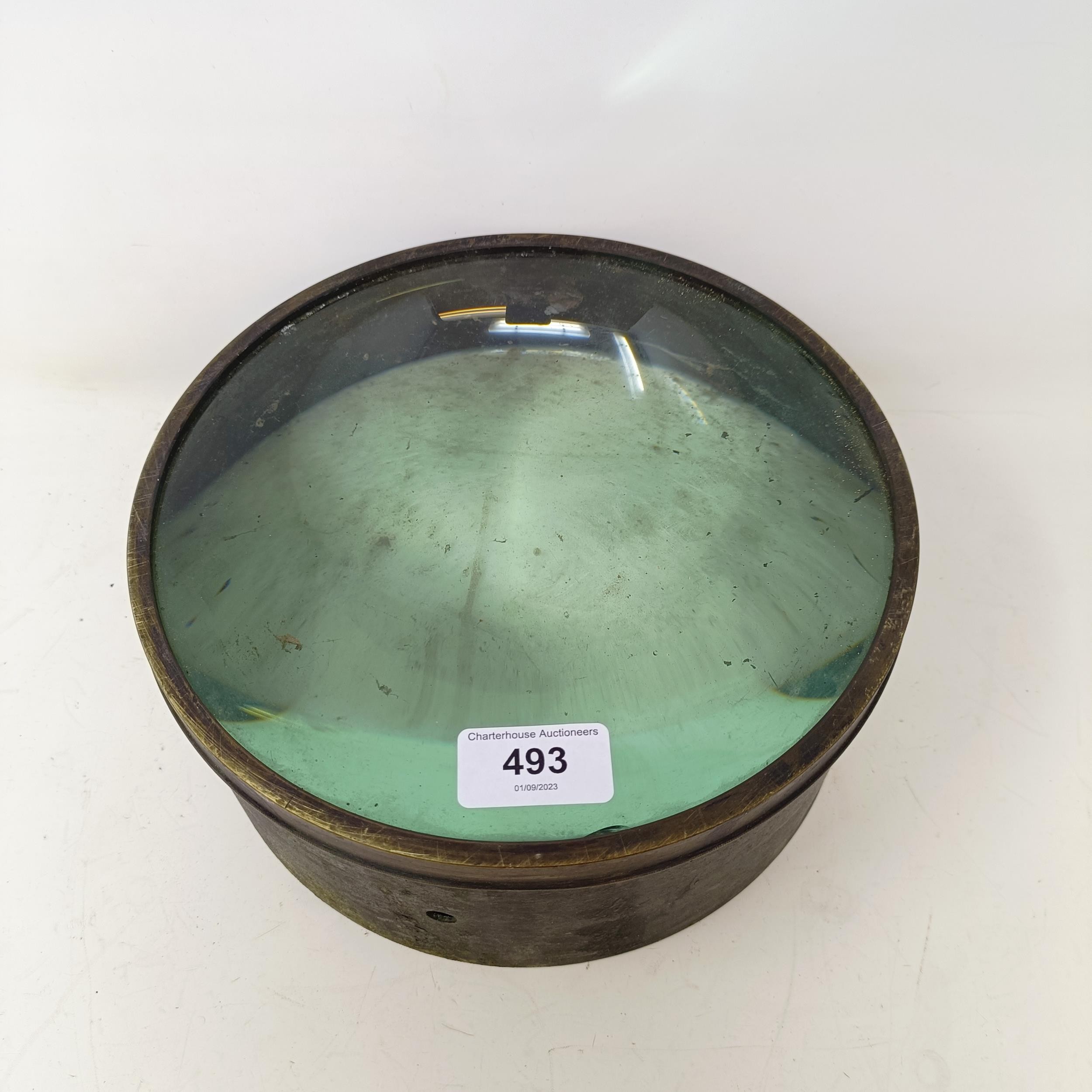 A late 19th/early 20th century table top magnifying glass, in a brass frame, 23 cm diameter x 9.5 cm high