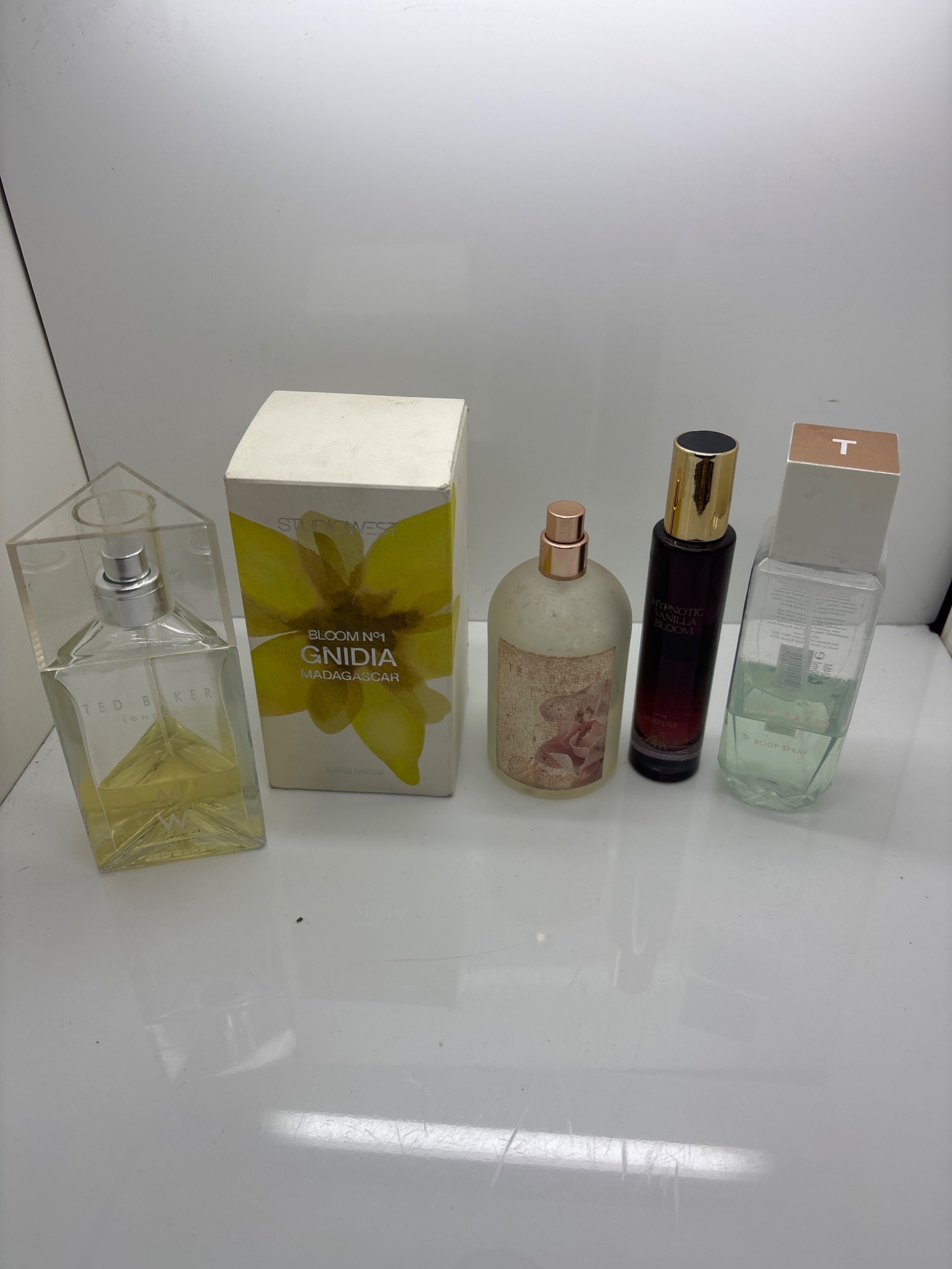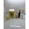 5 perfume two with boxes. Includes spray bottles of varying brands and contents.
