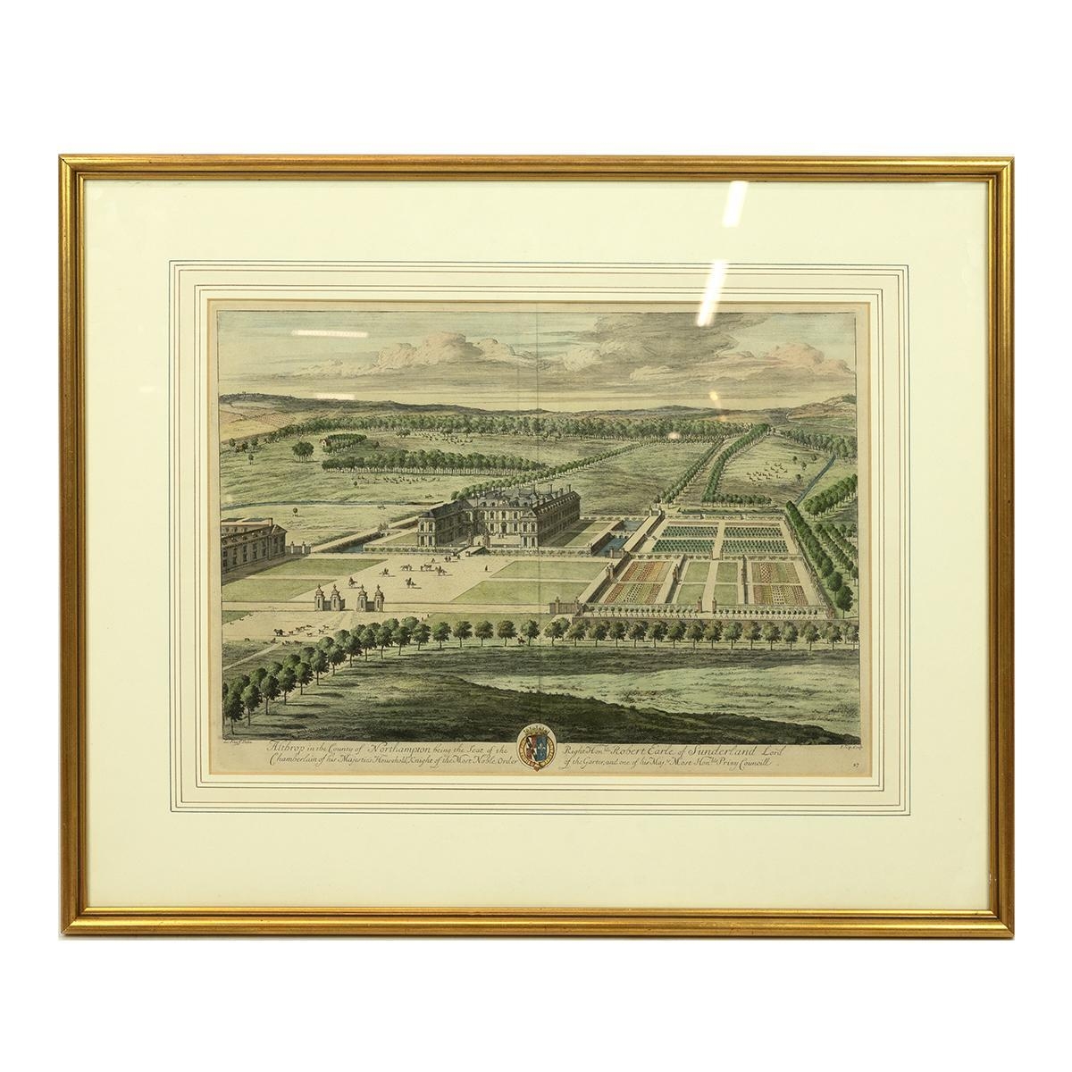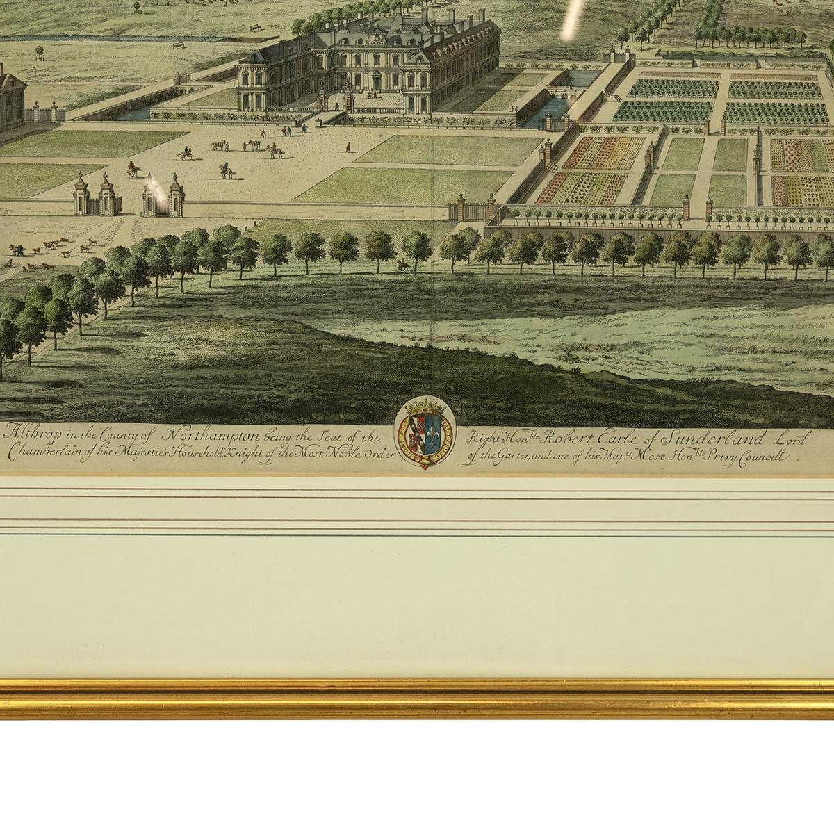 L.Knyff and I.Kip 18th century hand coloured engraving of Althrop, in the county of Northampton, framed and glazed. Mount opening 49cm x 35.5cm, frame 70.5cm x 58.5cm.