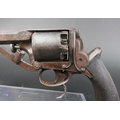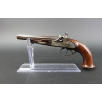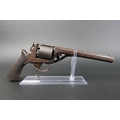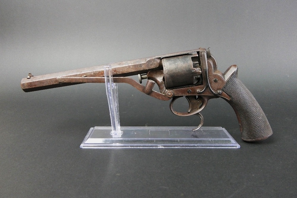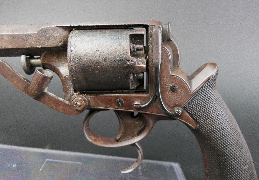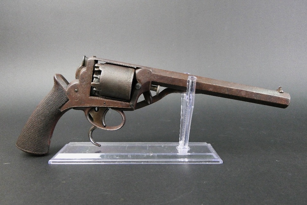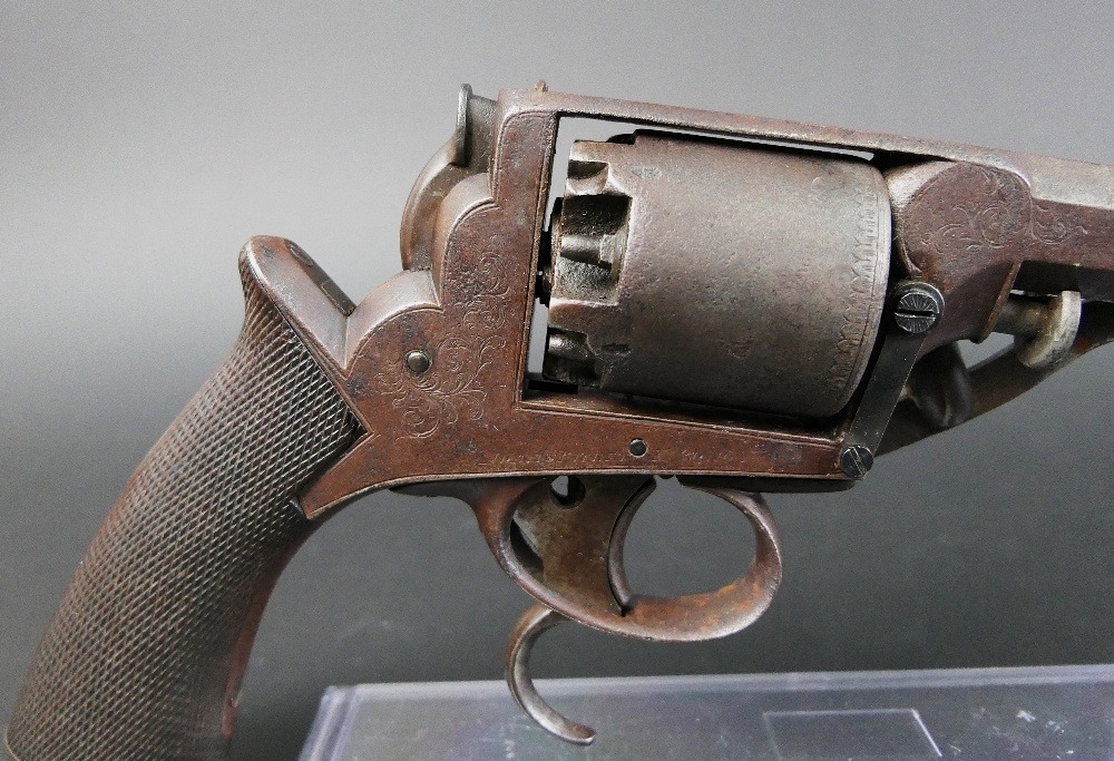 B Cogswell London Tranter percussion pistol, with 7 3/4" hexagonal barrel, marked to the top B Cogswell 224 Strand London, with 5 shot cylinder with sparse engraving, the frame with foliate engraving and marked Adams Patent No. 20116Y, with wooden grips. Overall length +/- 35 cm. Sold as section 58 obsolete calibre.