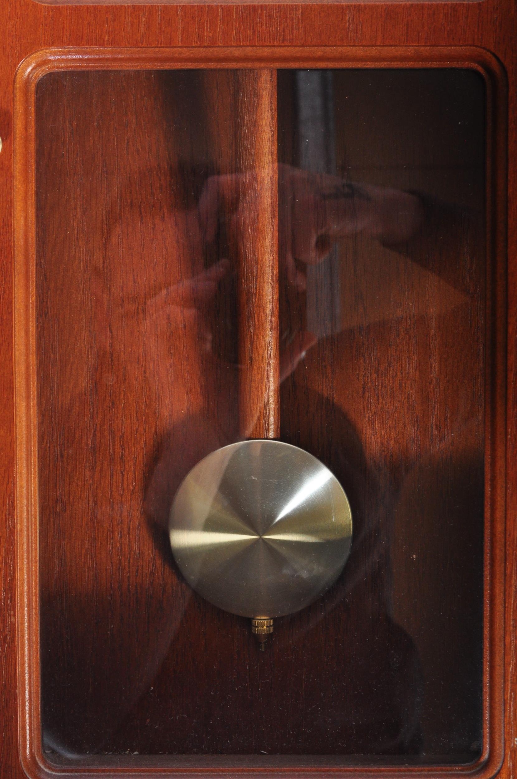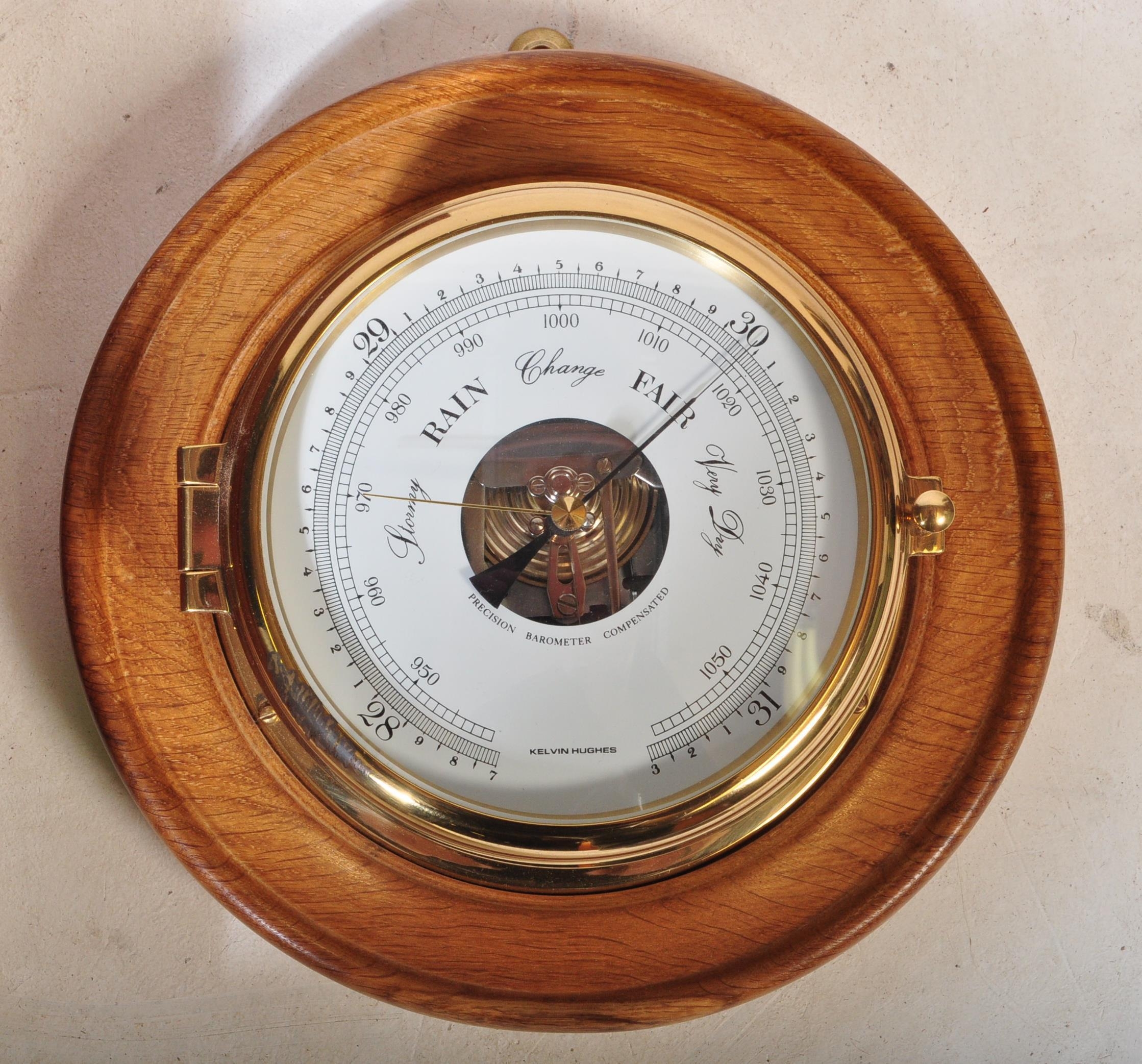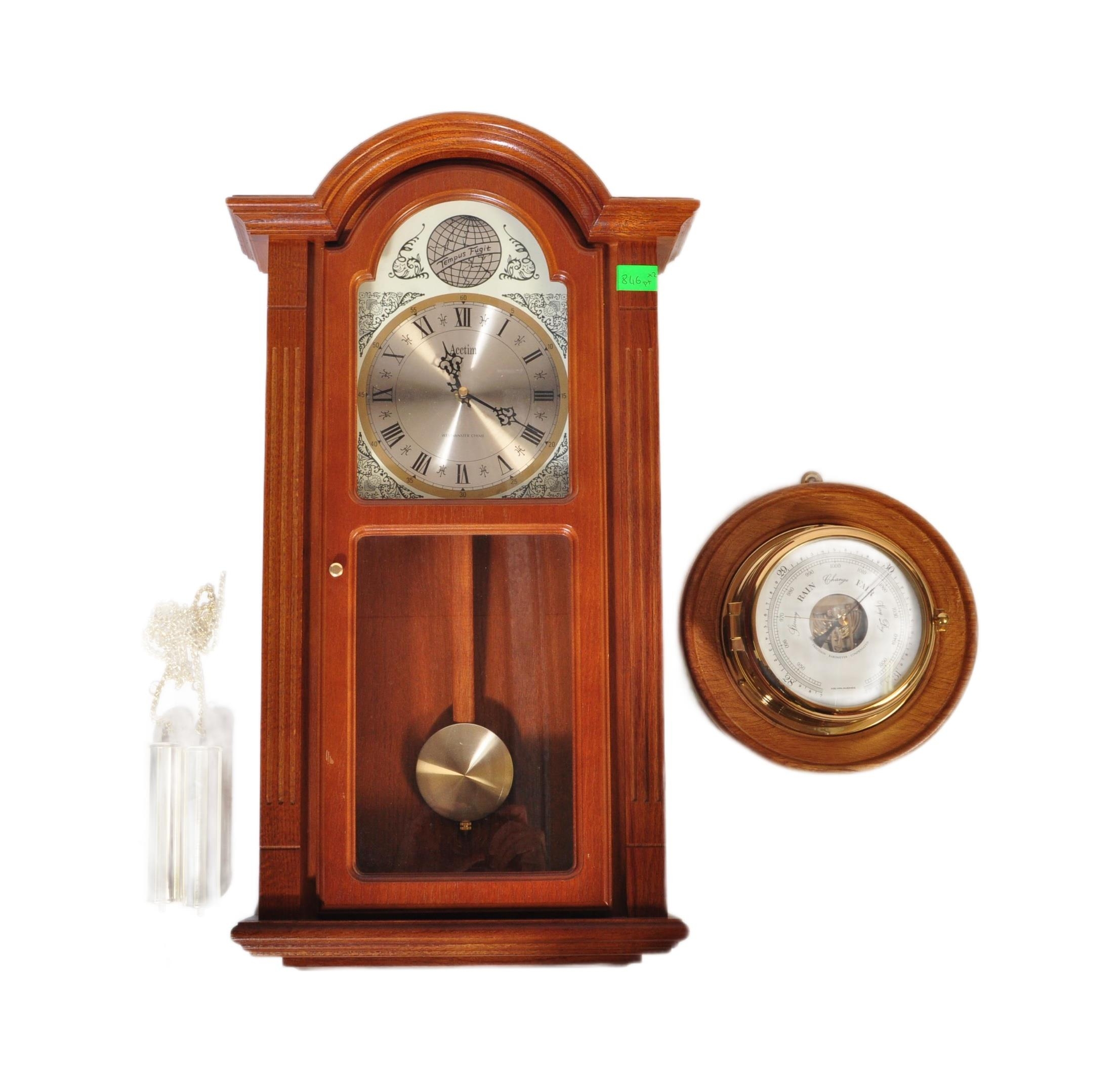A 20th century Kelvin Hughes brass & wood wall barometer. The lot together with a 20th century Acctim Westminster chime wall clock. Measures approx; 69cm x 39cm x 13cm.