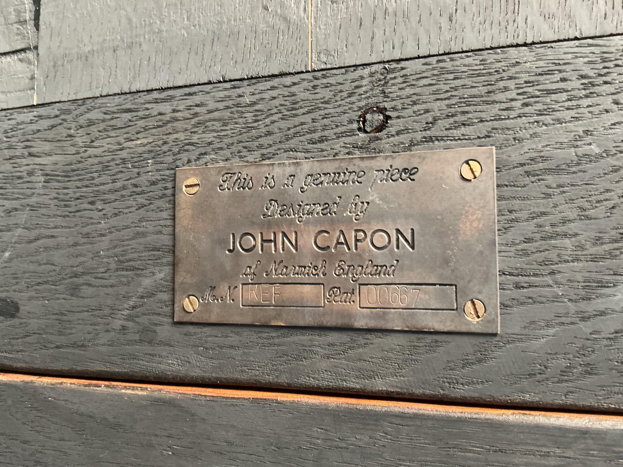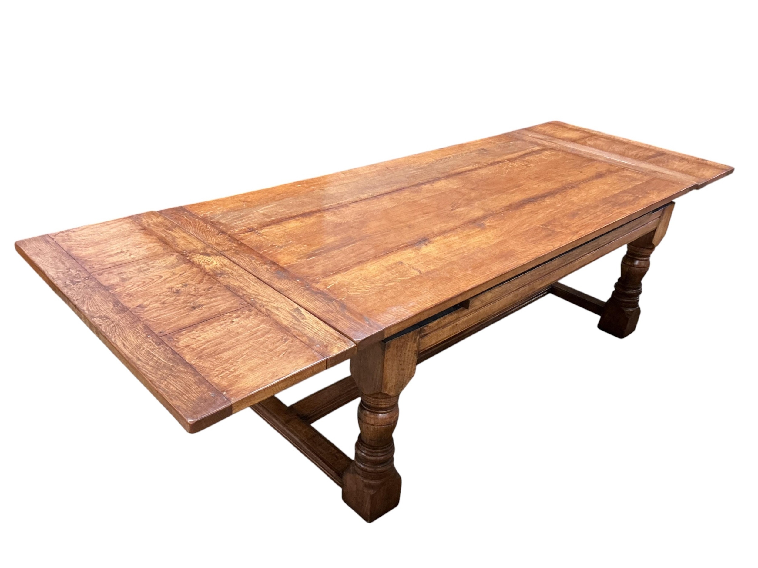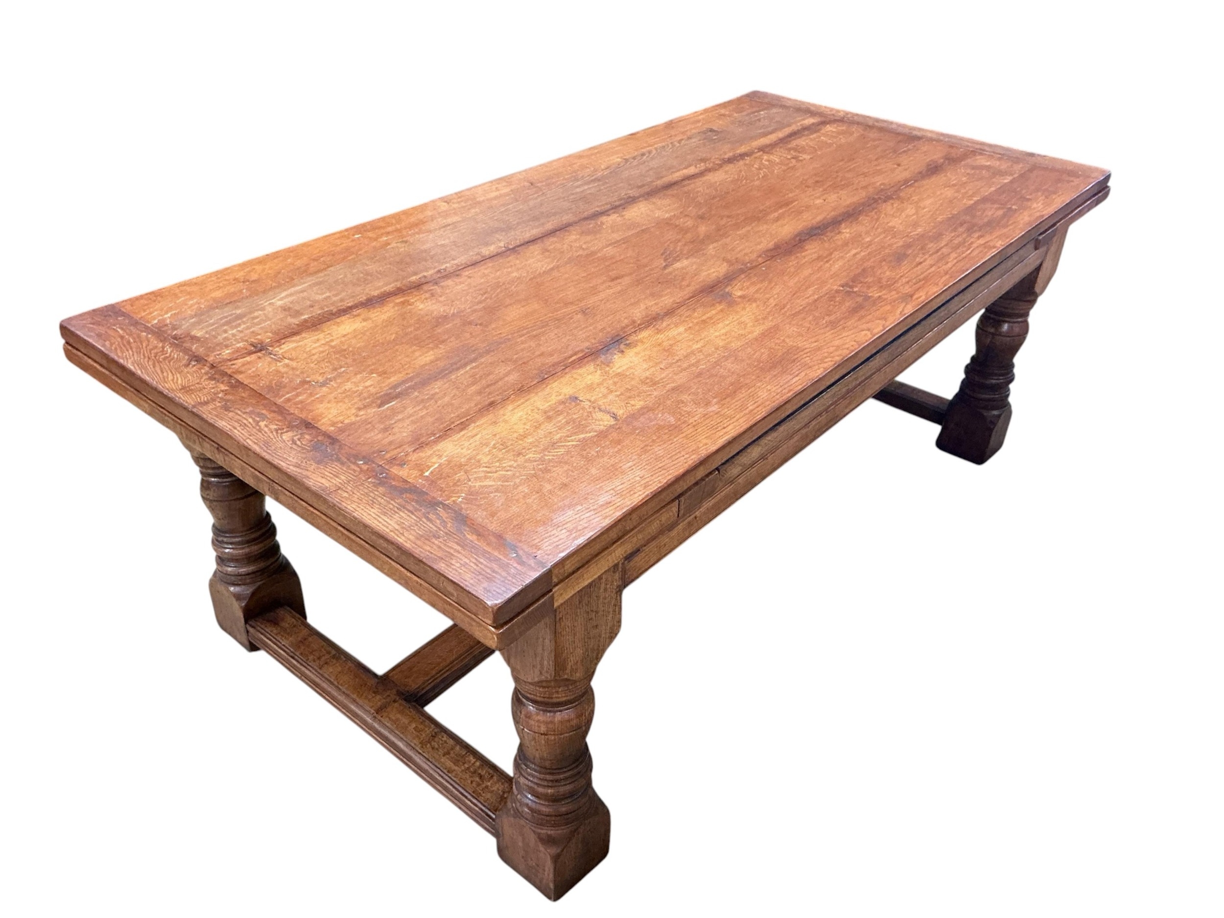 An 18th style rectangular oak draw leaf refectory dining table by John Capon of Norwich with cleated three plank top, width 213cm, depth 106cm, height 78cm (each leaf 45cm)