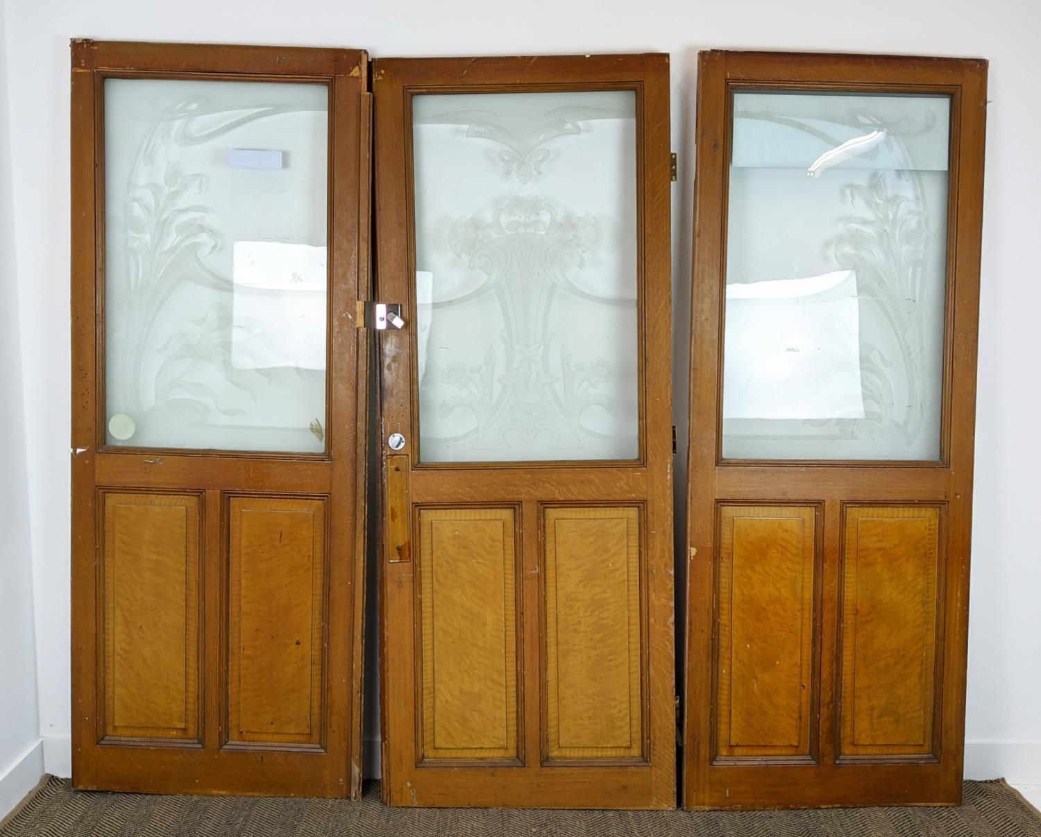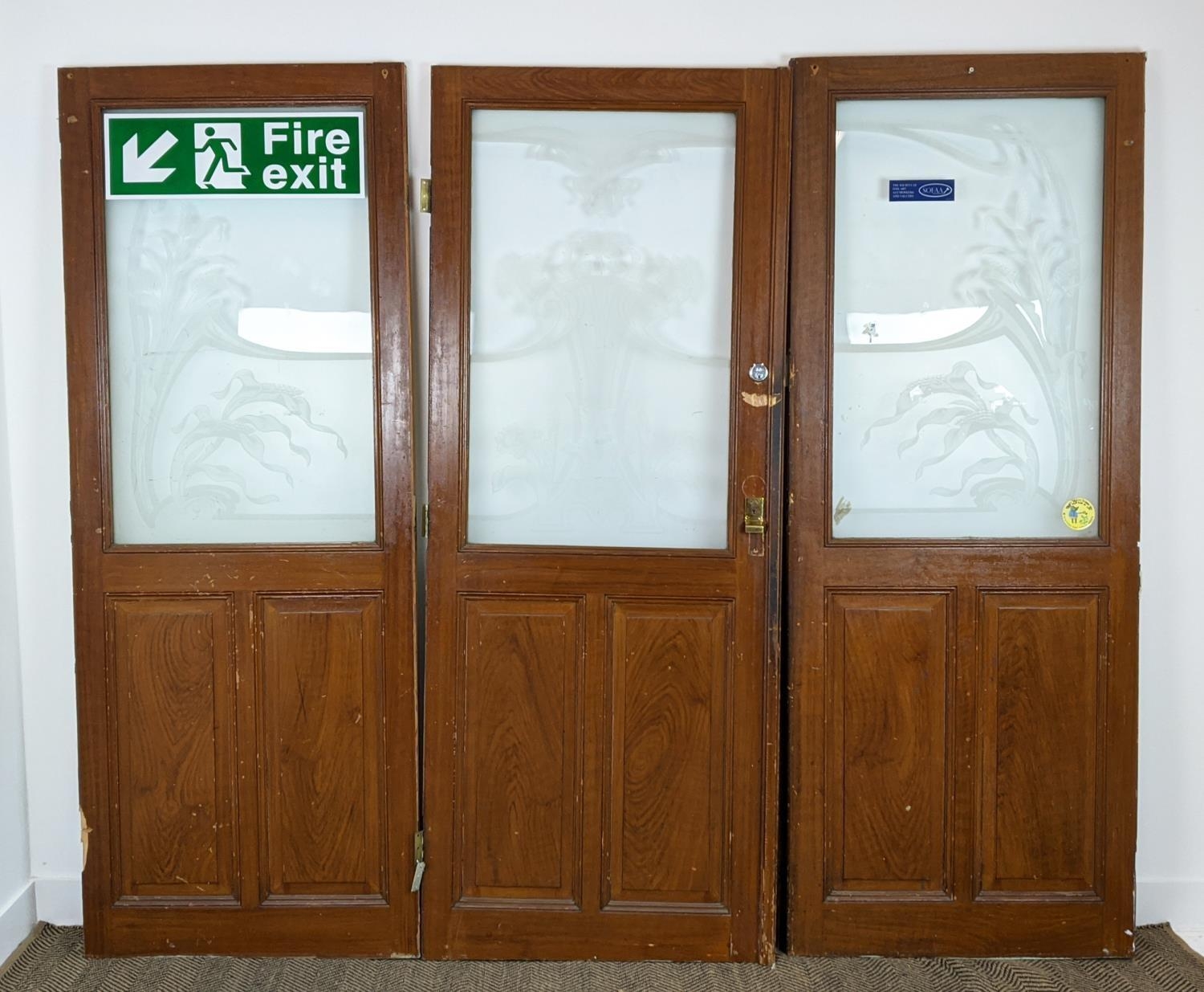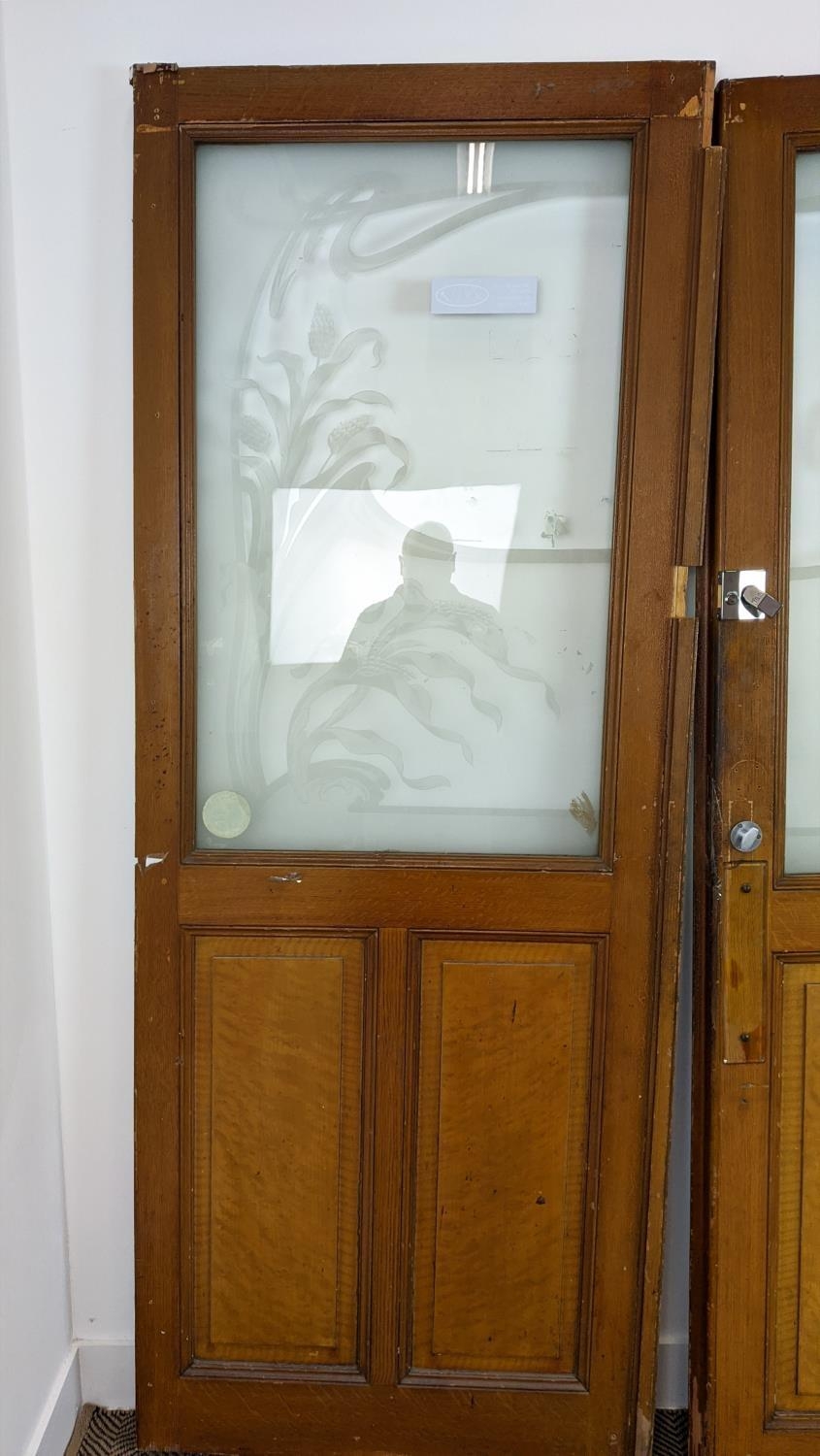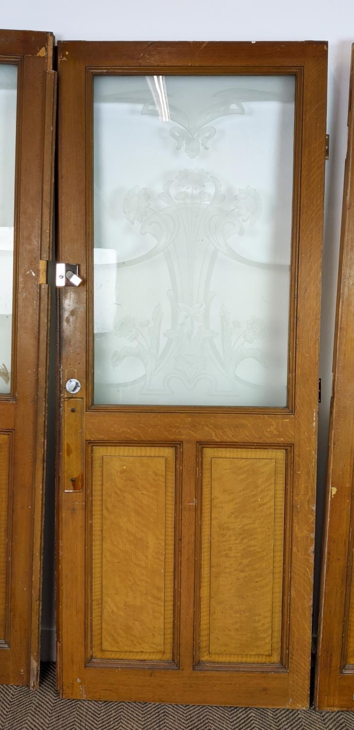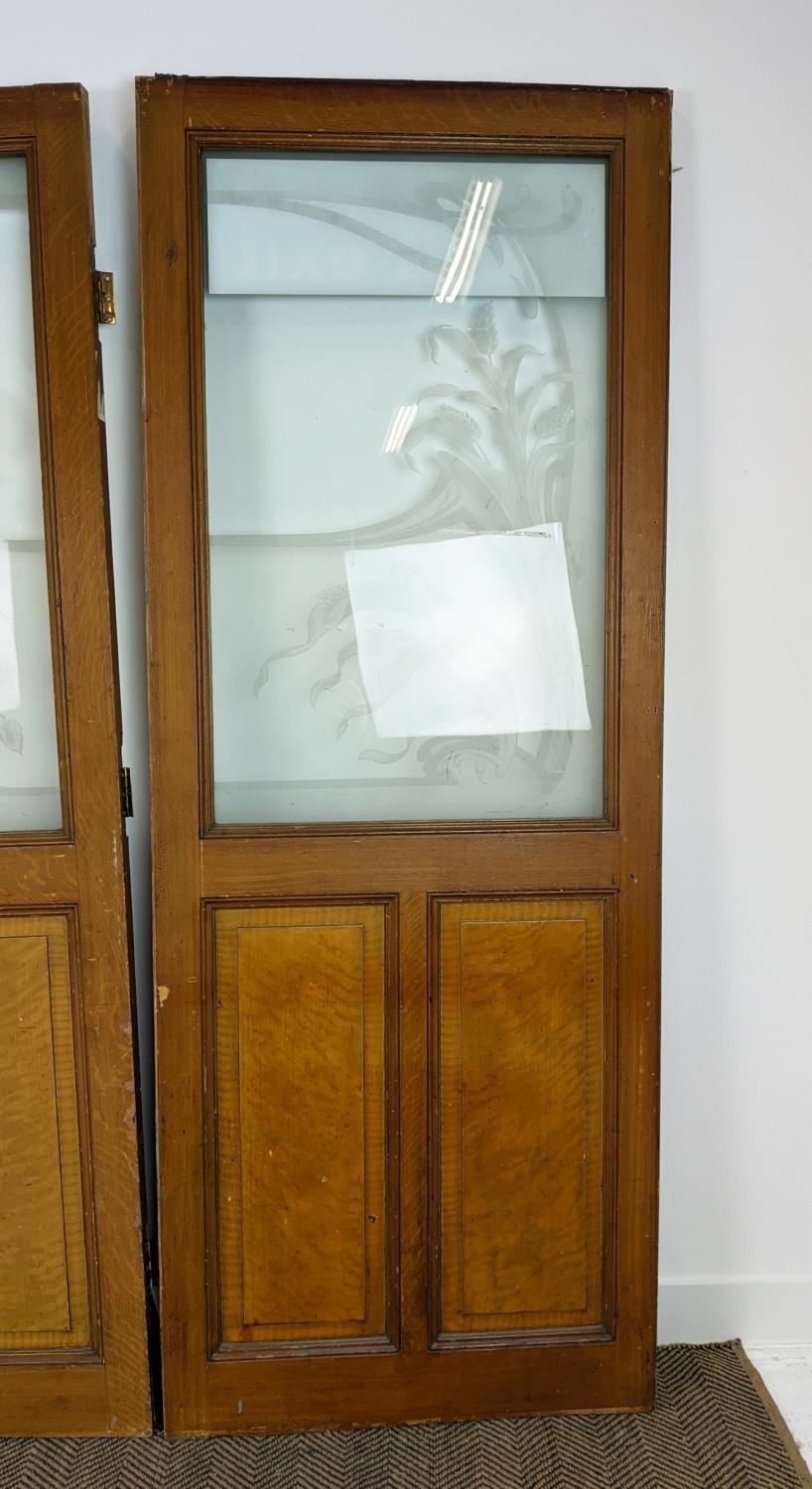 DOOR PANELS, a set of three late 19th century Dutch, grain painted with Art Nouveau etched glass, each 207cm H x 80cm W. (3)