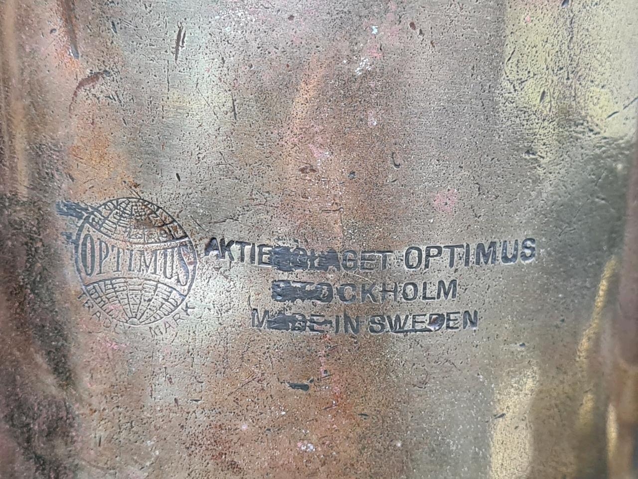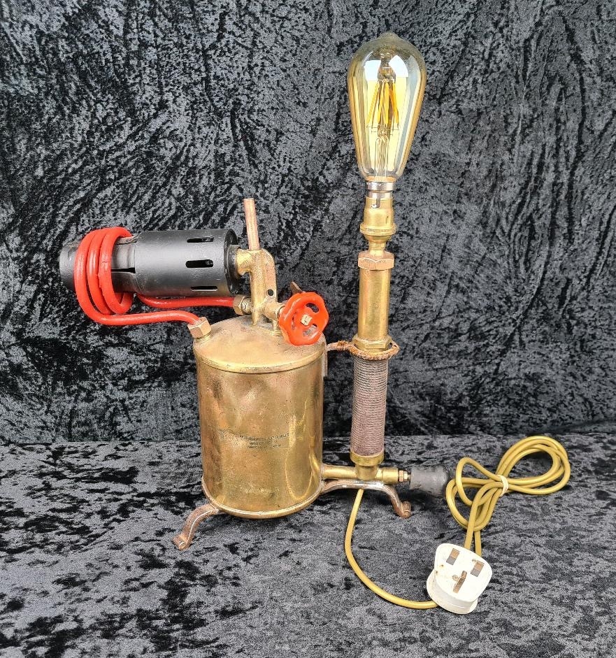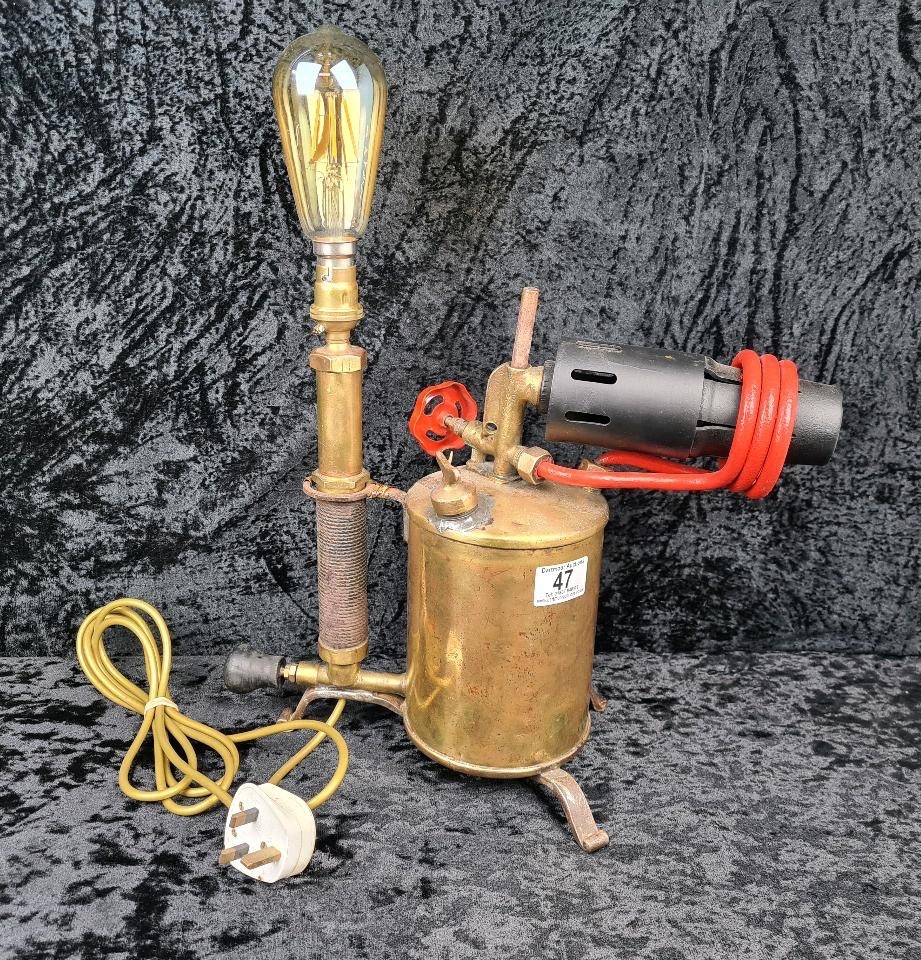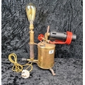 Industrial-style electric table lamp repurposed from a vintage brass blow-torch. Approx H45cm.