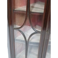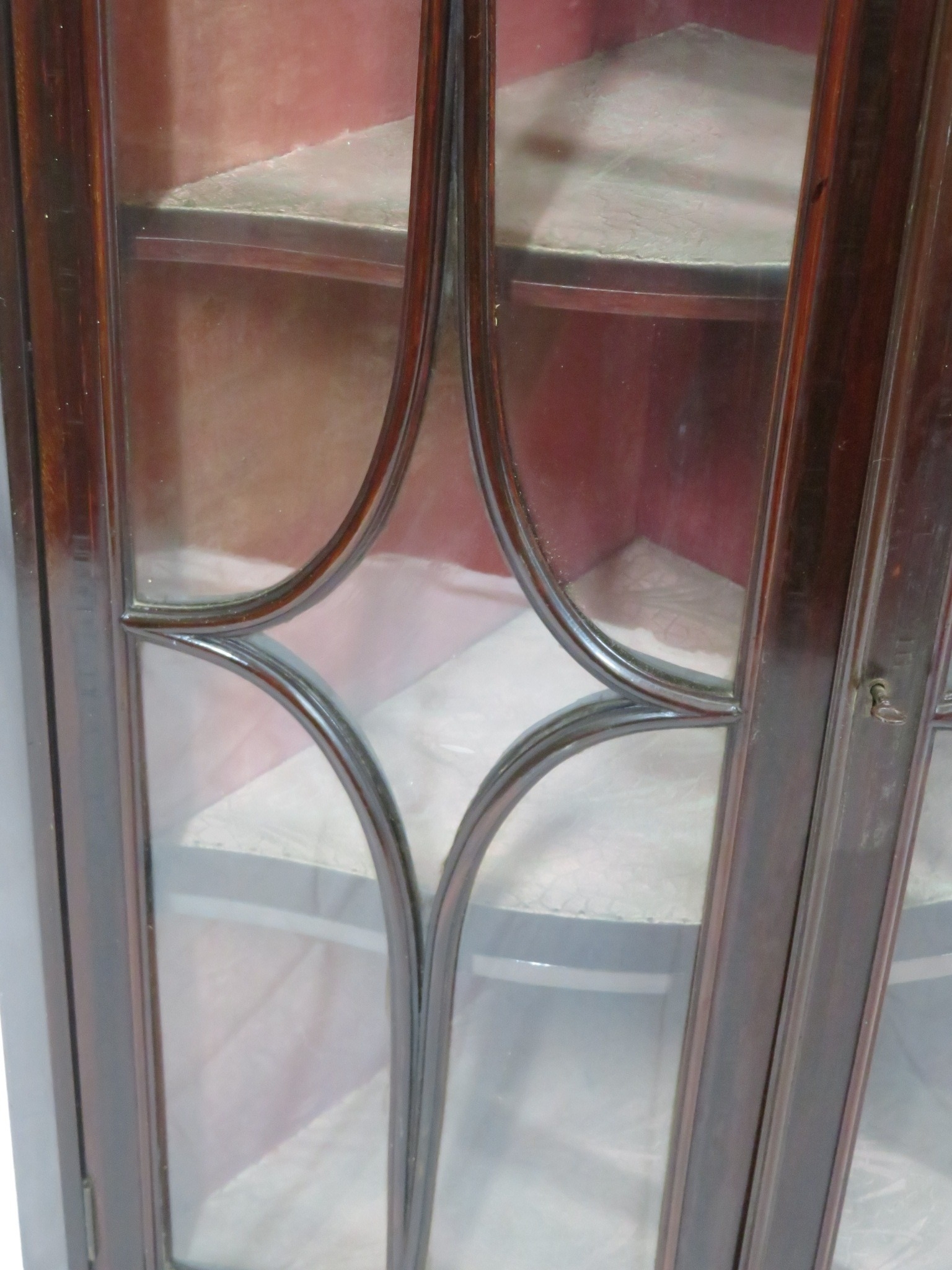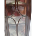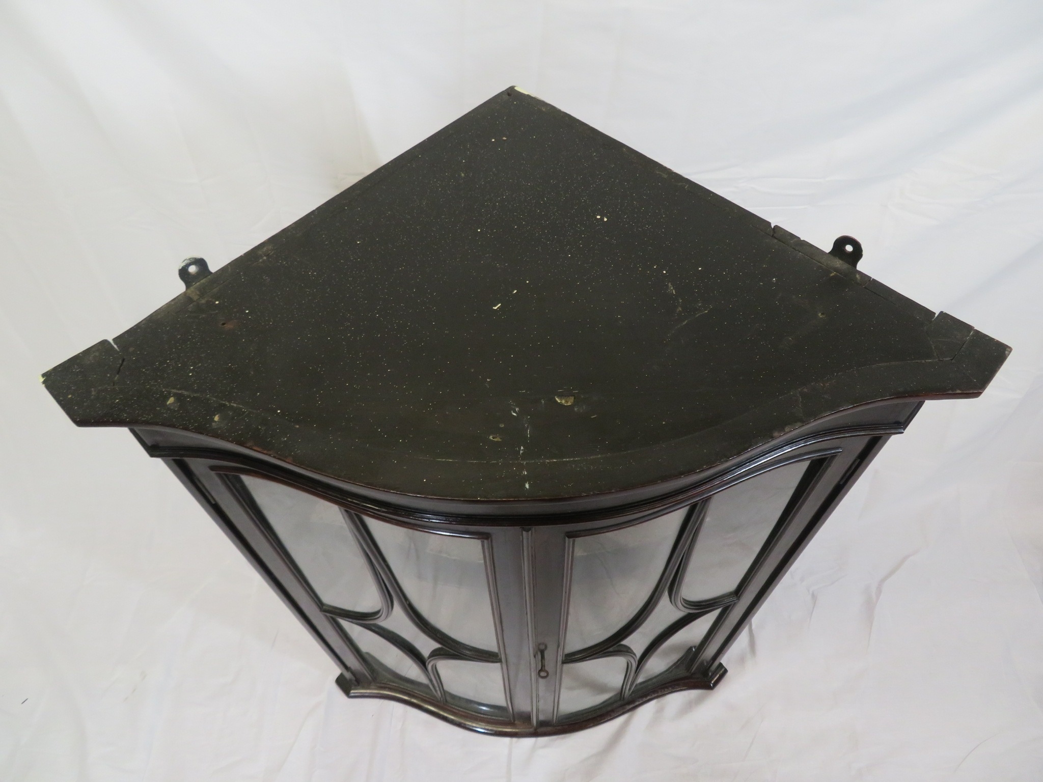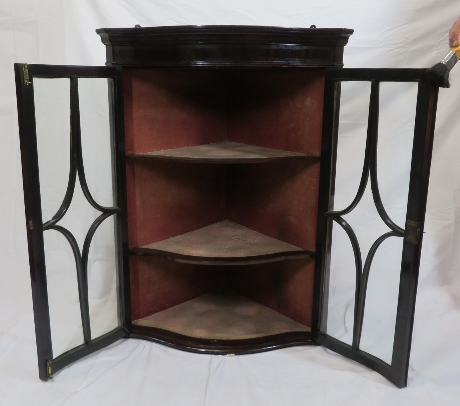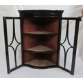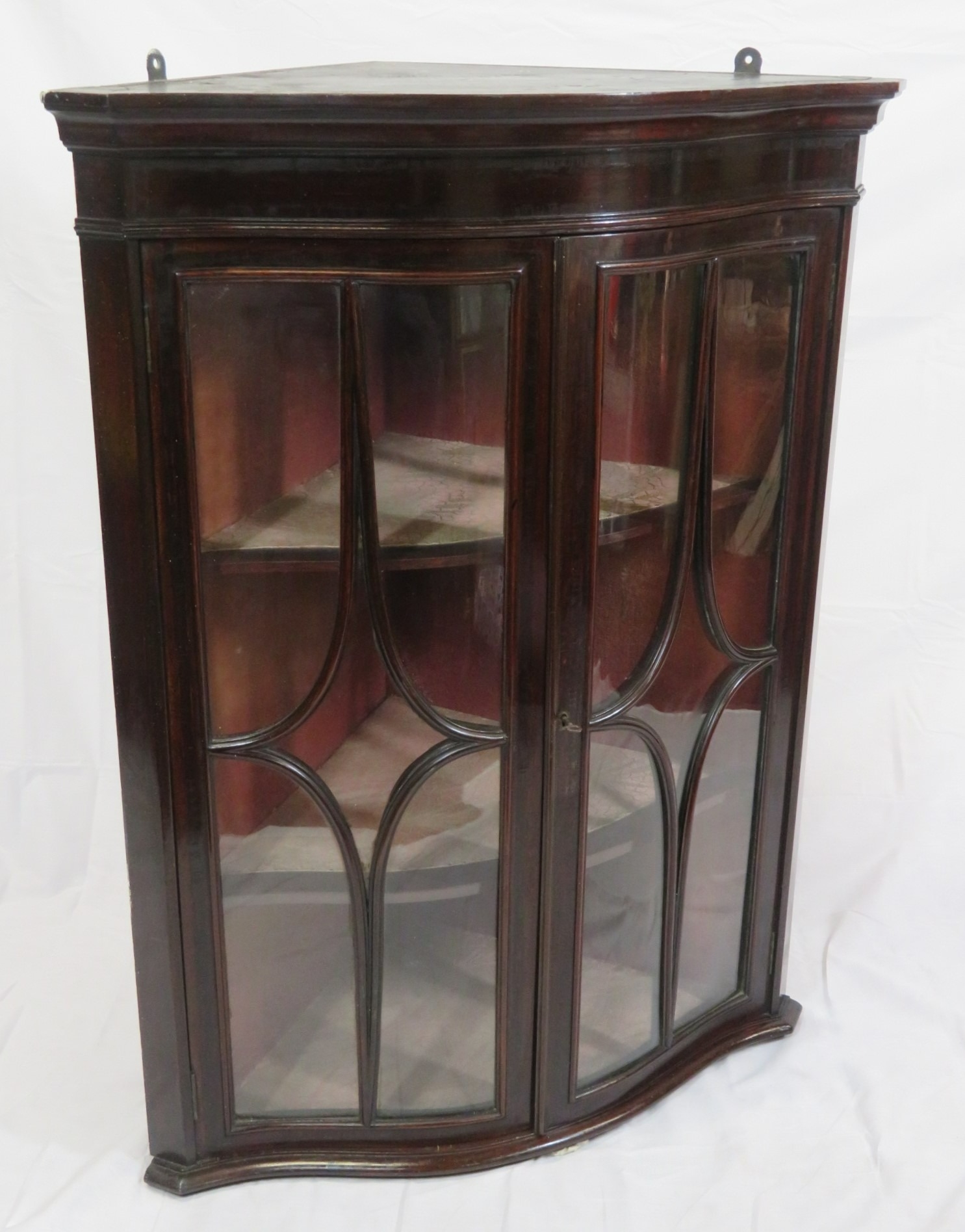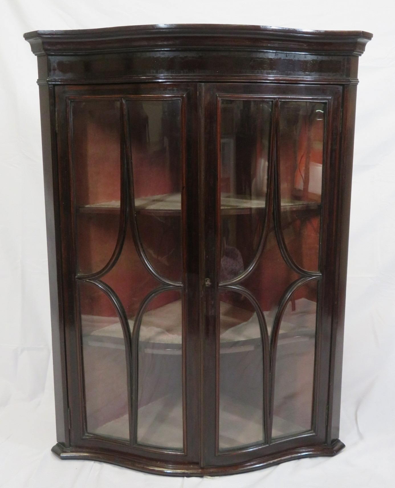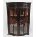 Victorian mahogany serpentine fronted corner wall display cabinet with glazed doors and shelved lined interior
