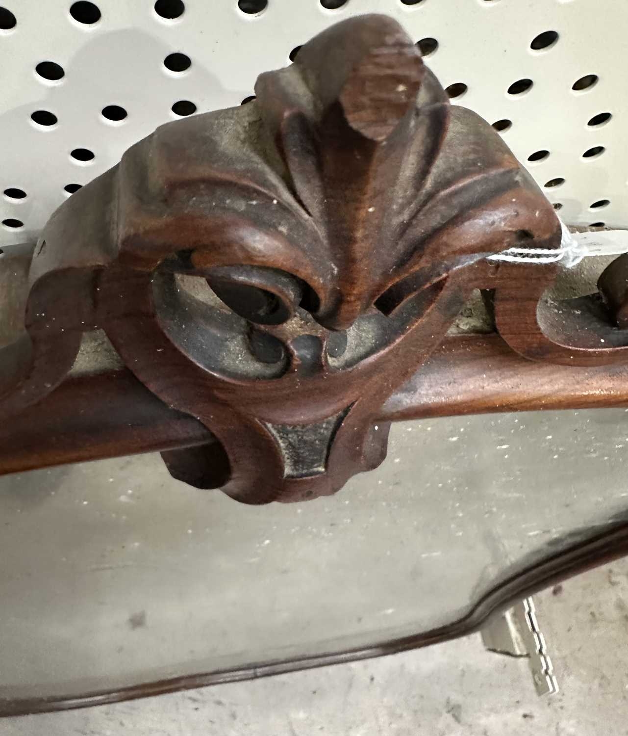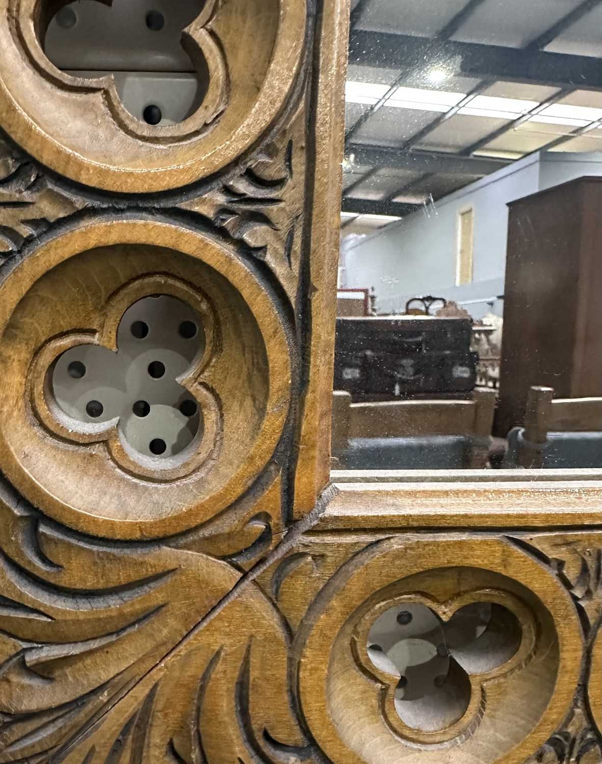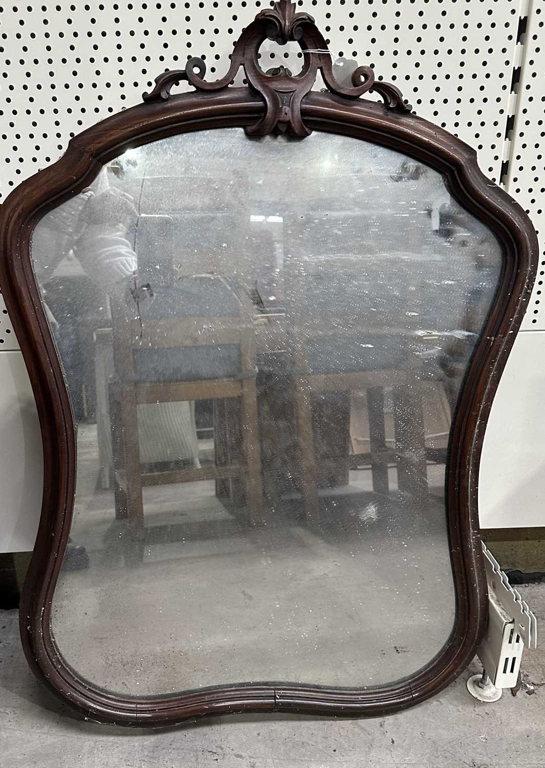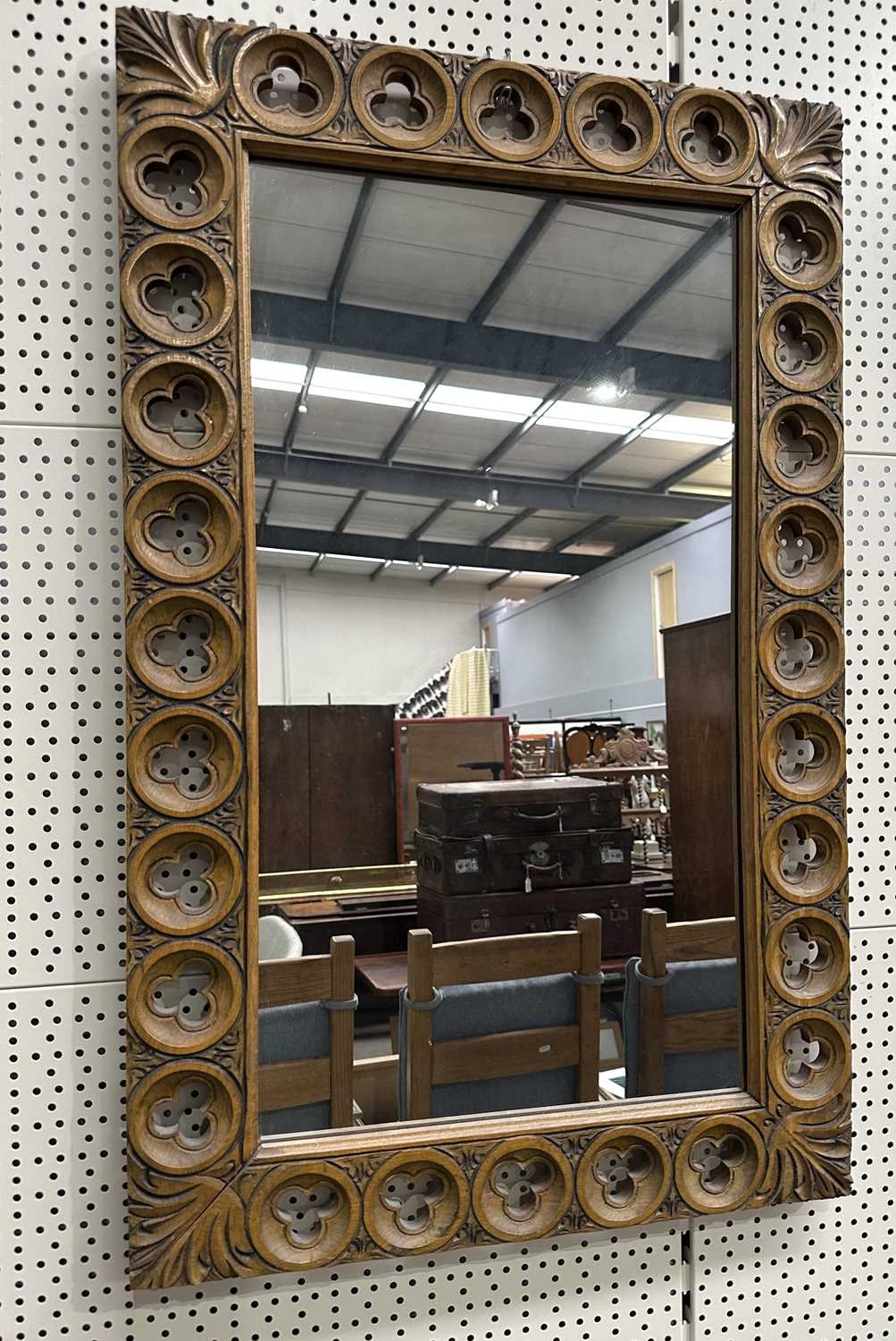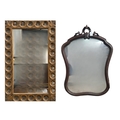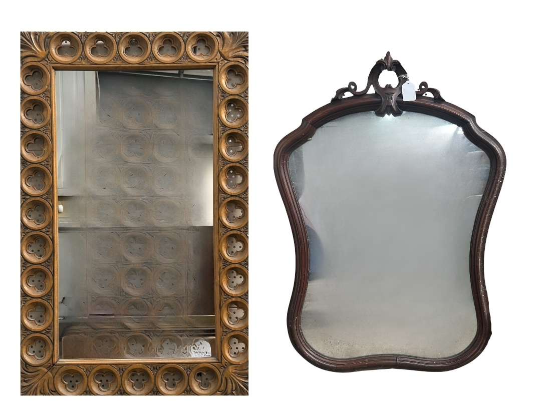 A carved beech-framed wall mirror, the frame with cut-out trefoil shapes in roundels, height 88.5cm, width 56cm, together with a 19th century rosewood framed mirror with carved shield and ribboning to the top, height 87cm (2)