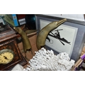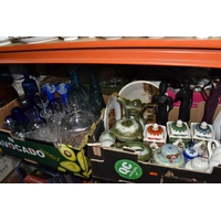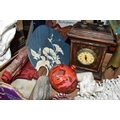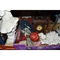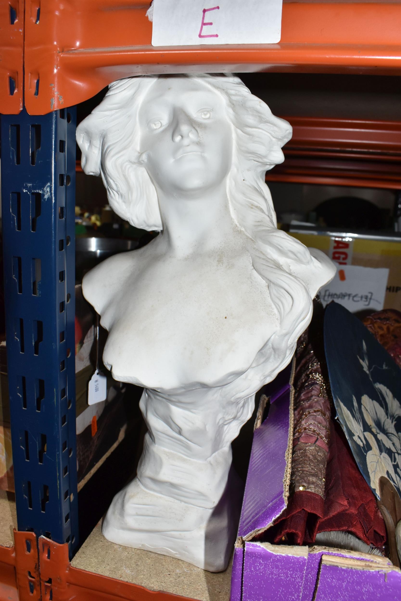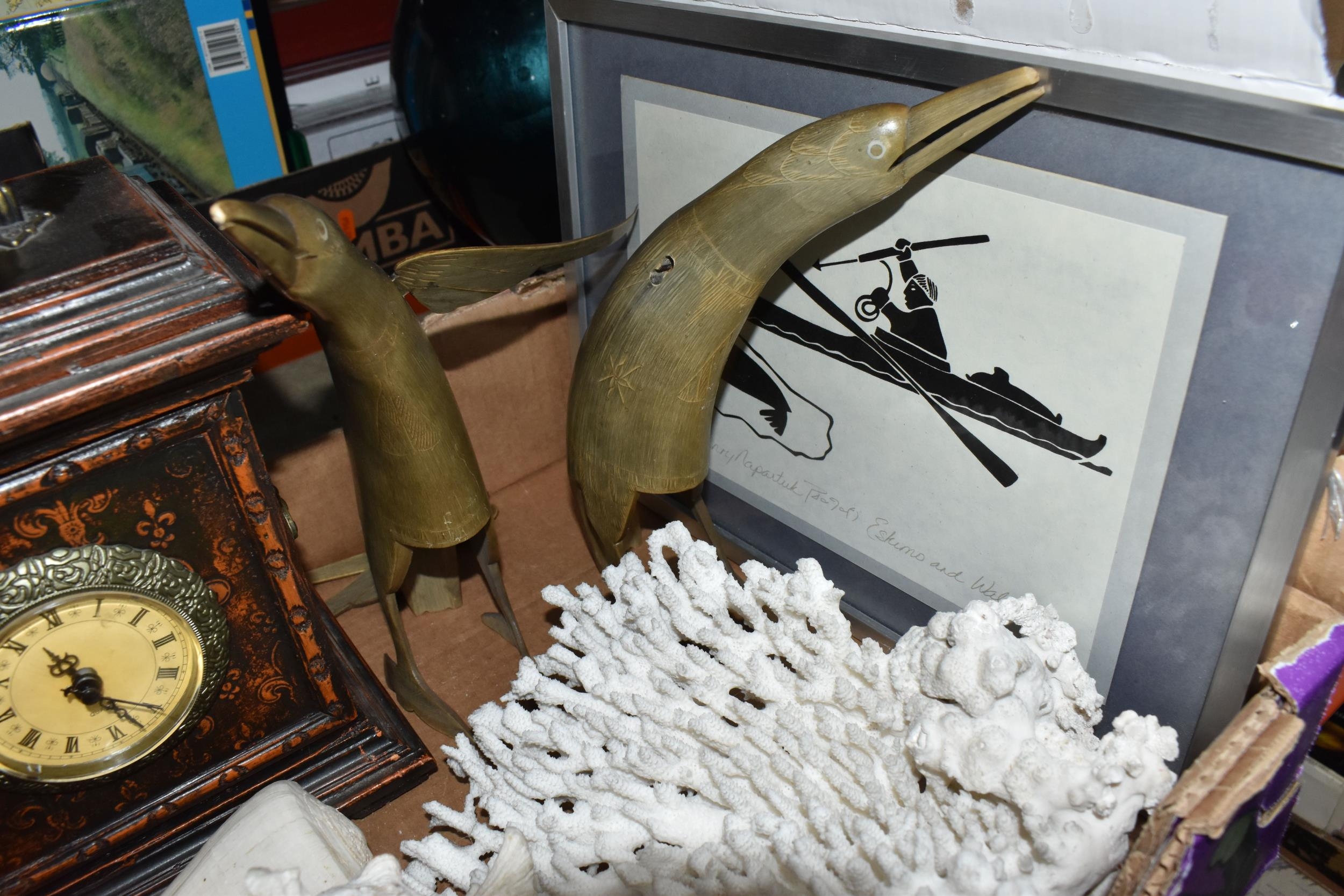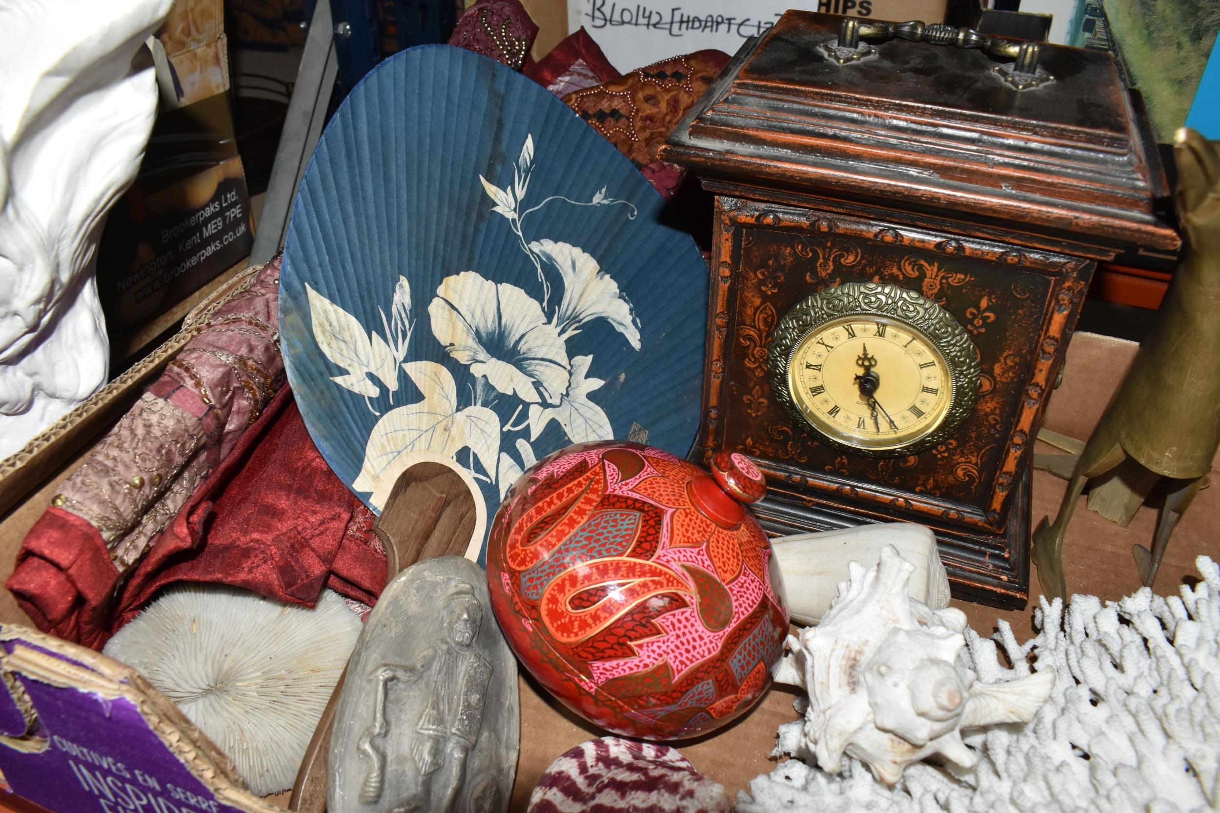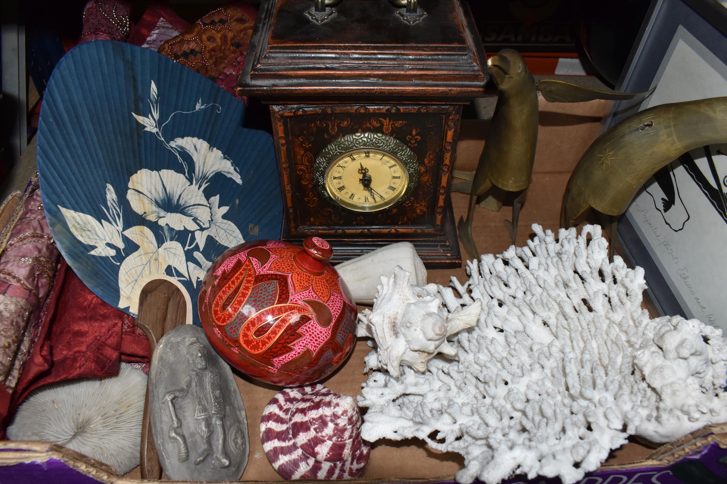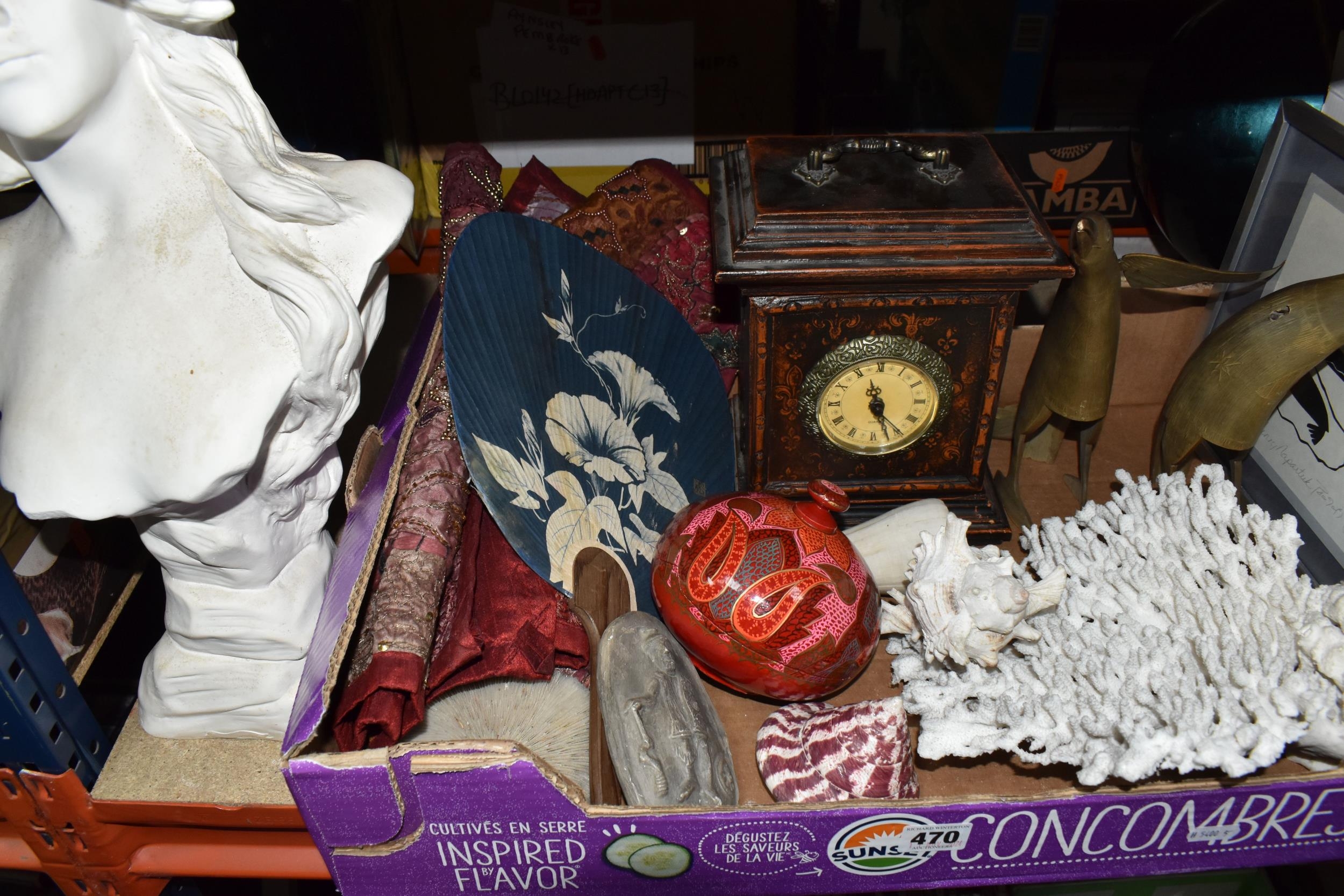 A BOX AND LOOSE SUNDRY ITEMS, to include a framed Henry Napartuk (Canada 1932 - 1985) wood block print titled 'Eskimo and Walrus', frame size 24.5cm x 35cm, image size 16.5cm x 24cm, two carved horn birds (with loose wings, one missing one of its wings), an oriental fan decorated with flowers, an Indian beaded table runner, a chalkware female bust, height 46cm, a modern clock/storage box, a papier mâché covered sweet pot, seashells, etc (1 box + loose) (sd)