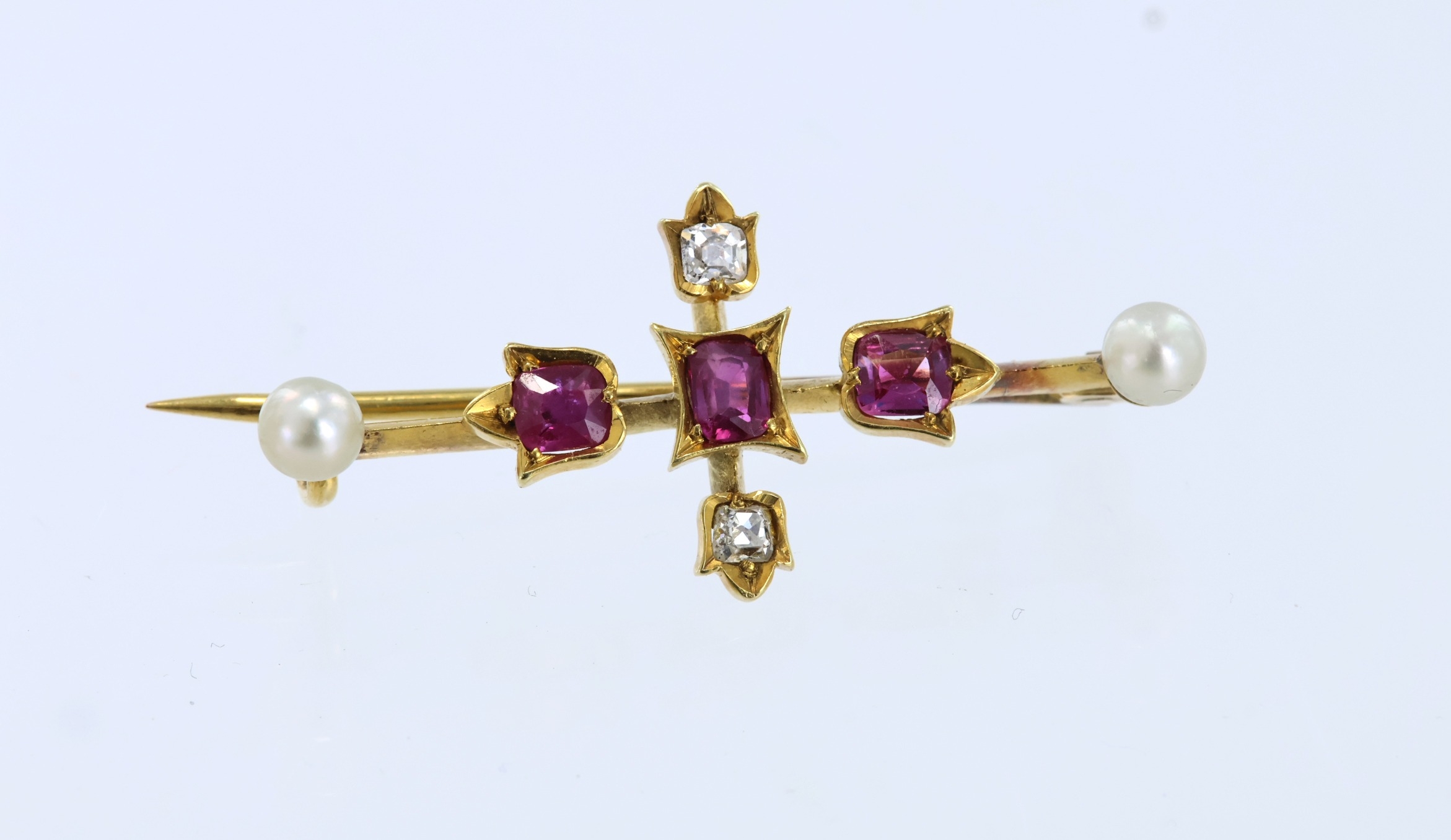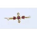 Yellow metal (tests approx. 15ct) ruby diamond and pearl brooch, three cushion shaped rubies approx. 4mm x 3mm, two cushion shaped old cut diamonds and two pearls, total diamond weight approx. 0.10ct, length 40mm, weight 3.7g