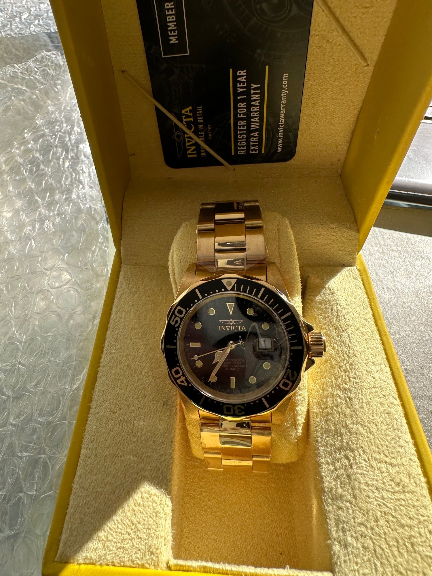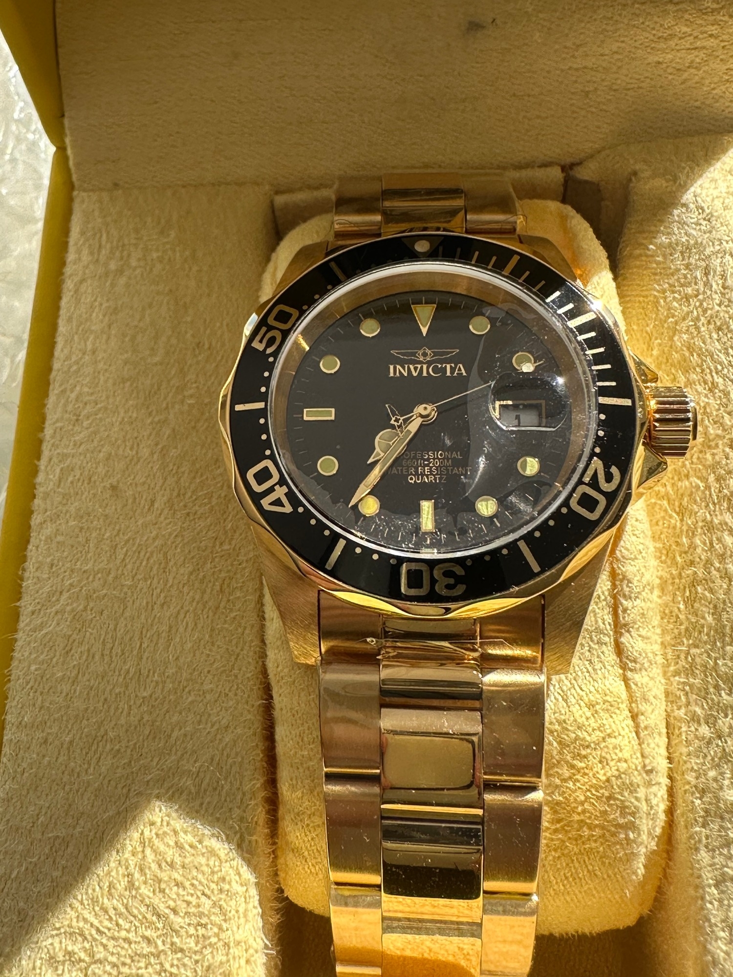 INVICTA Professional Diver watch, 200m black face and gold stainless steel bracelet, boxed, Swiss movement