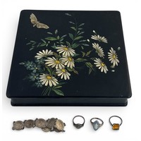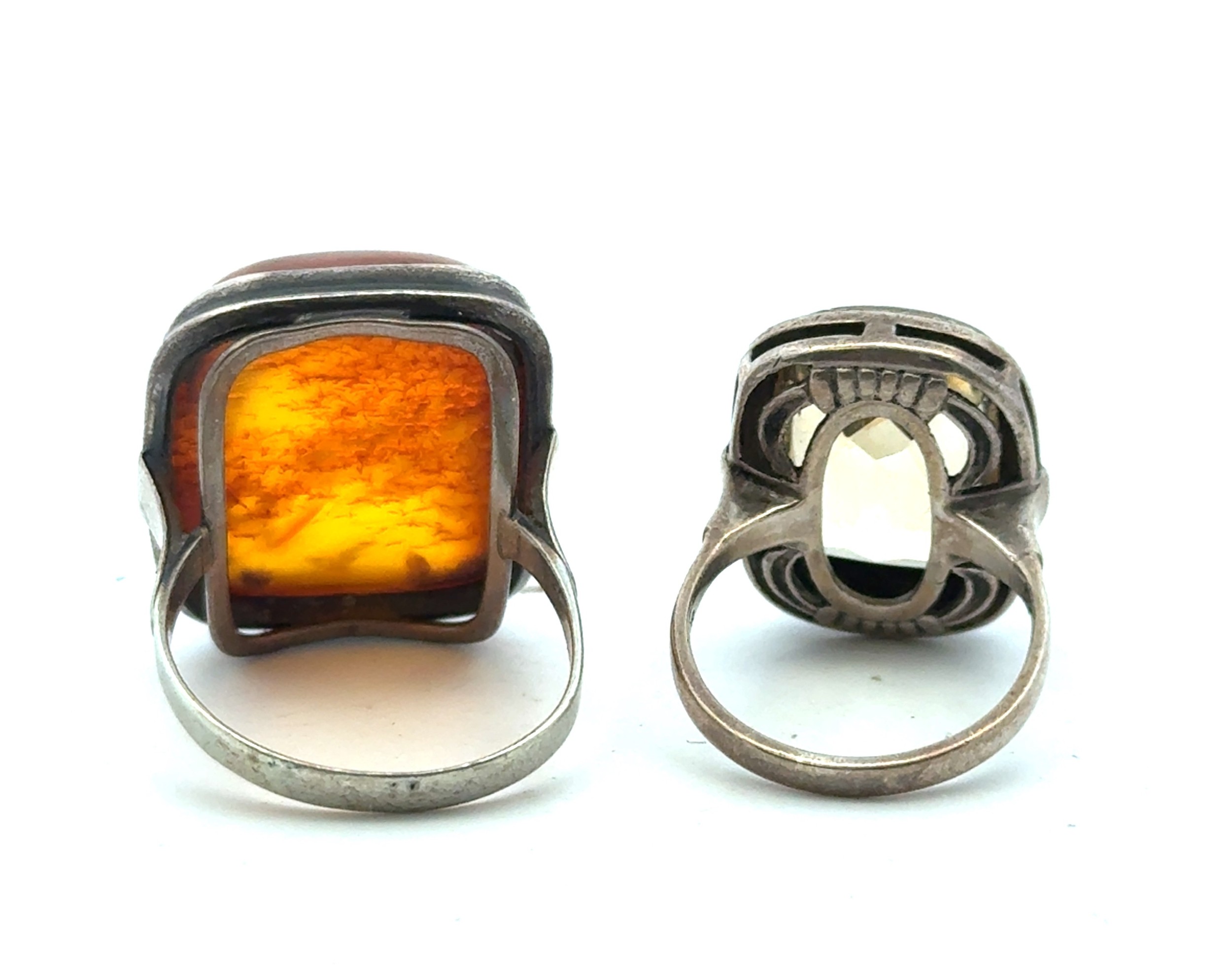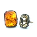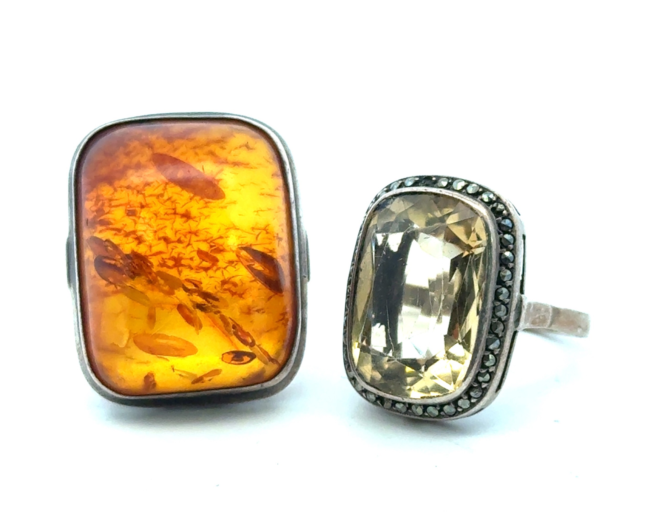 Four jewellery items to include two rings and two necklaces: a silver and quartz ring and a silver and amber dress ring and a vintage paste stone gilt metal necklace. Together with a Victorian jet pendant necklace, the 4.5cm pendant with vacant glazed compartment to one side and plain to reverse. On a 44" jet chain comprised of large oval links. Large chip to pendant.