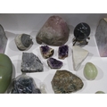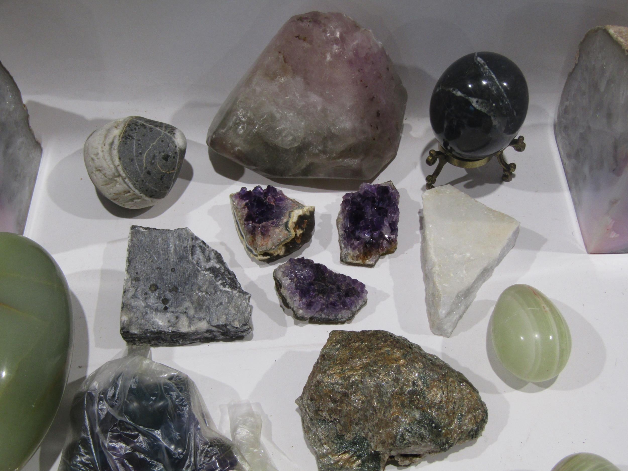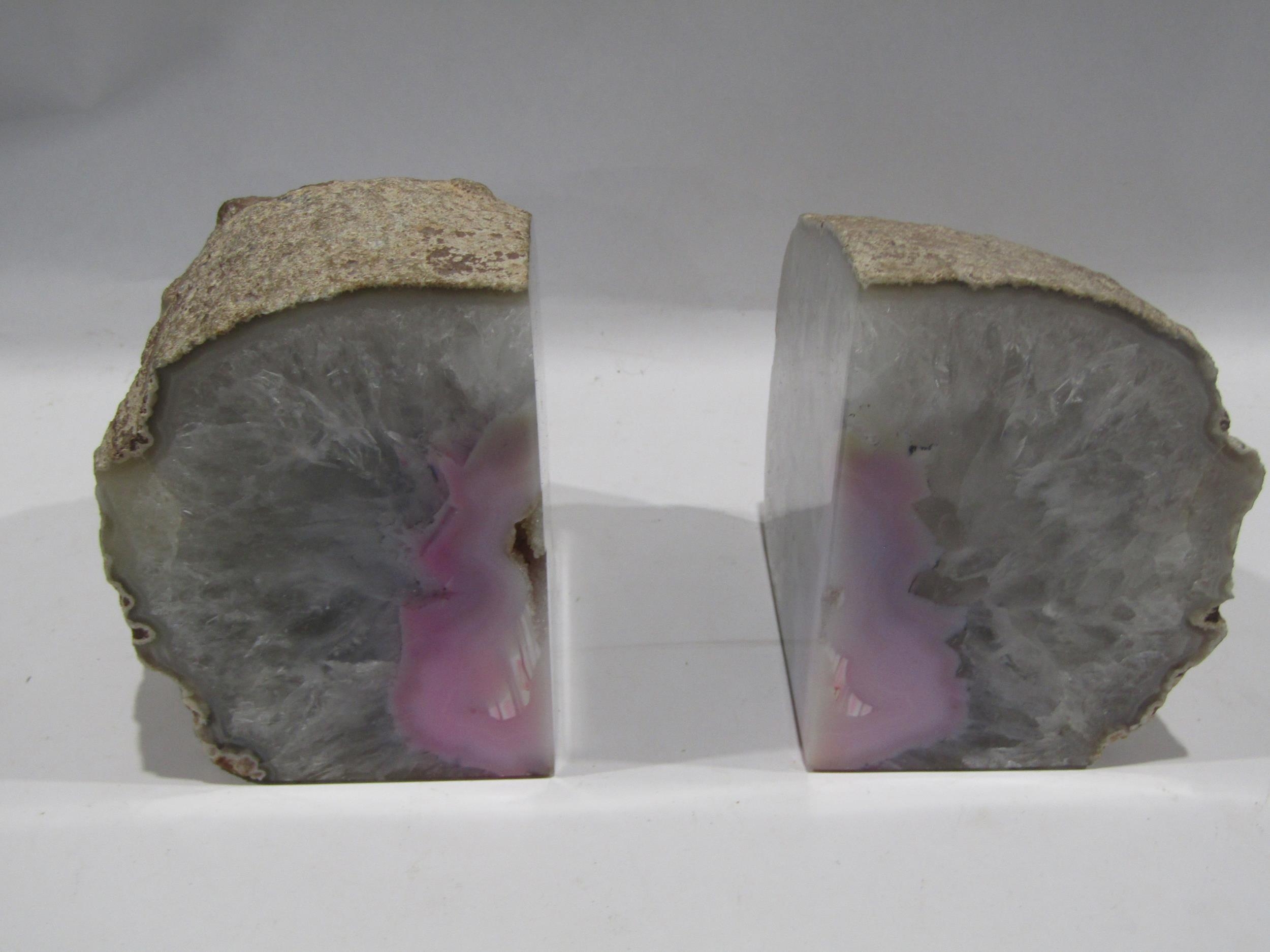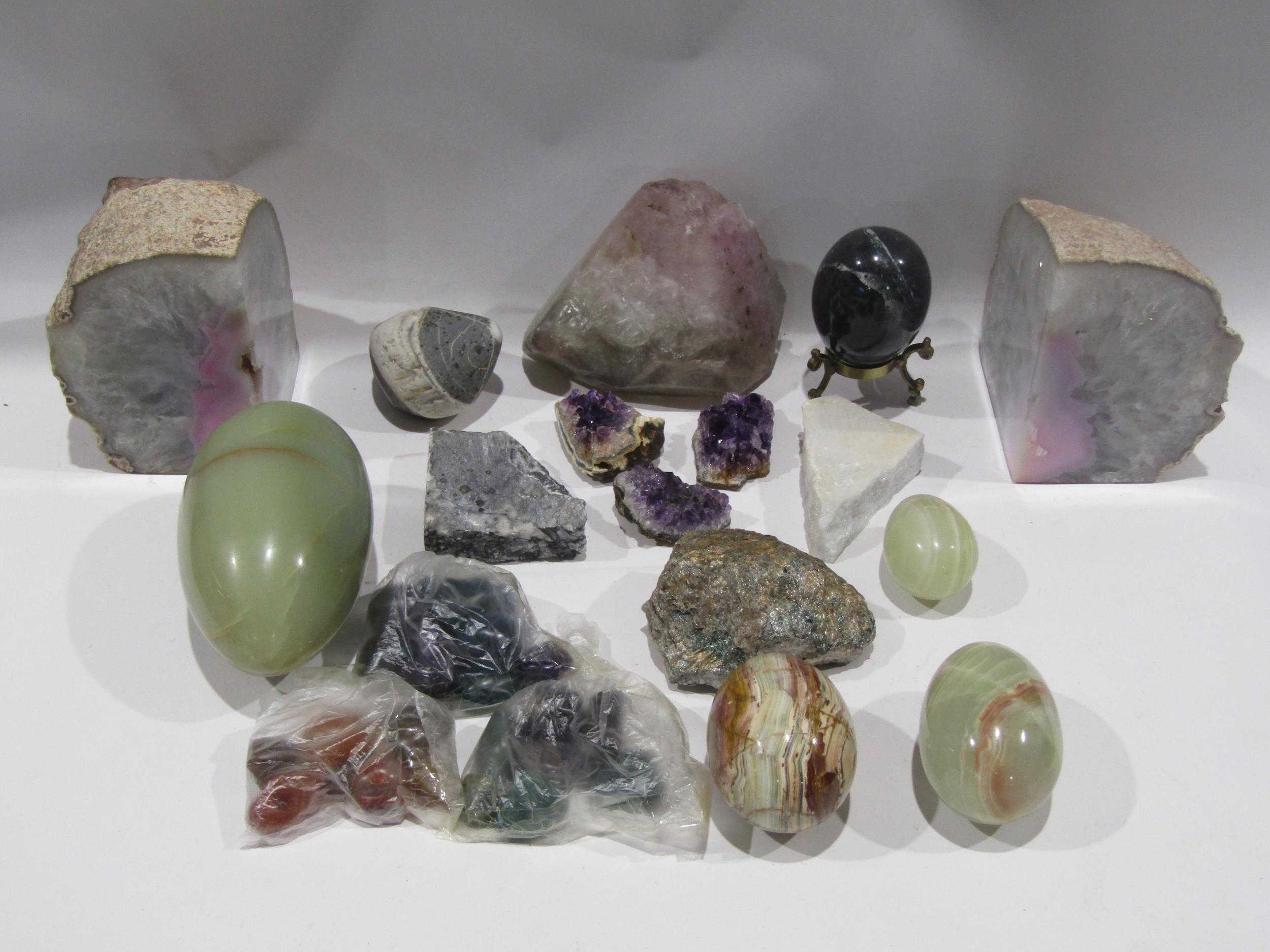 A pair of crystal geode book ends and various hardstone amethyst, marble, onyx etc.