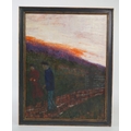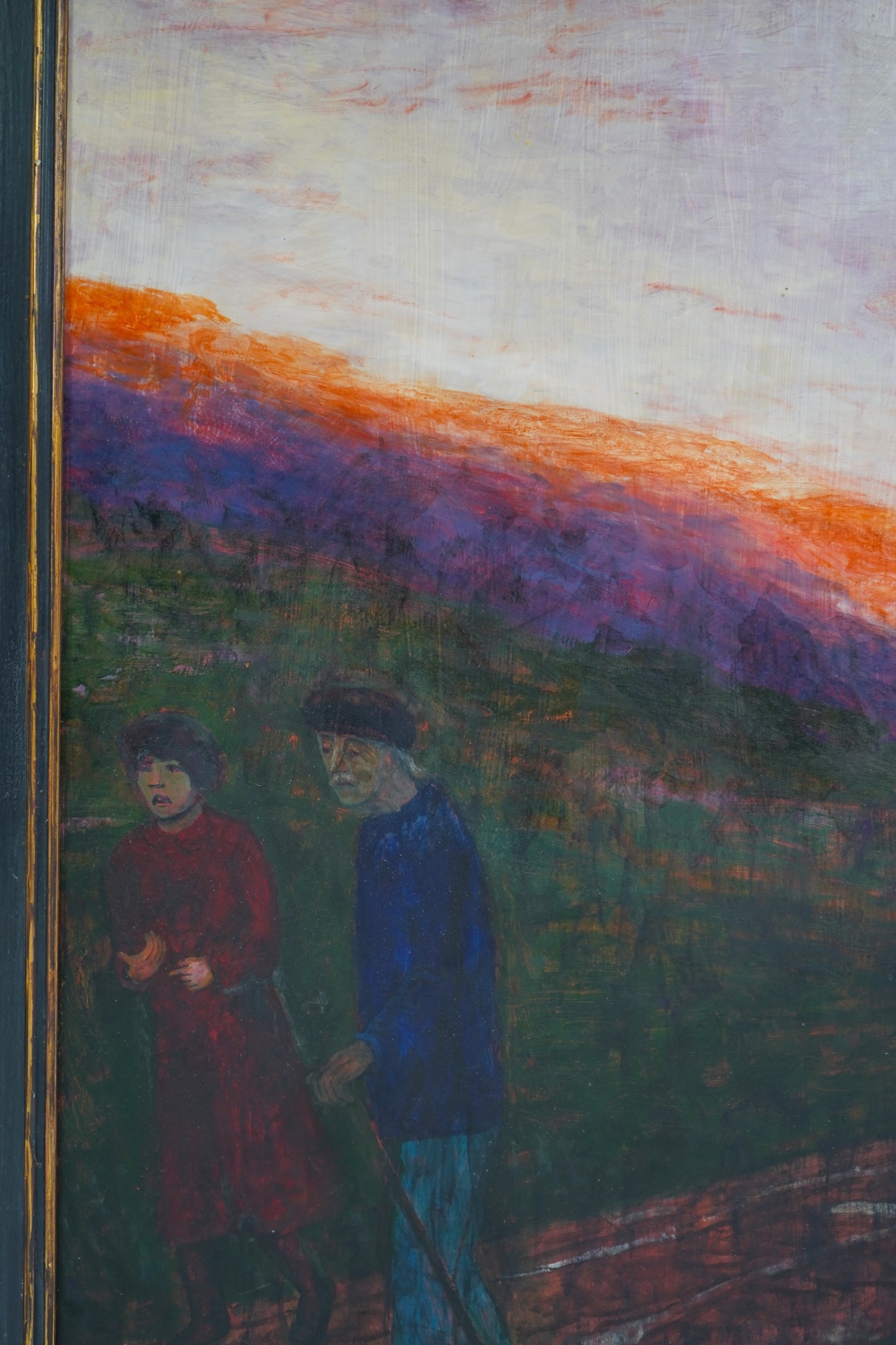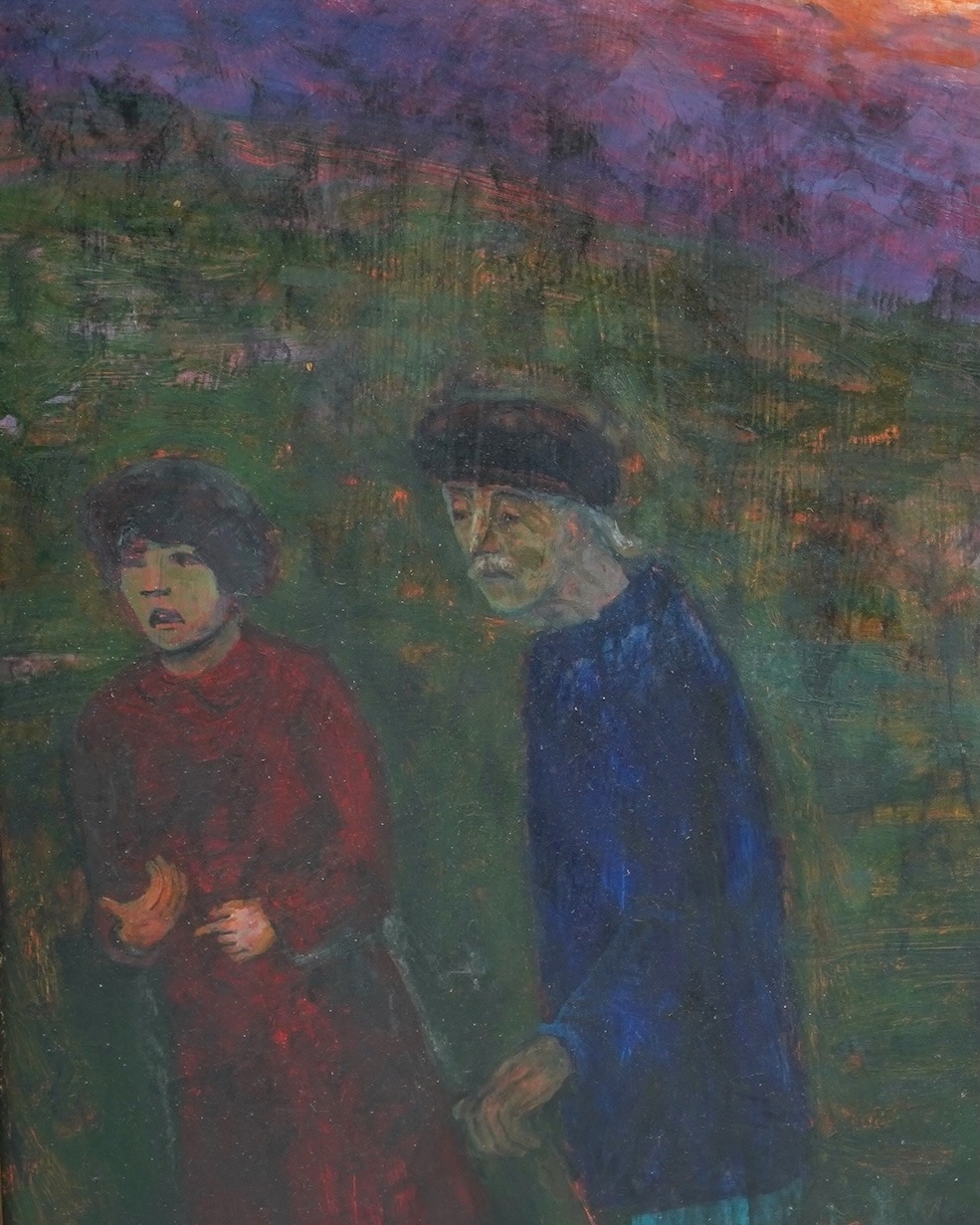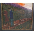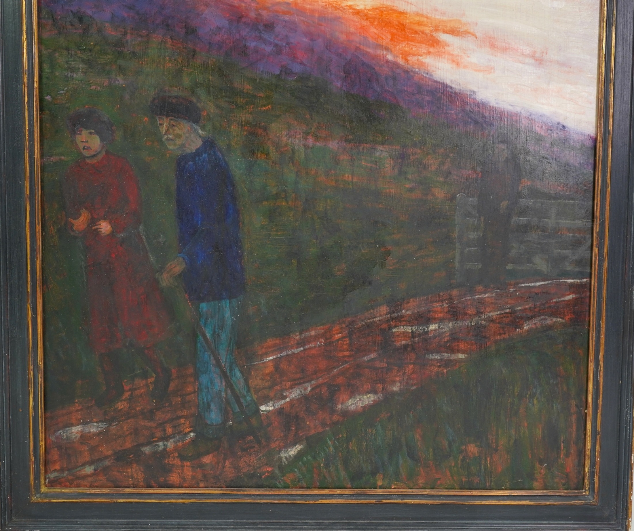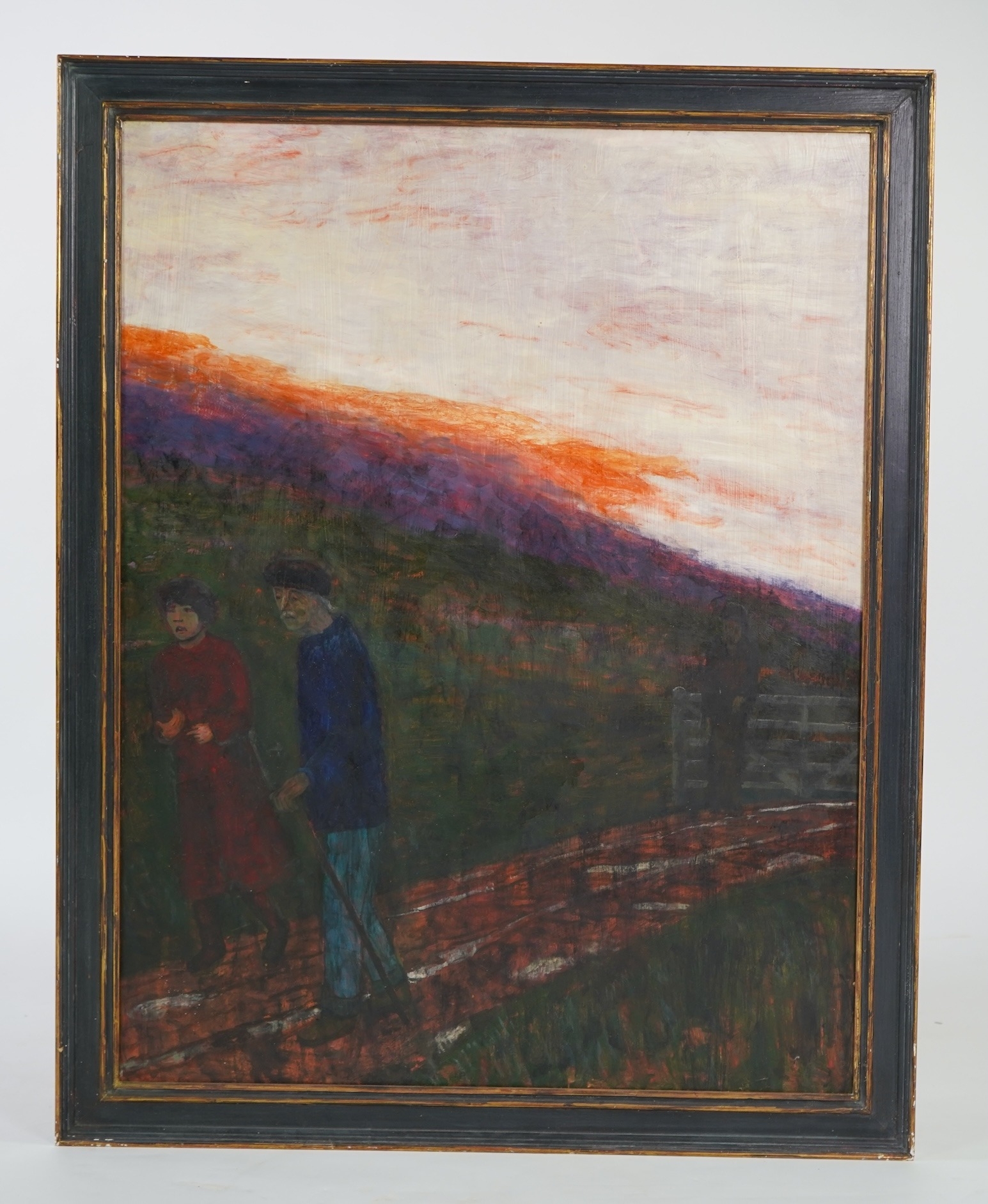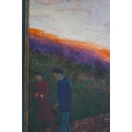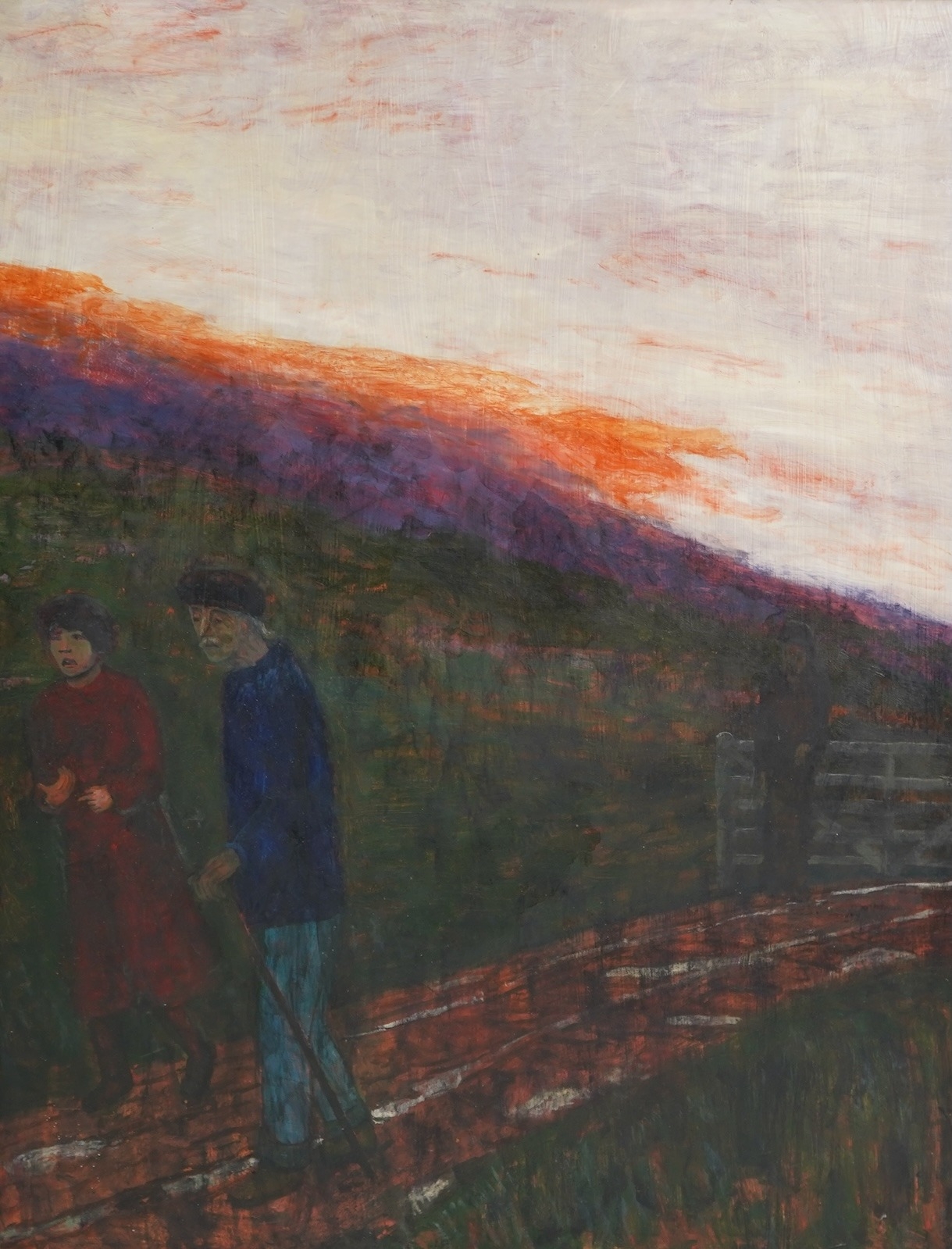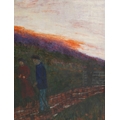figures walking along a country path at sunset,