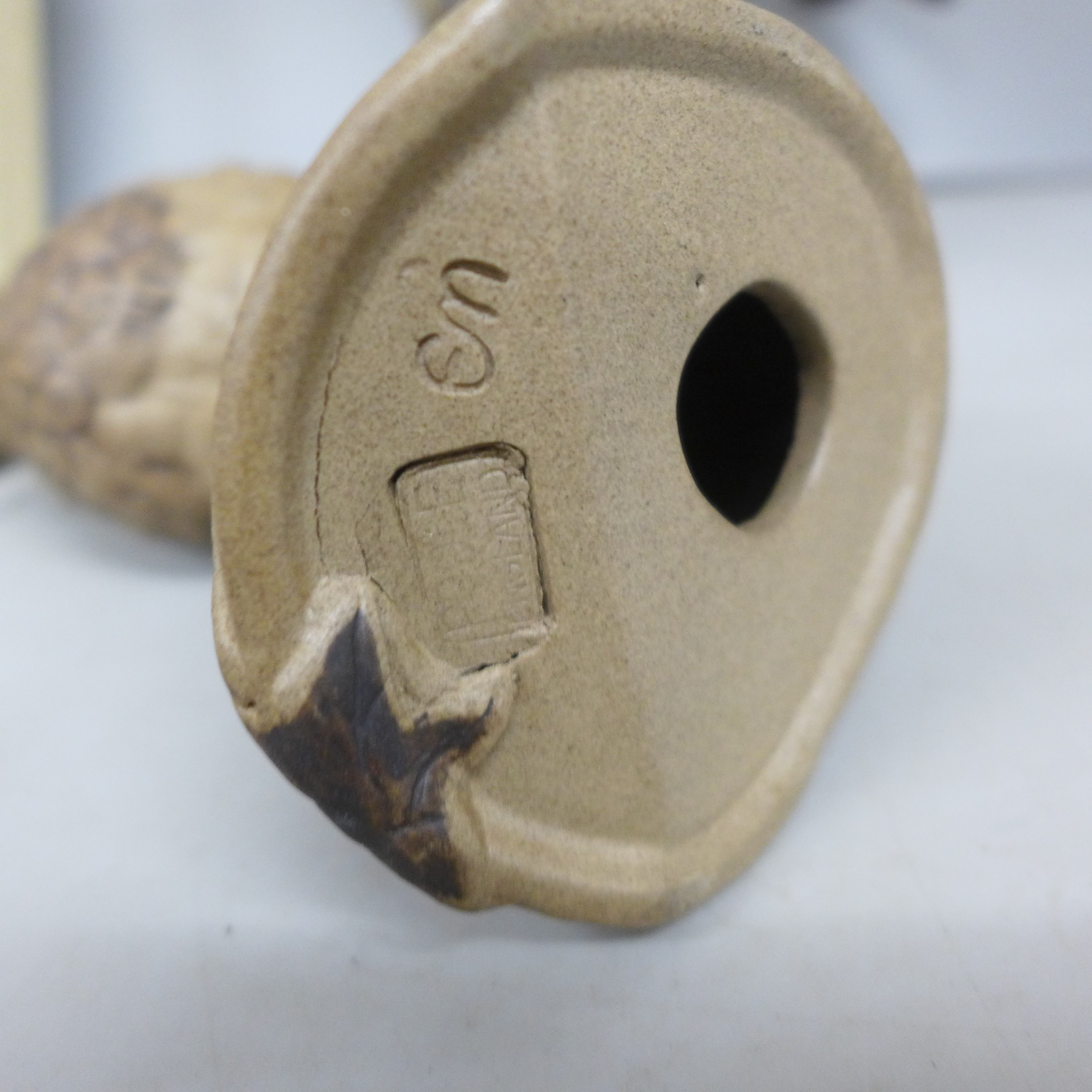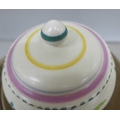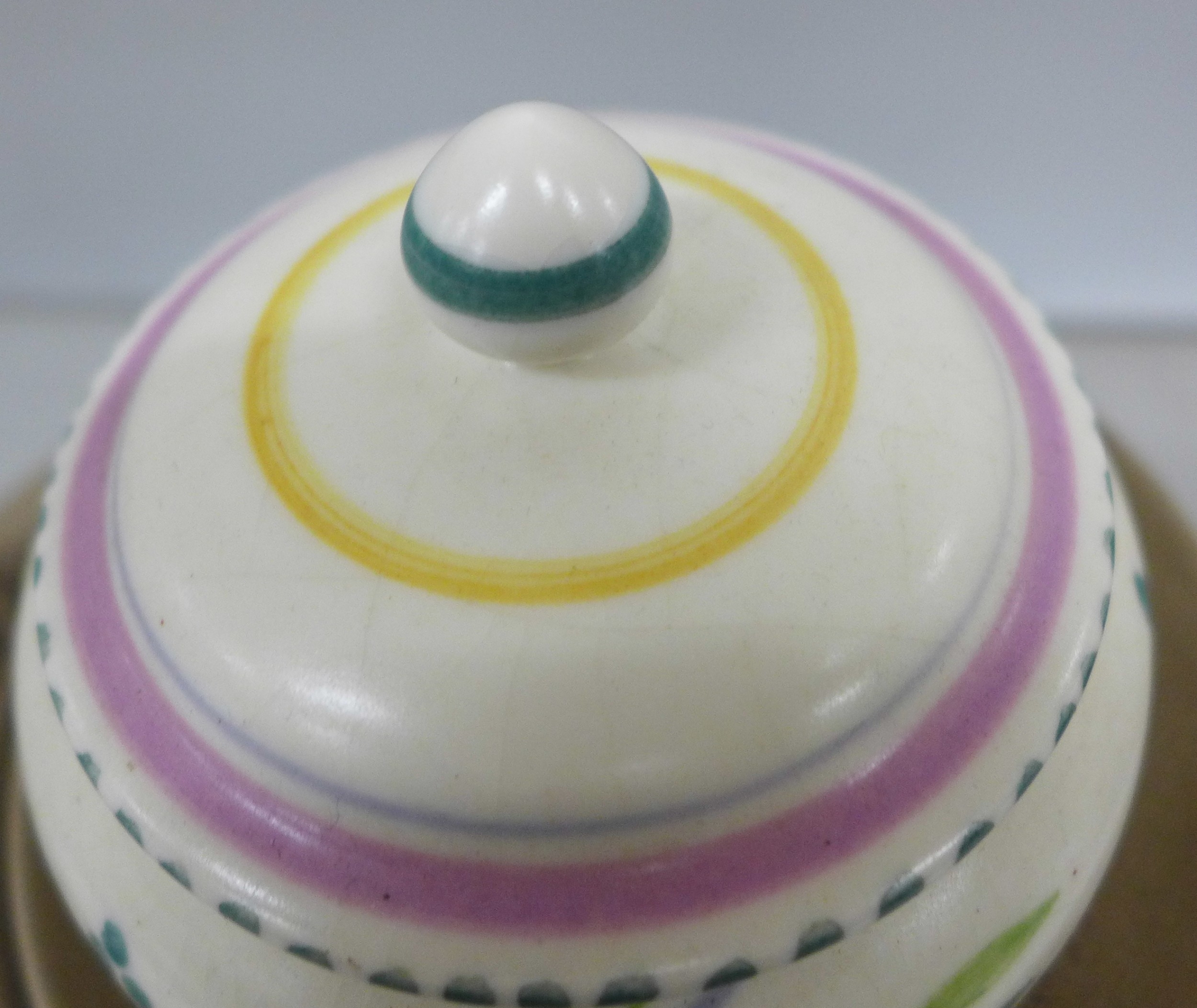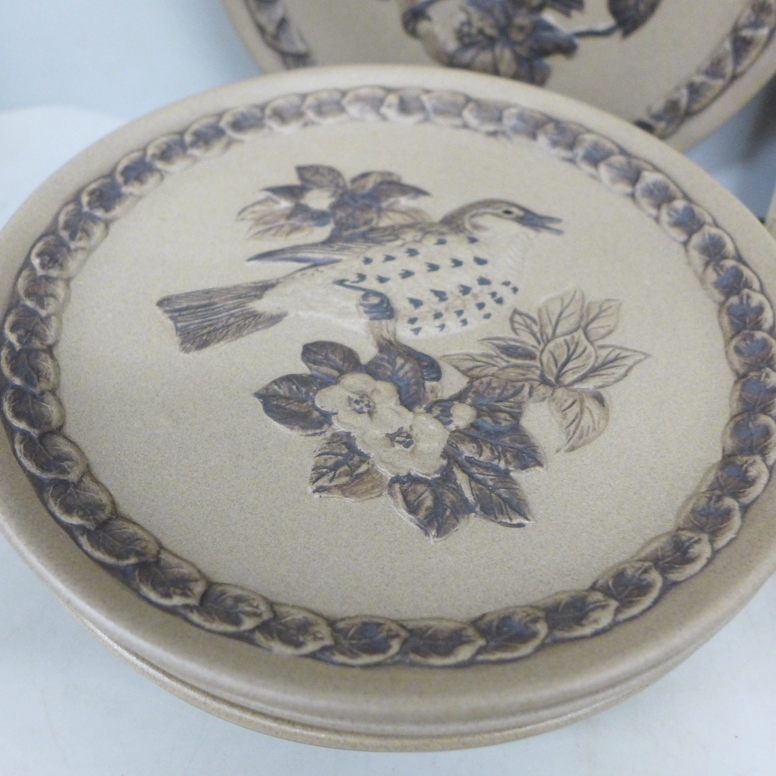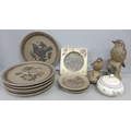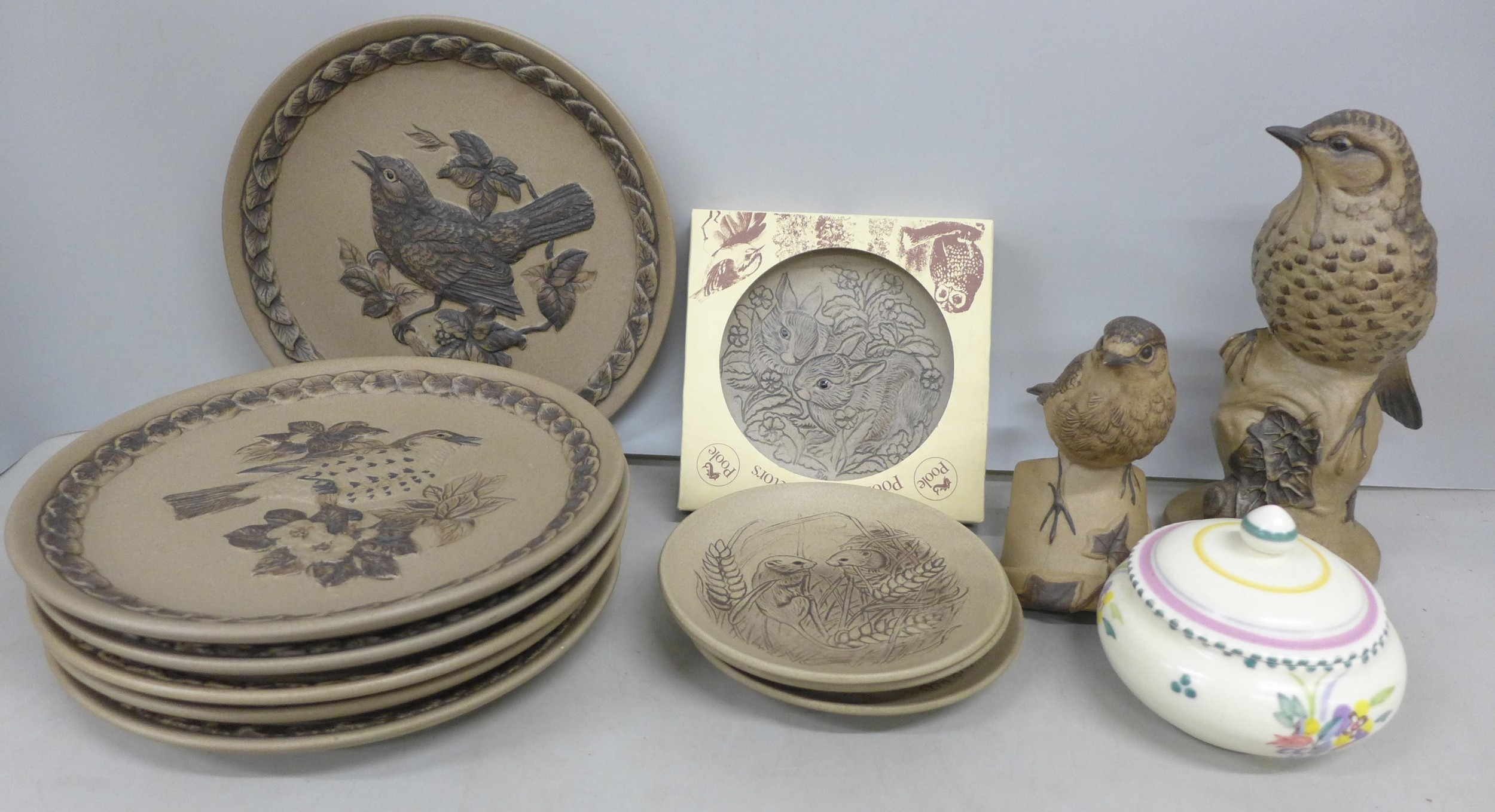 A collection of Poole pottery including two bird figures and a lidded pot