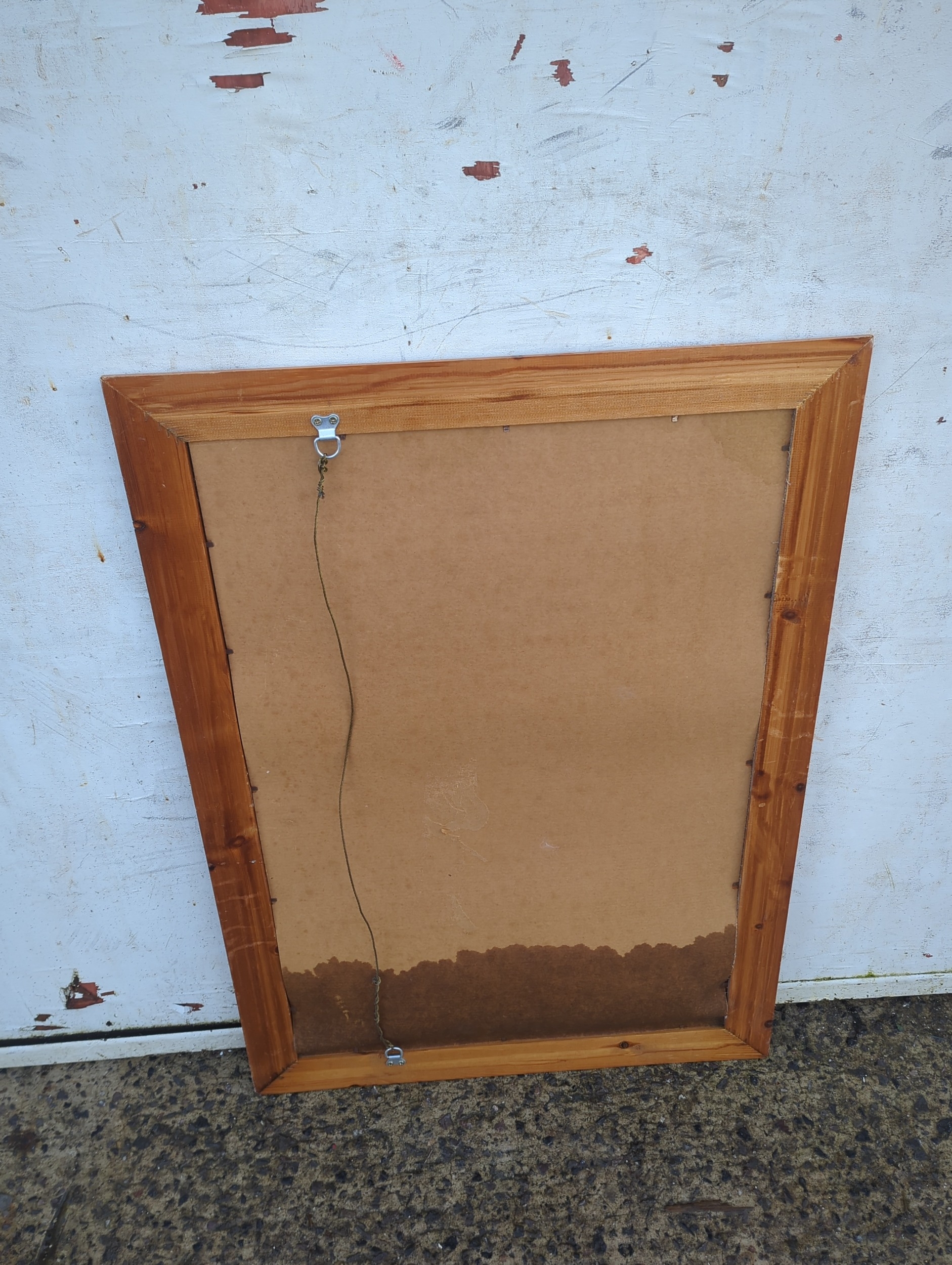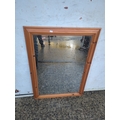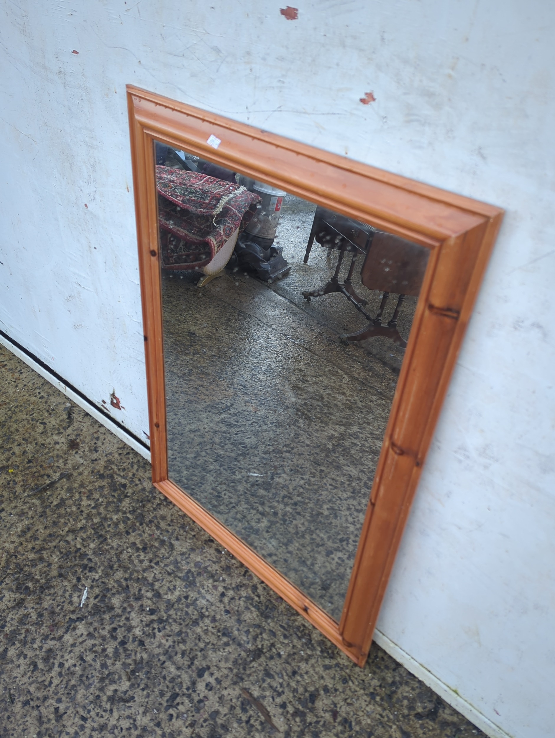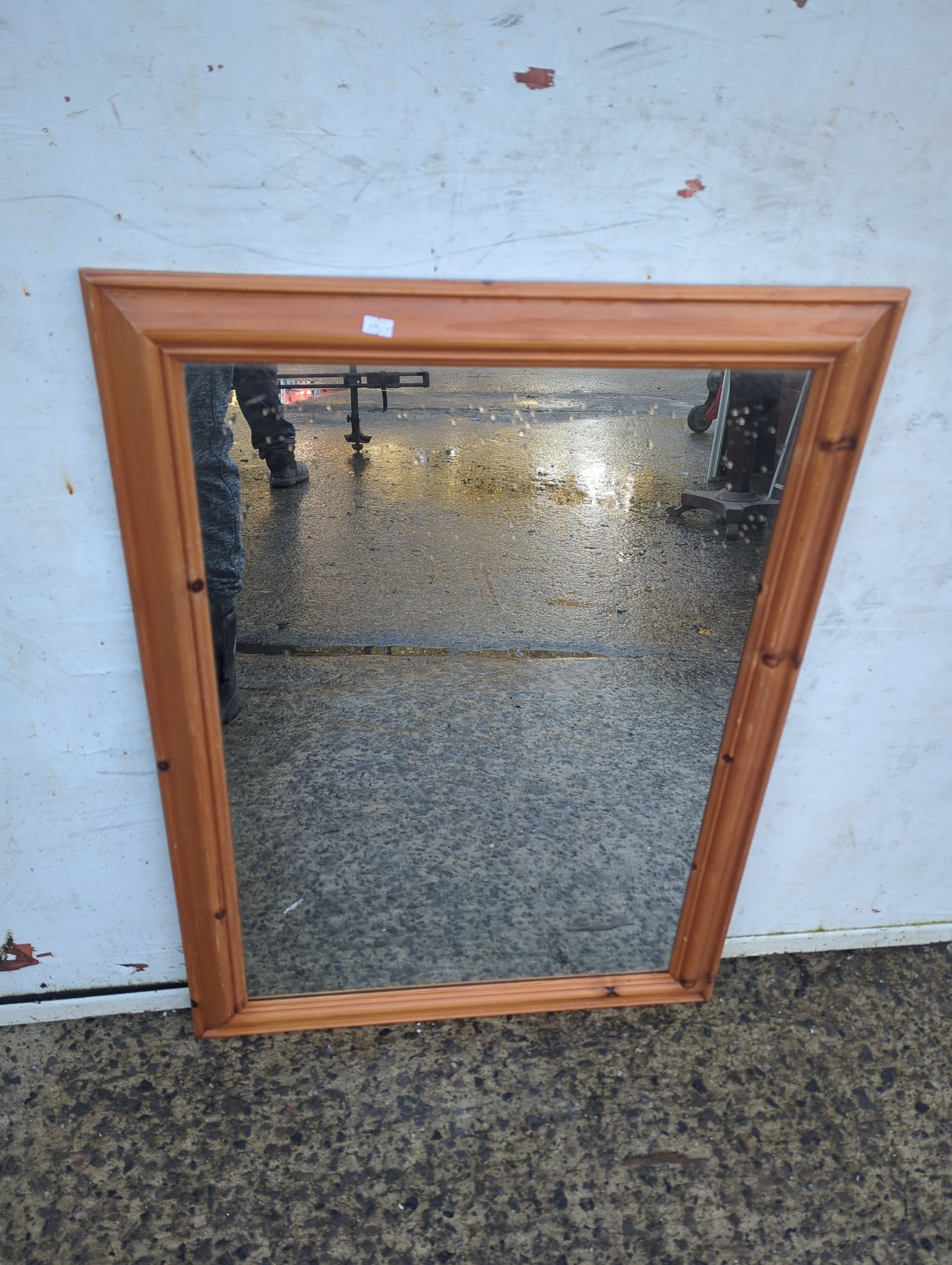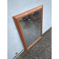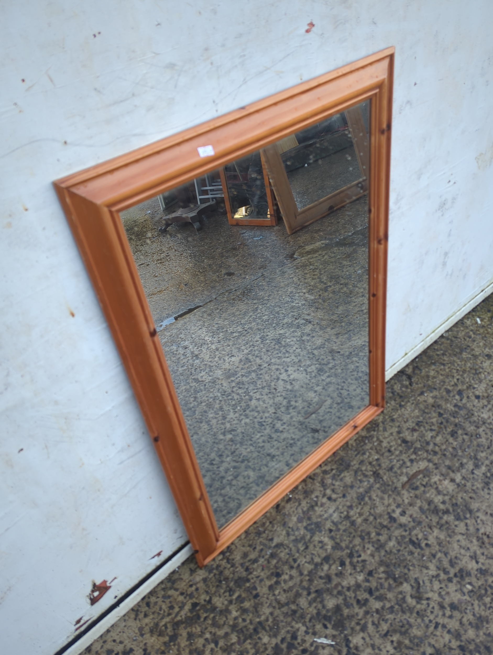 This is a wall mirror with a simple and elegant pine frame, suitable for both contemporary and traditional interiors. The mirror is rectangular and features a natural wood finish that highlights its rustic charm. It can be easily hung on a wall using the attached wire and hooks on the back.