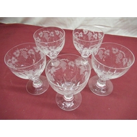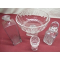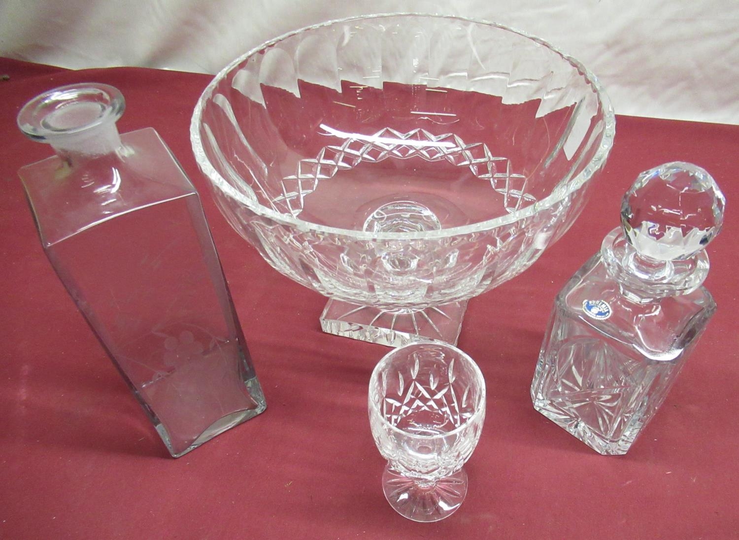 Claire Sweeney Collection - Large glass pedestal fruit bowl, with facet and hobnail decoration on faceted column and star square base D29cm H21cm, a small bohemian glass whisky decanter and stopper H23cm, a clear tall square decanter decorated with grapes H27cm and a wine glass H12cm (4)