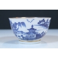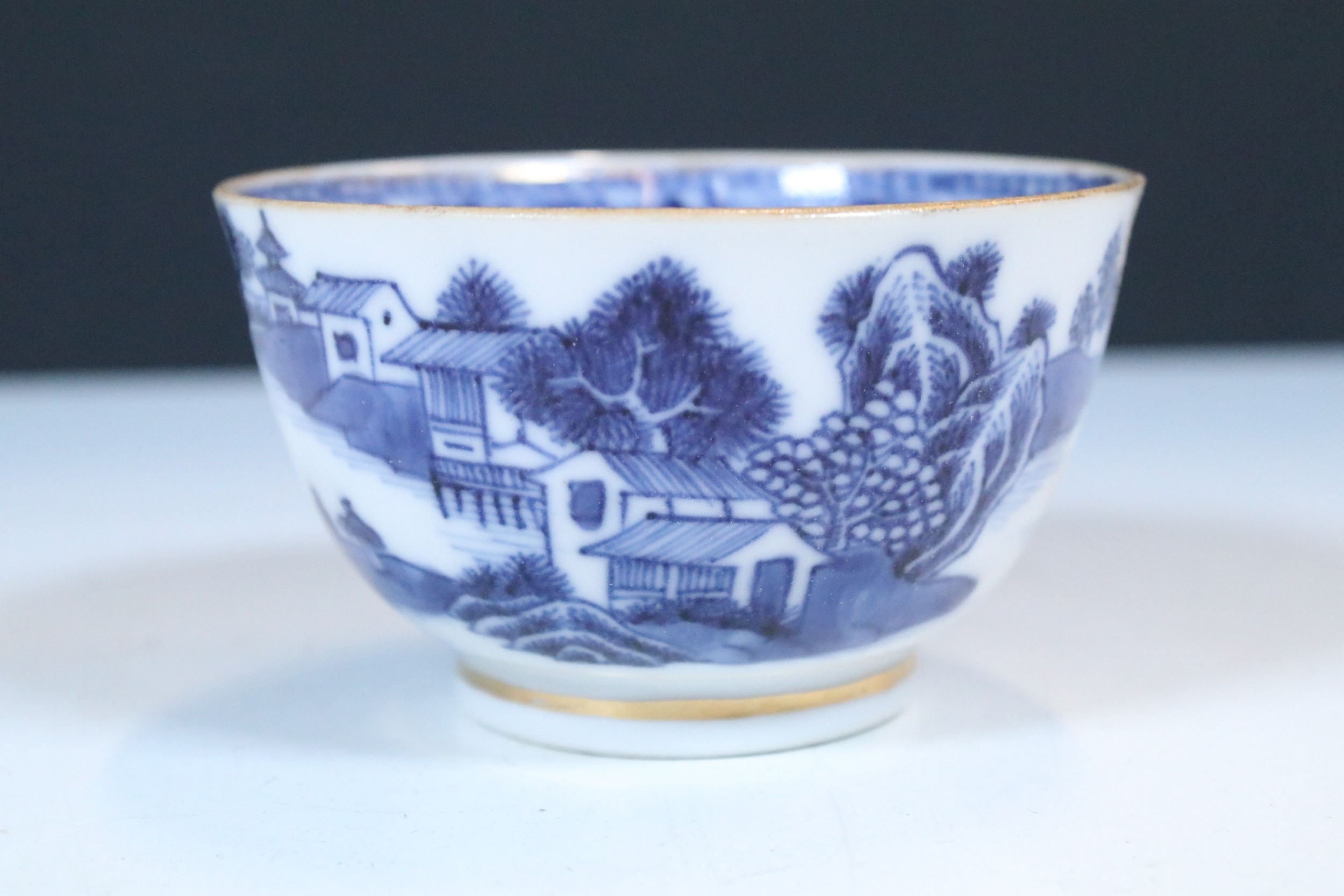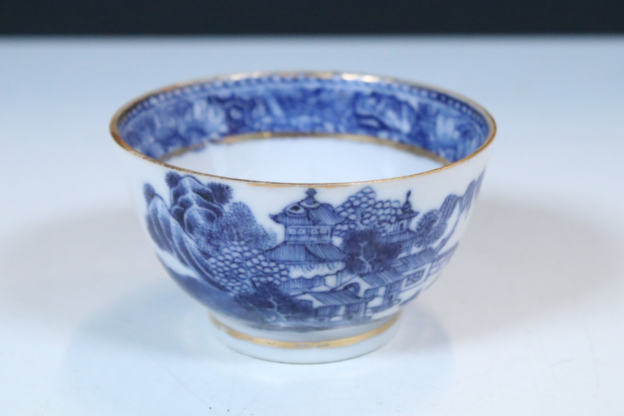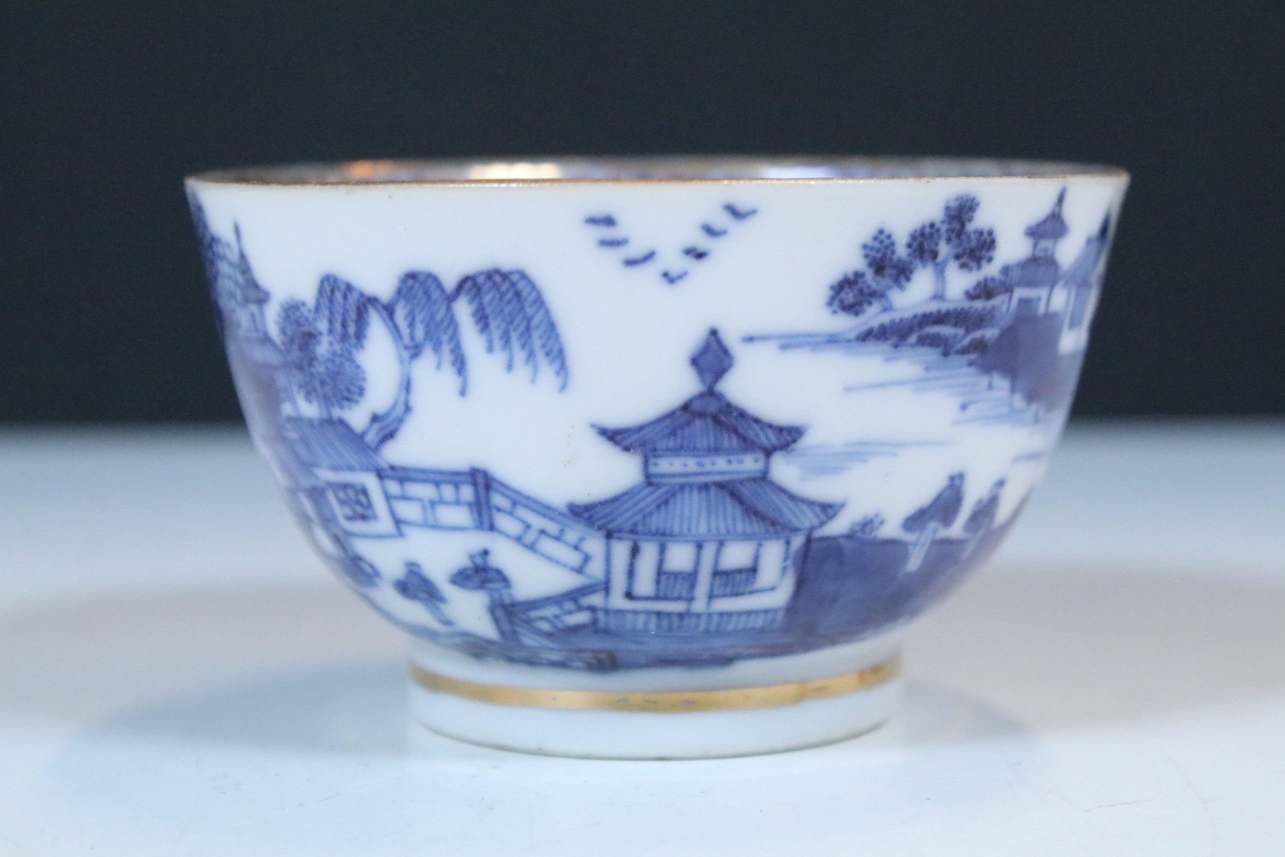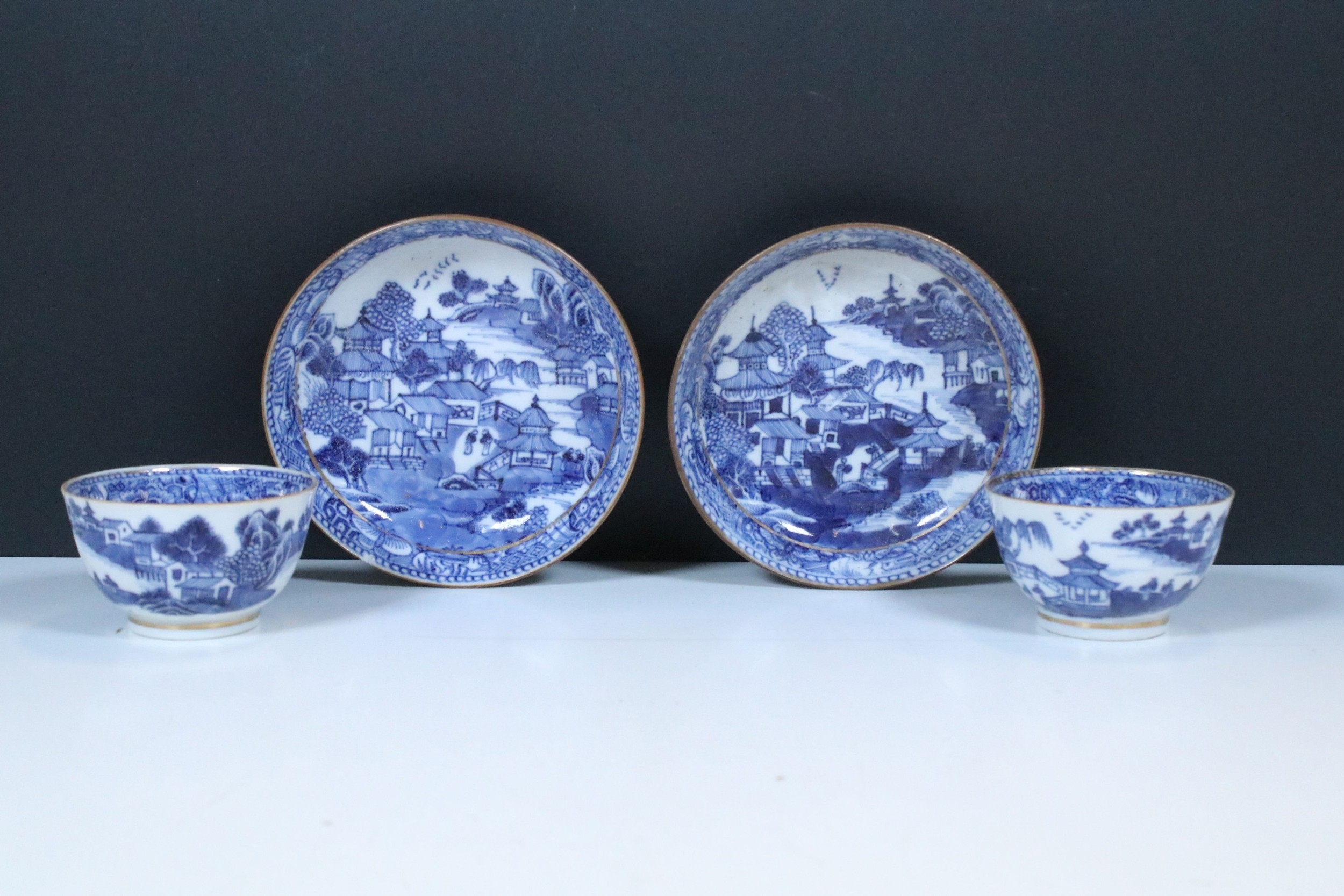 Pair of Chinese blue and white tea bowls and saucers, decorated finely with pagodas and willows, gilded to the rim, the saucer D 12.5cm (4)
