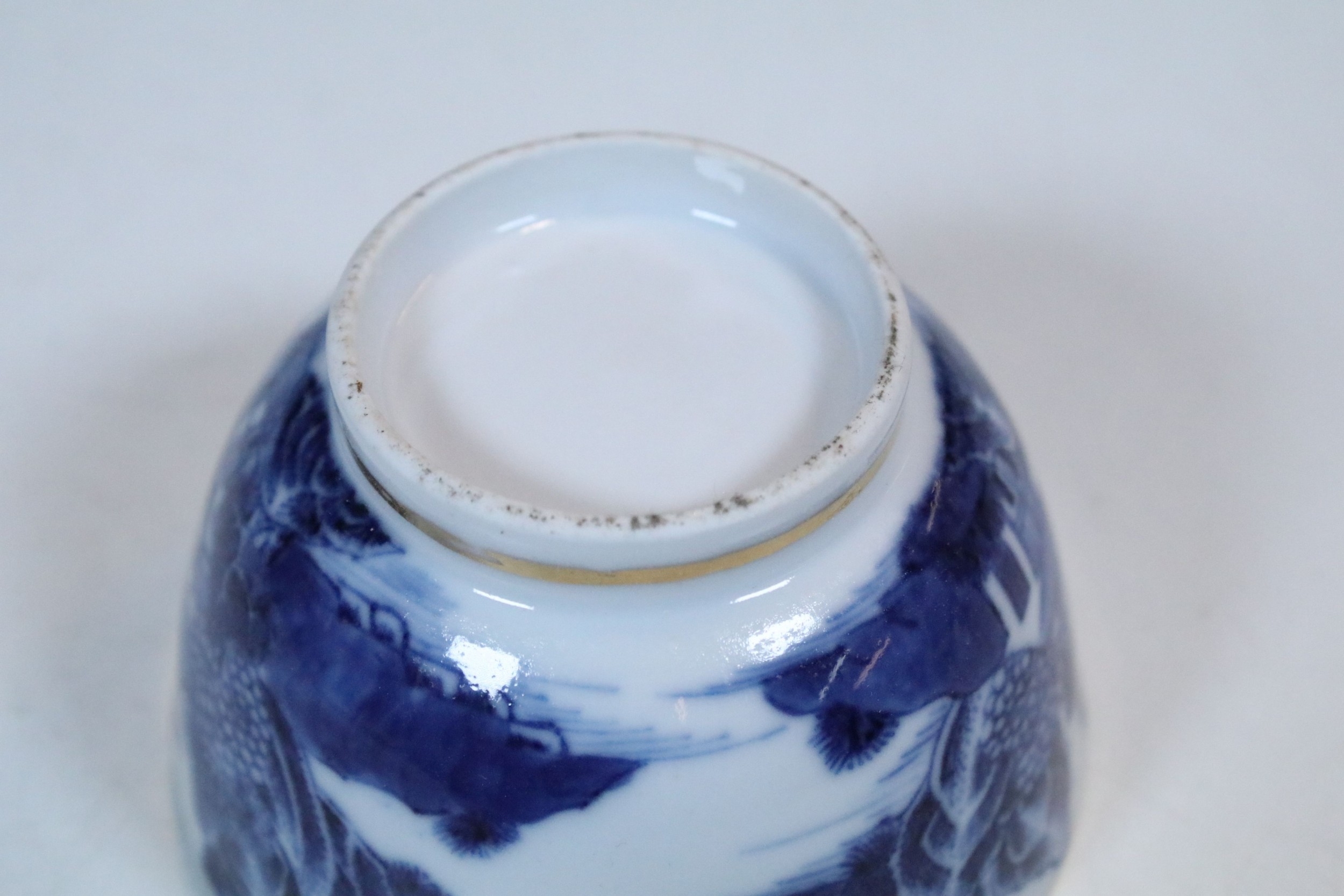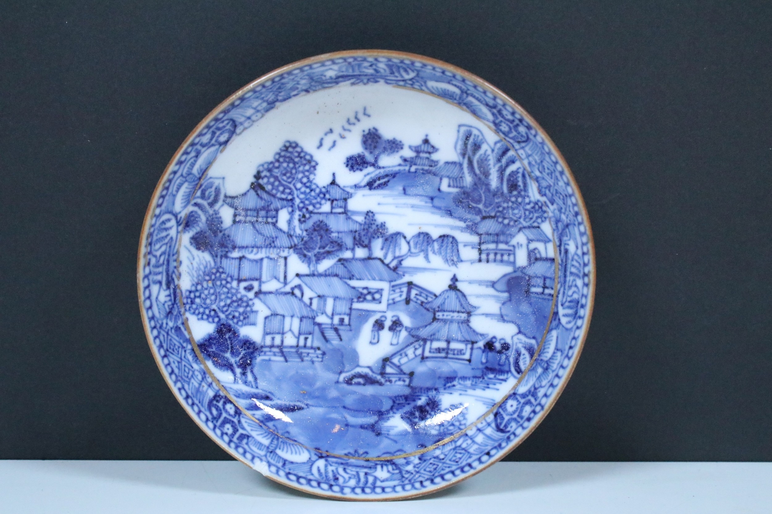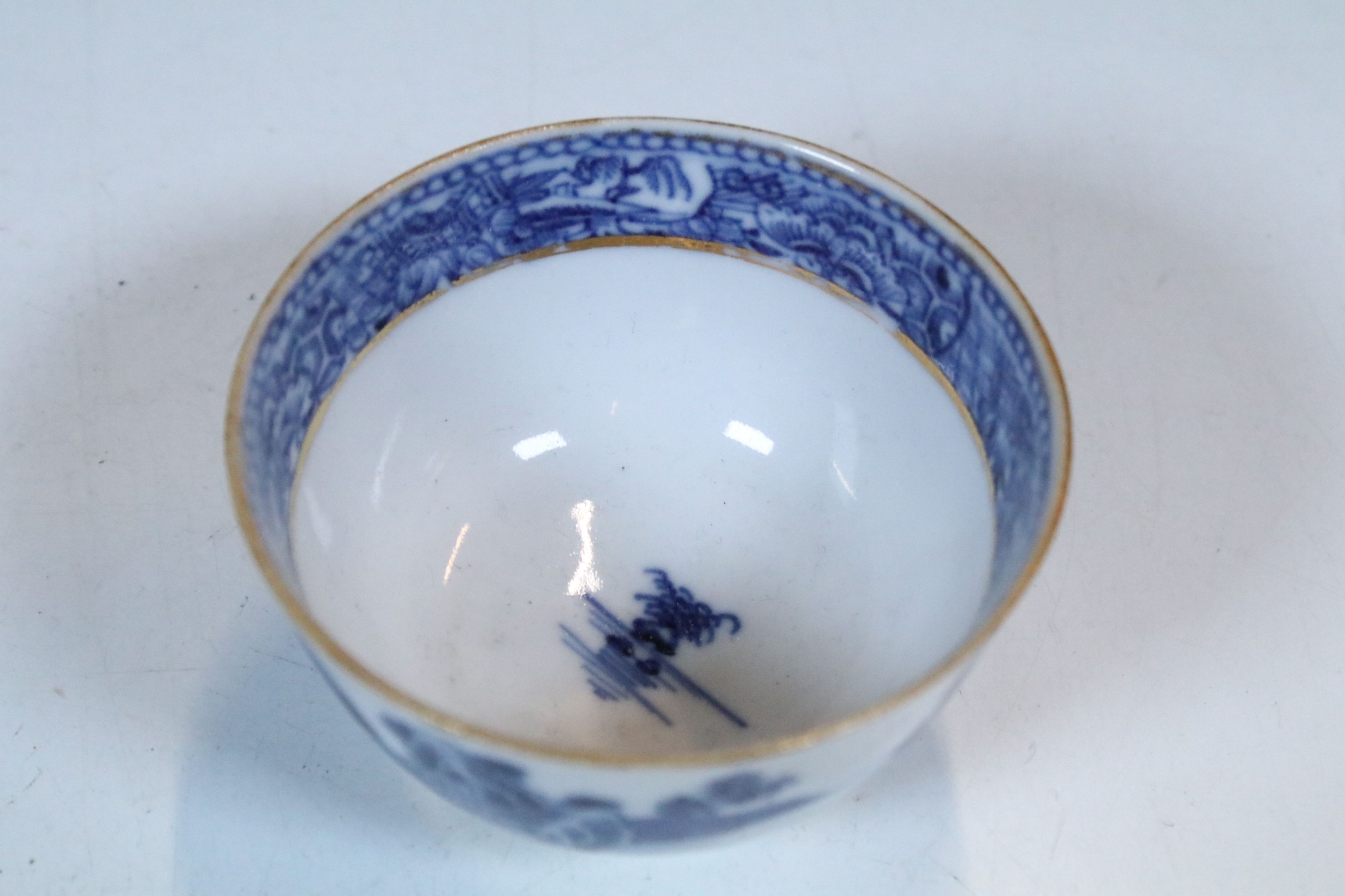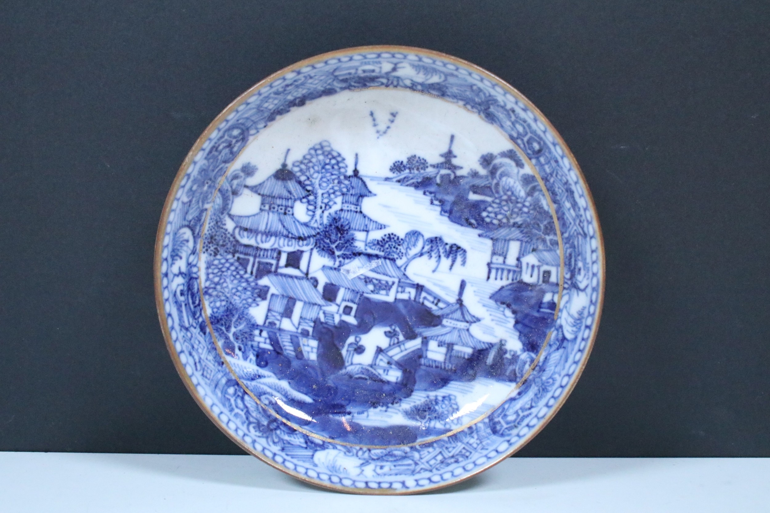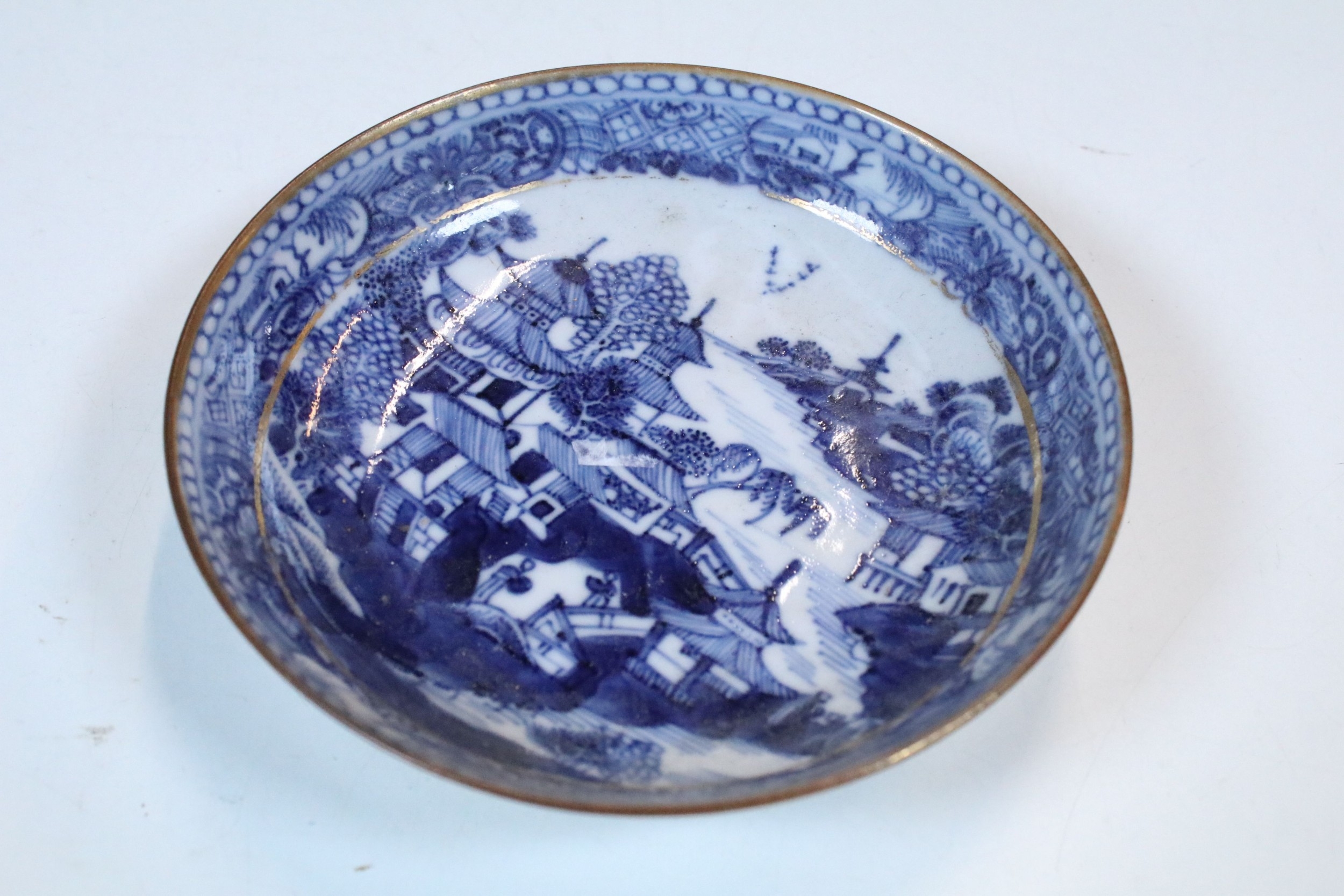 Pair of Chinese blue and white tea bowls and saucers, decorated finely with pagodas and willows, gilded to the rim, the saucer D 12.5cm (4)