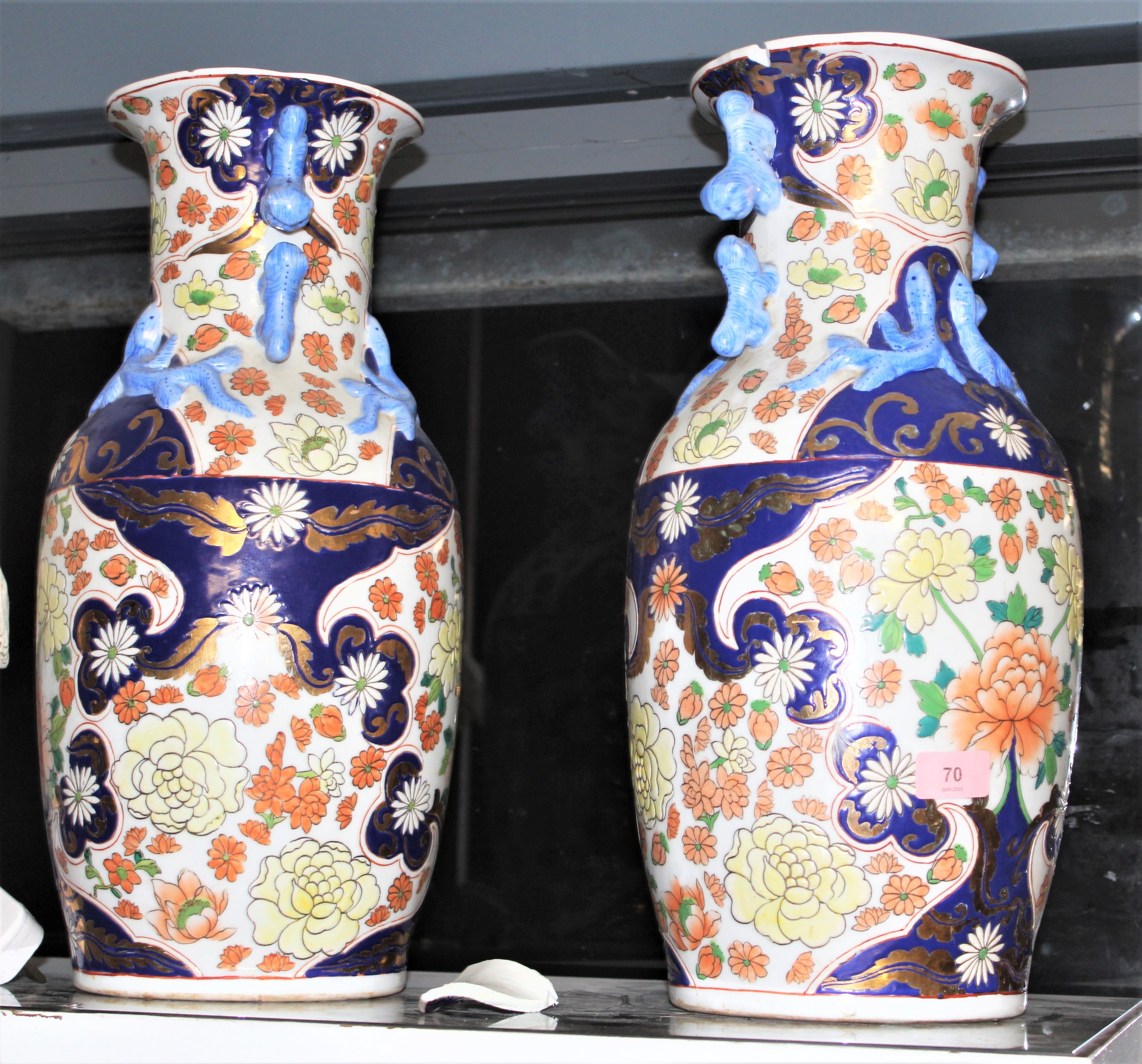 Pair of Tall "Chinese" Jars having Enamel and Gilt Decoration (Rims of Both have Breaks - Pieces available)