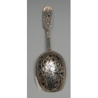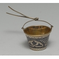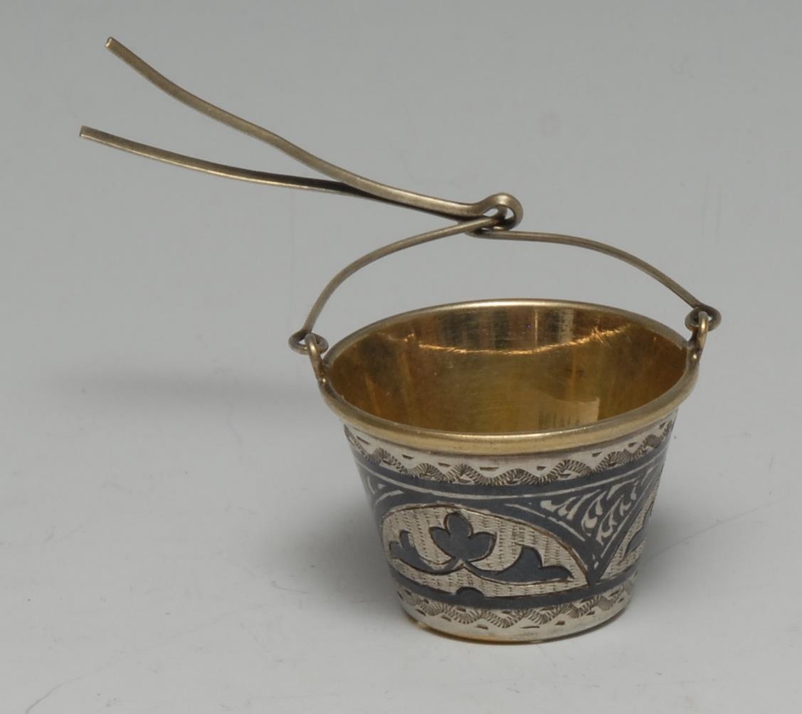A Russian silver and niello bucket shaped tea strainer, gilt interior, 2.5cm high, early 20th century