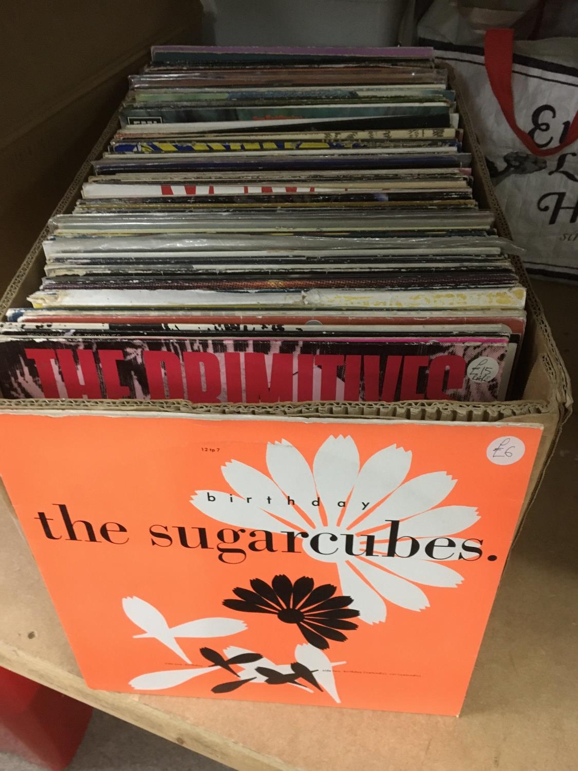 A box if LPs by various artists including Jefferson Airplane, Deep Purple and others.
