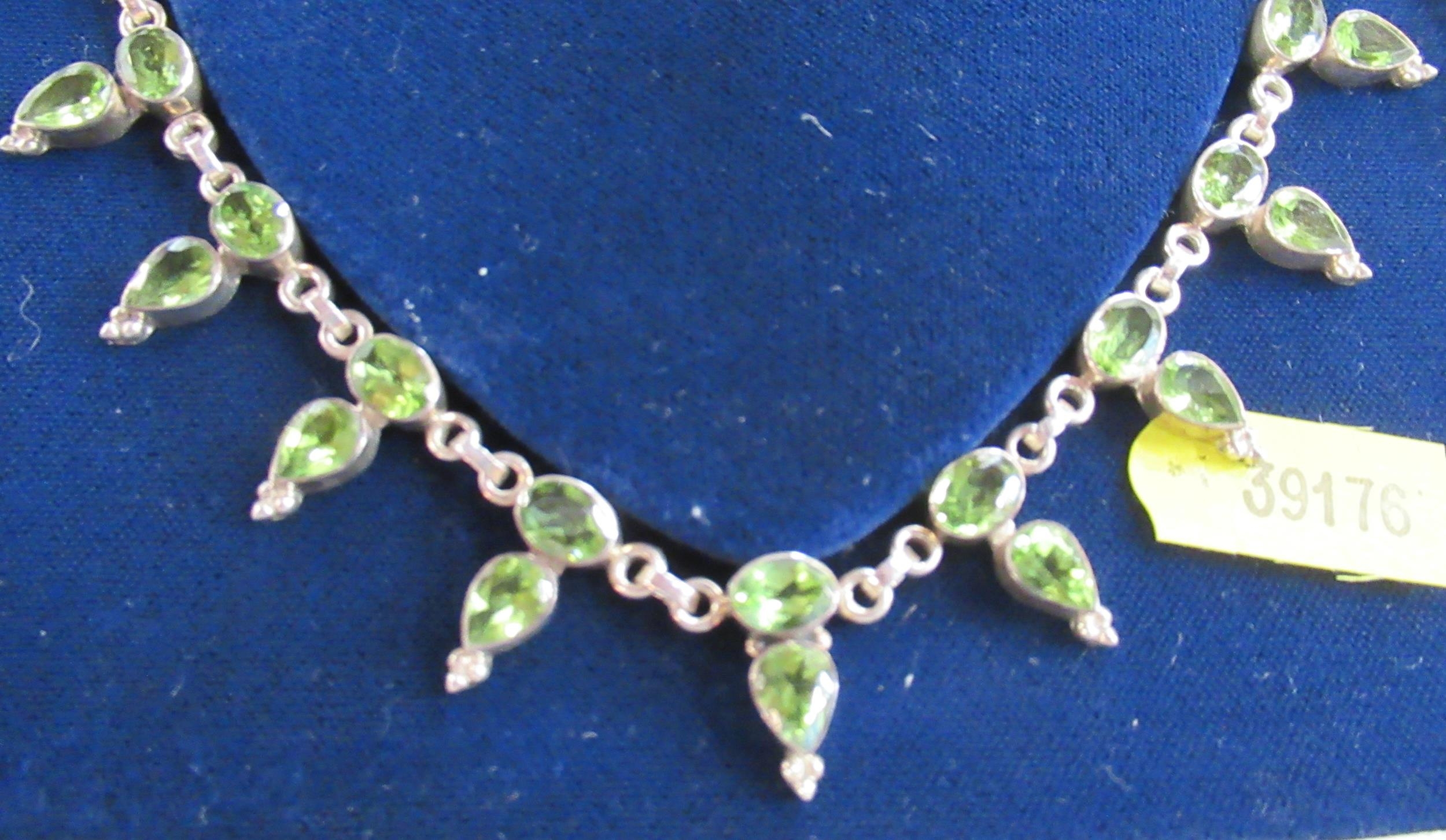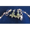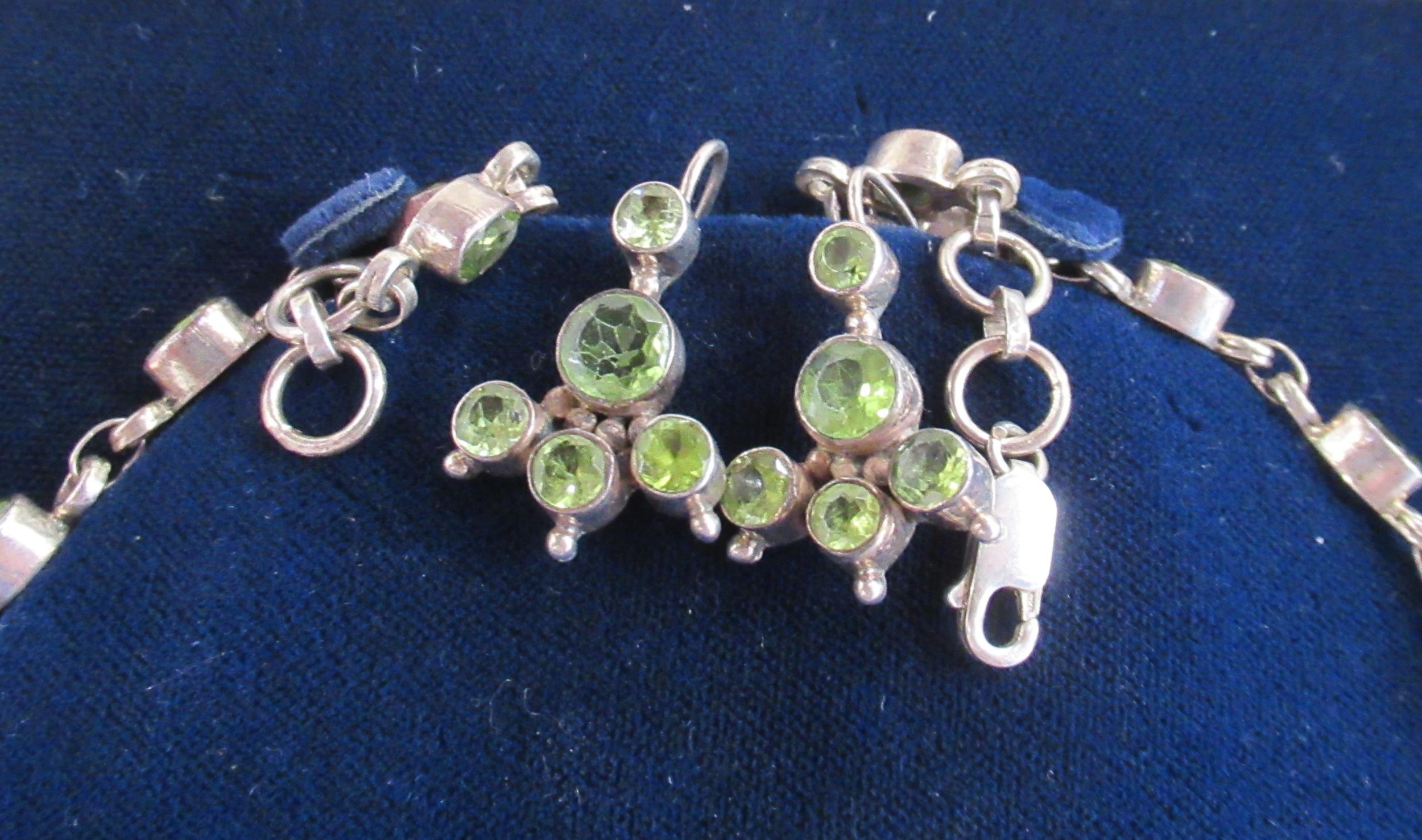 A jewellery suite, comprising necklace, bracelet and earrings, all set with green stones in silver, marked 925, in a Cassandra Goad, London box