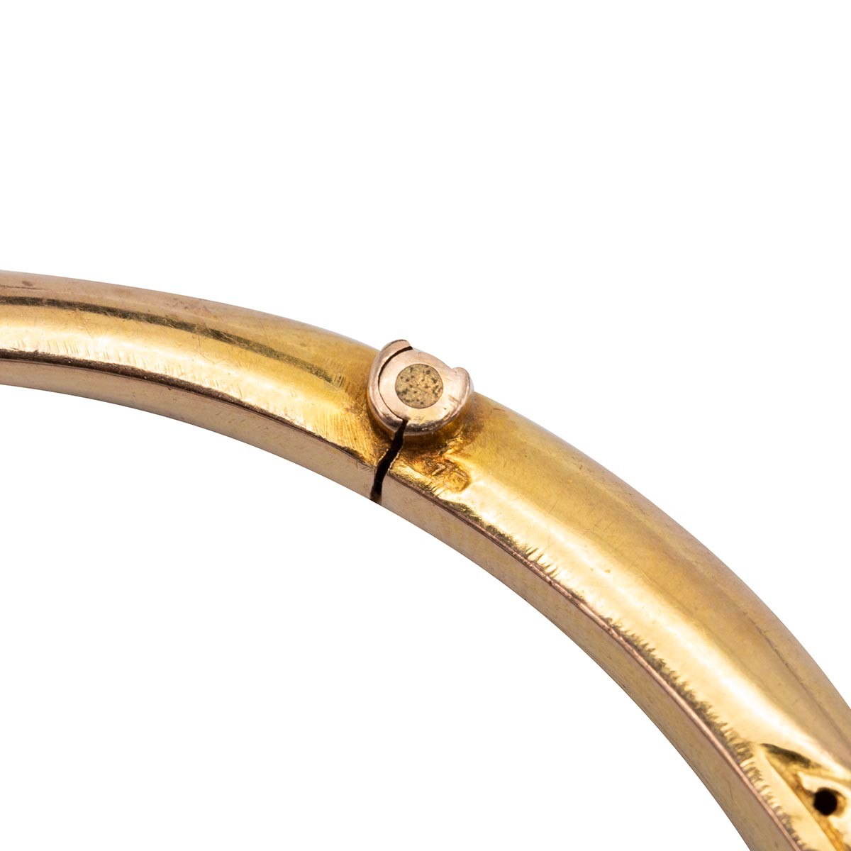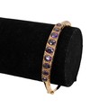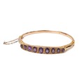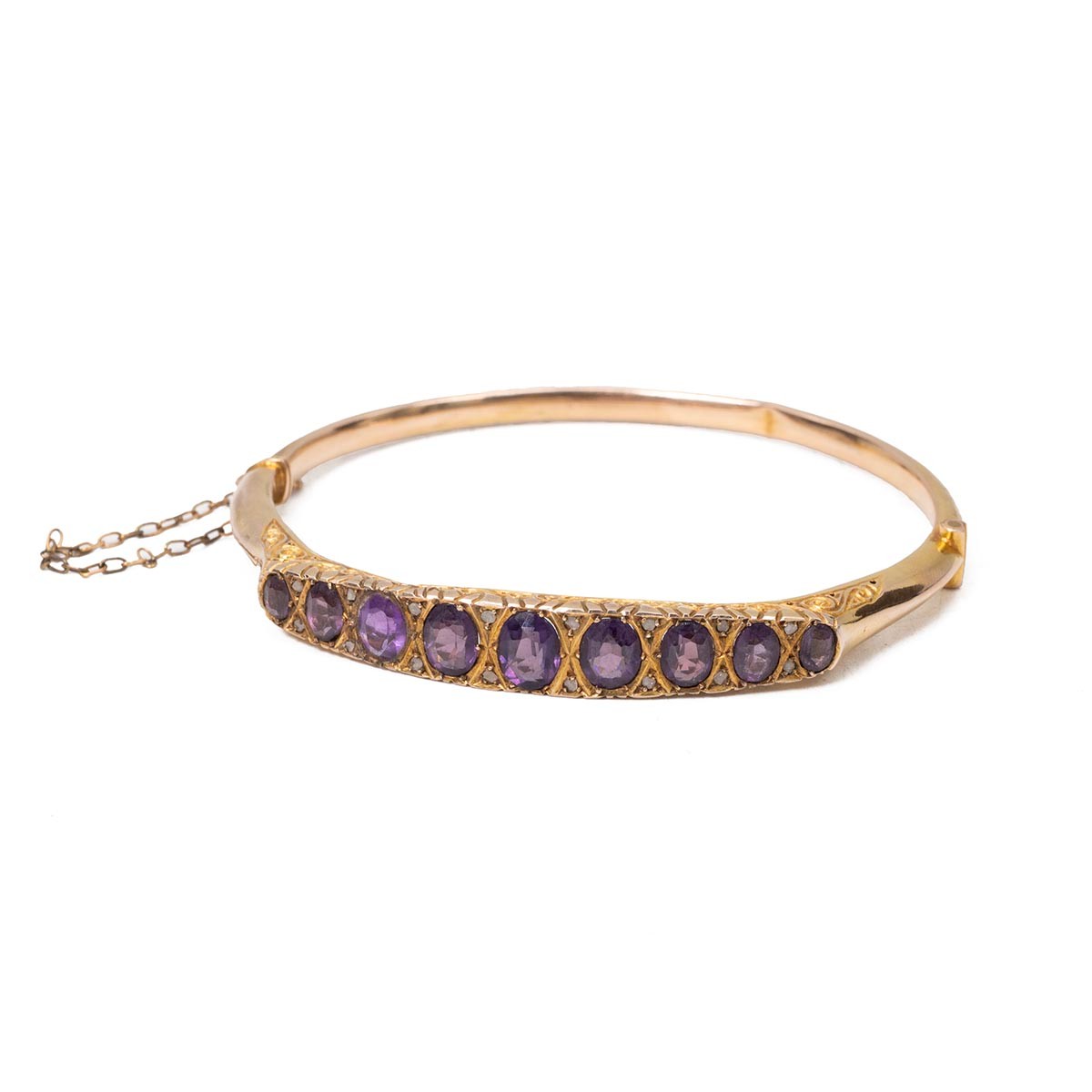 9ct gold hallmarked bangle, set with nine graduating amethysts flanked by six diamonds set in a raised decorative mount, with push-pull clasp and safety chain, weight 7.6 grams.