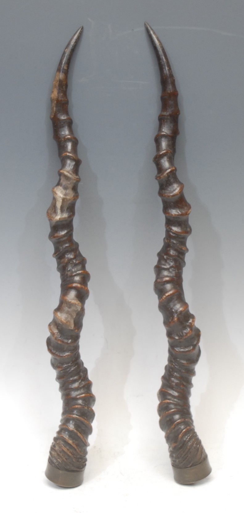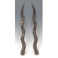Taxidermy - a pair of South African brass mounted impala (aepyceros melampus) horns, 49cm long