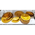 Composite French faience ochre-ground part dinner-service, printed marks for Haute Provence, comprising: two oval tureens, covers and fixed stands, an oval serving dish with gadrooned border, a fluted shaped oval shallow bowl, two circular serving dishes in sizes, four shell-shaped dishes, a circular two-handled dish, four soup-plates, 10 dinner plates
