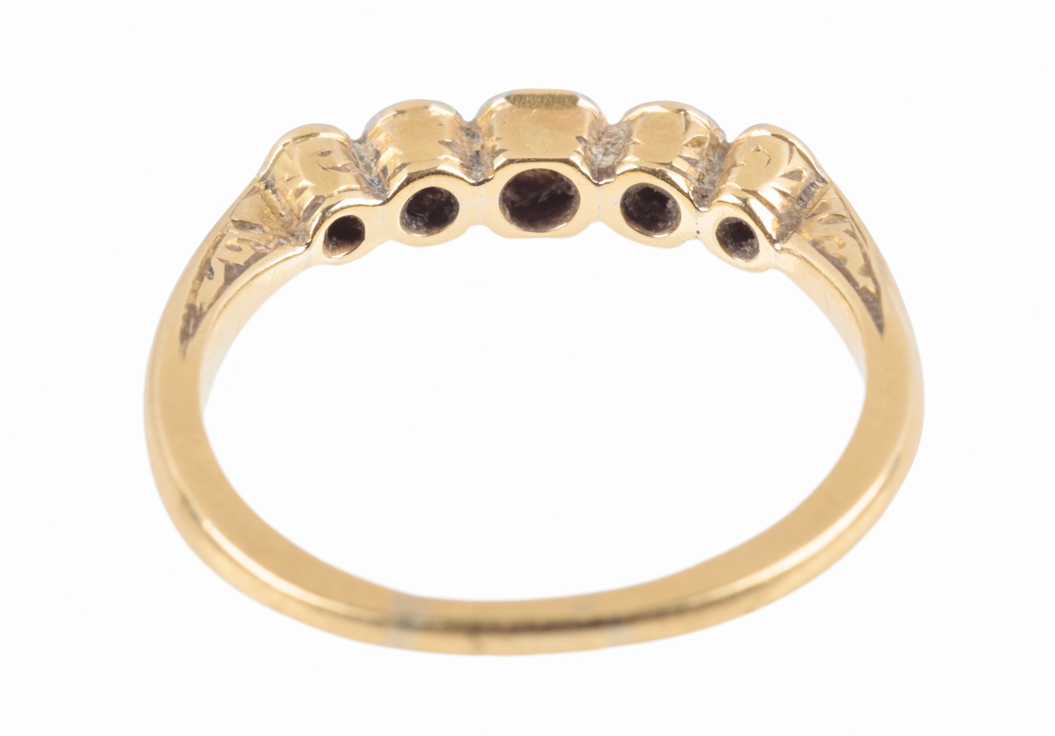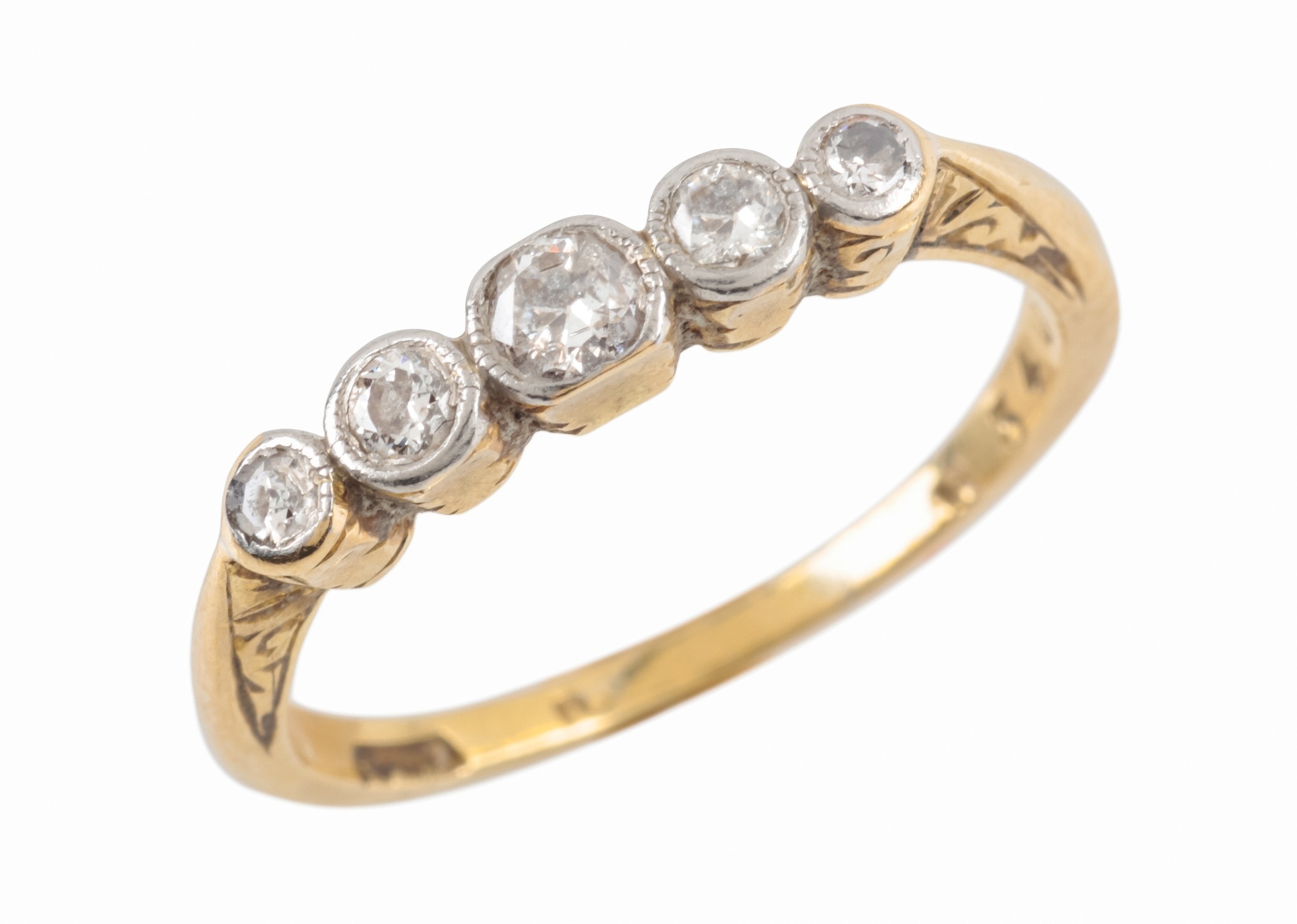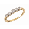 A FIVE STONE DIAMOND RINGeach brilliant-cut diamond collet set on a yellow gold shank, ring size M, c. 2.4 grams total weight