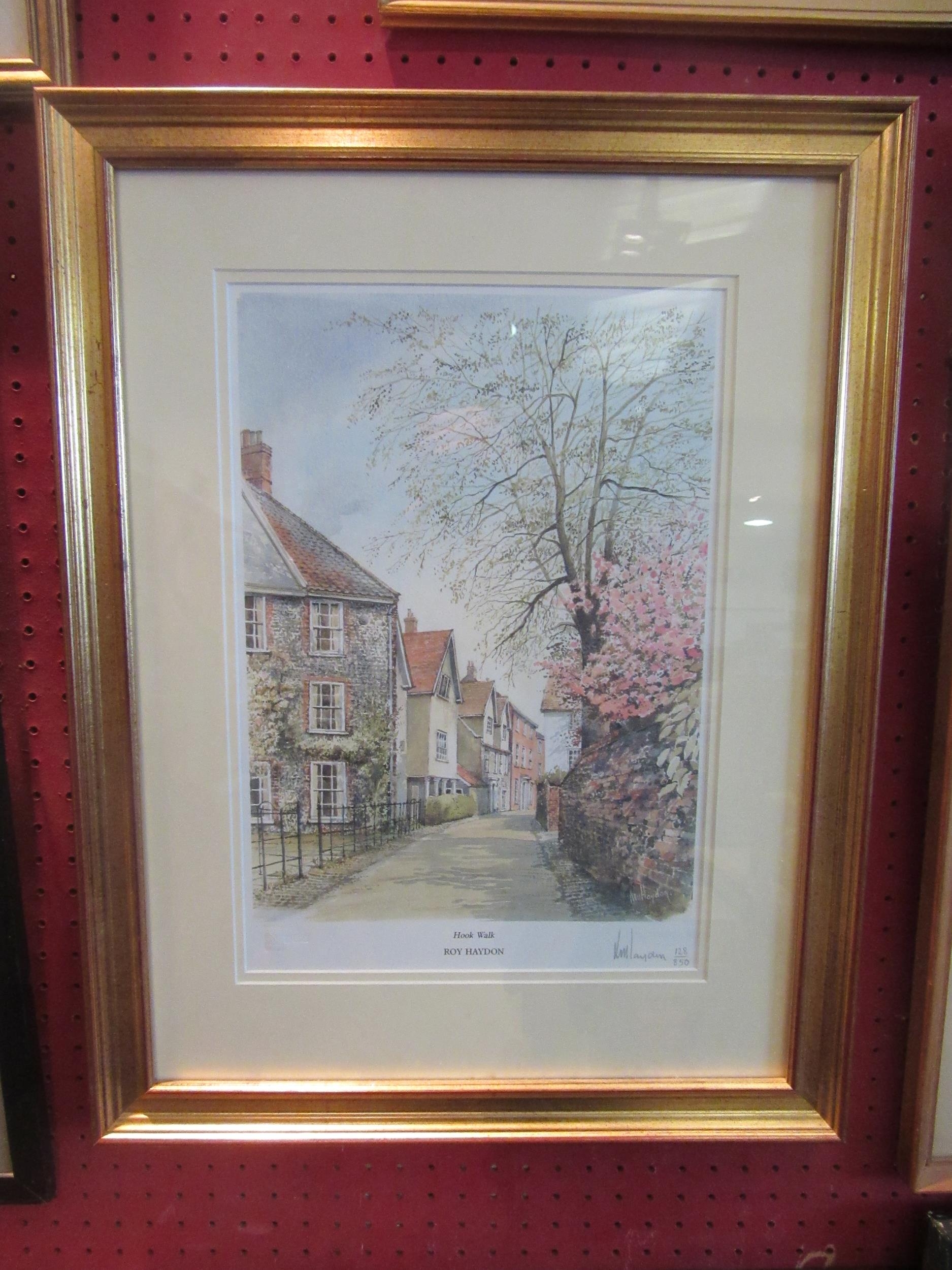 A Roy Haydon limited edition print "Hook Walk". Signed lower right No. 128/850. Blind stamped. Framed and glazed. 34cm x 25cm image size