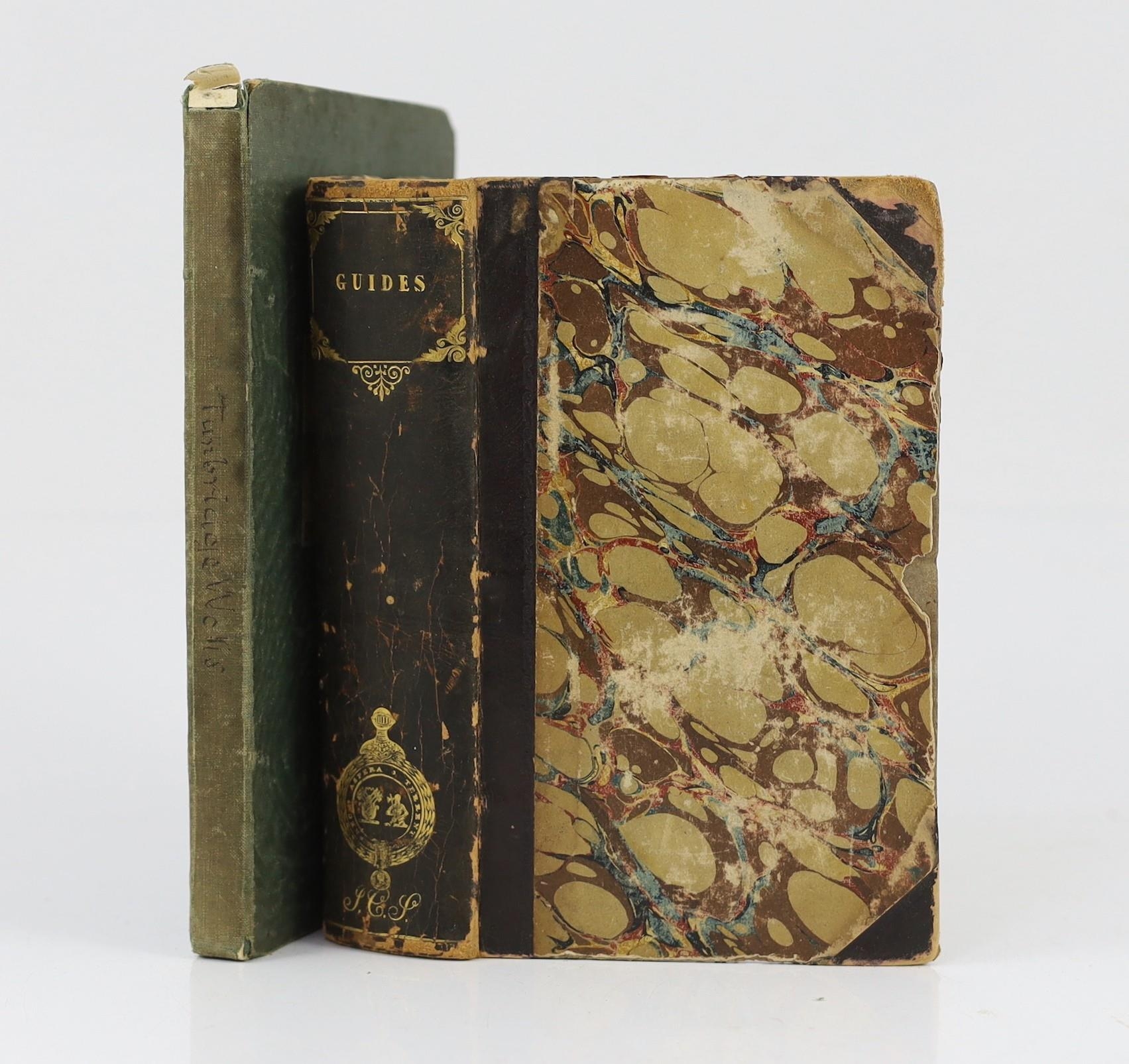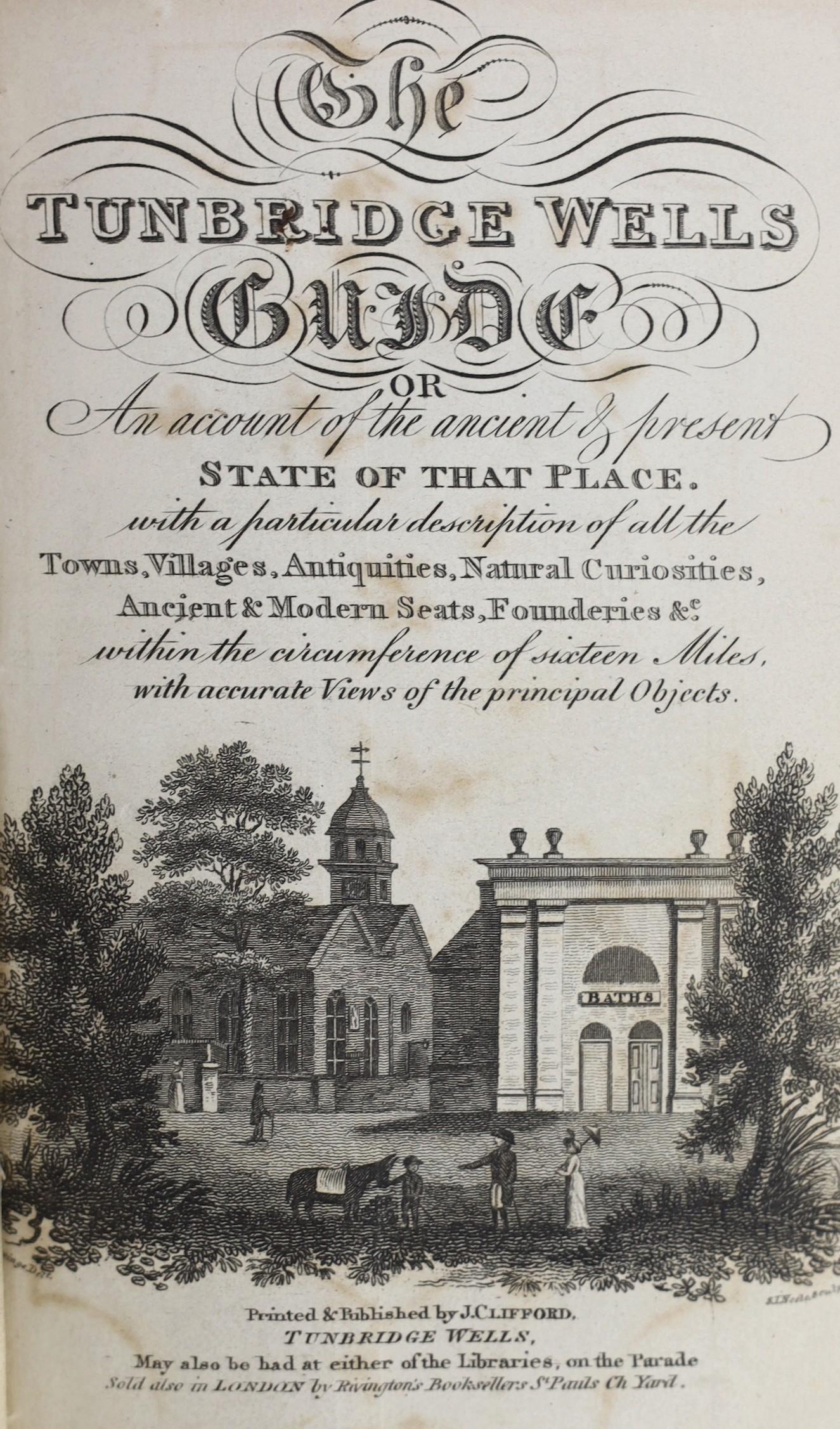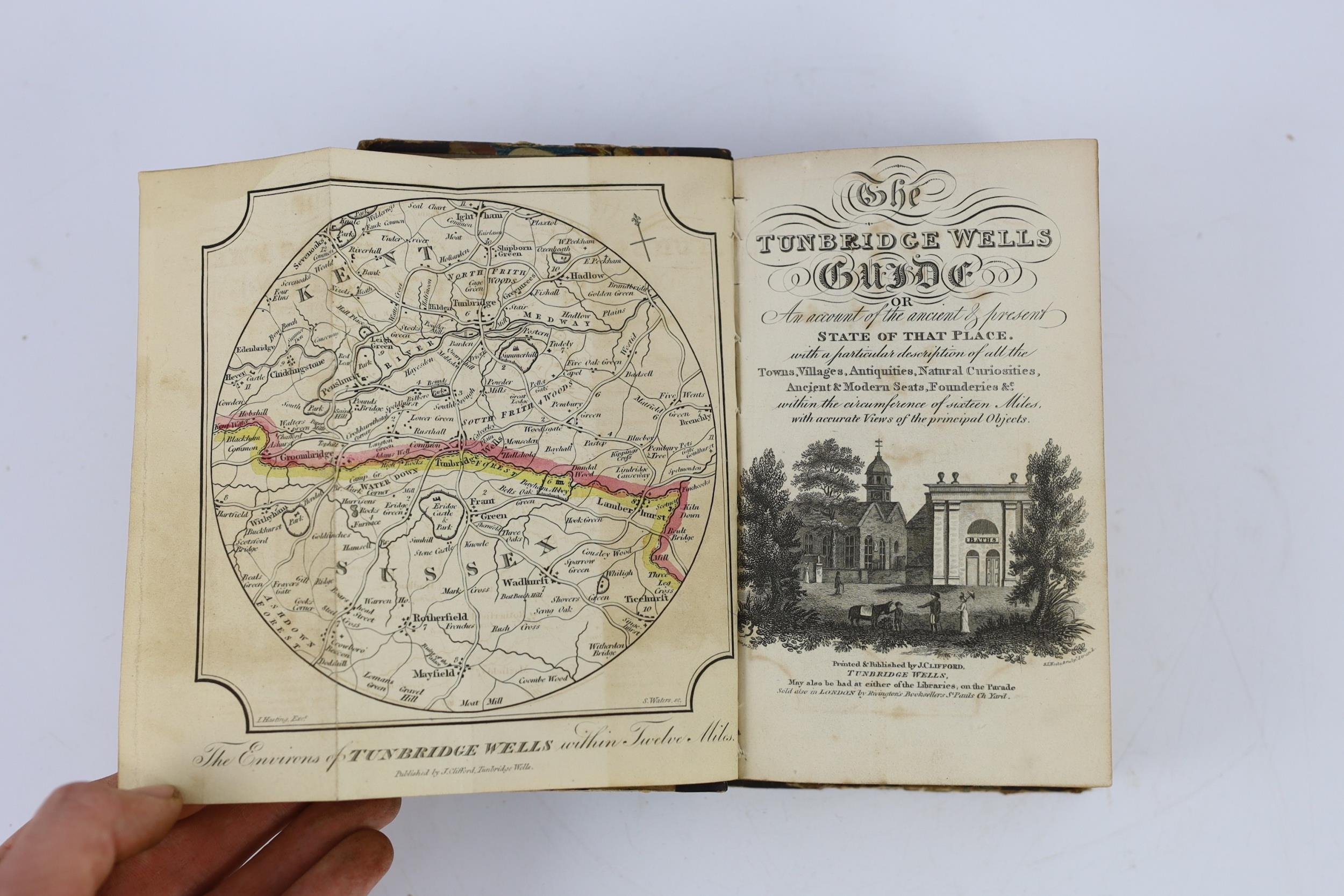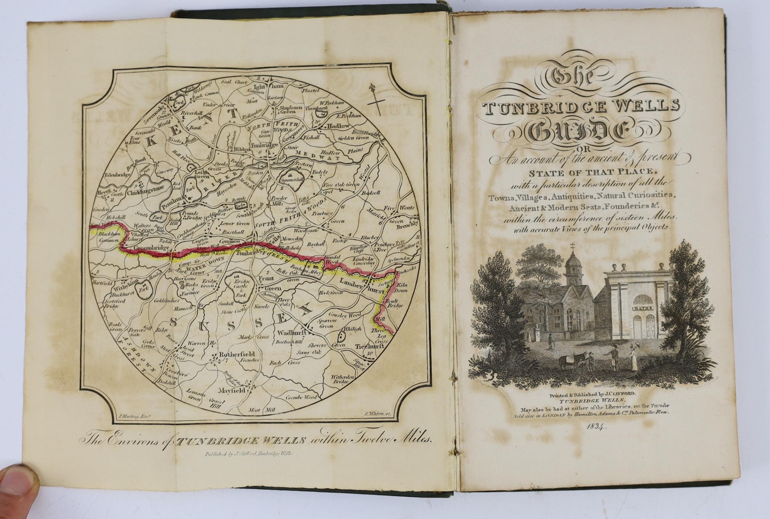° ° KENT, TUNBRIDGE WELLS: The Tunbridge Wells Guide... pictorial engraved title, engraved dedication, folded map, 6 plates (4 d-page or folded), engraved text illus.; original cloth with printed label, 12mo. Tunbridge Wells: printed and published by J. Clifford, 1834; The Tunbridge Wells Guide....pictorial engraved title, engraved dedication, folded map, 7 plates (4 folded) and engraved text illus.; old half leather and marbled boards, 12mo. Tunbridge Wells: printed and published by J. Clifford, (?1832); this second book bound with 5 other guides of the period, including - The Canterbury Guide. Containing a concise account of ....that Ancient City and its Suburbs....new edition with considerable additions and alterations. pictorial engraved title and 2 plates. Canterbury: printed and sold by Henry Ward, (1830) (2)