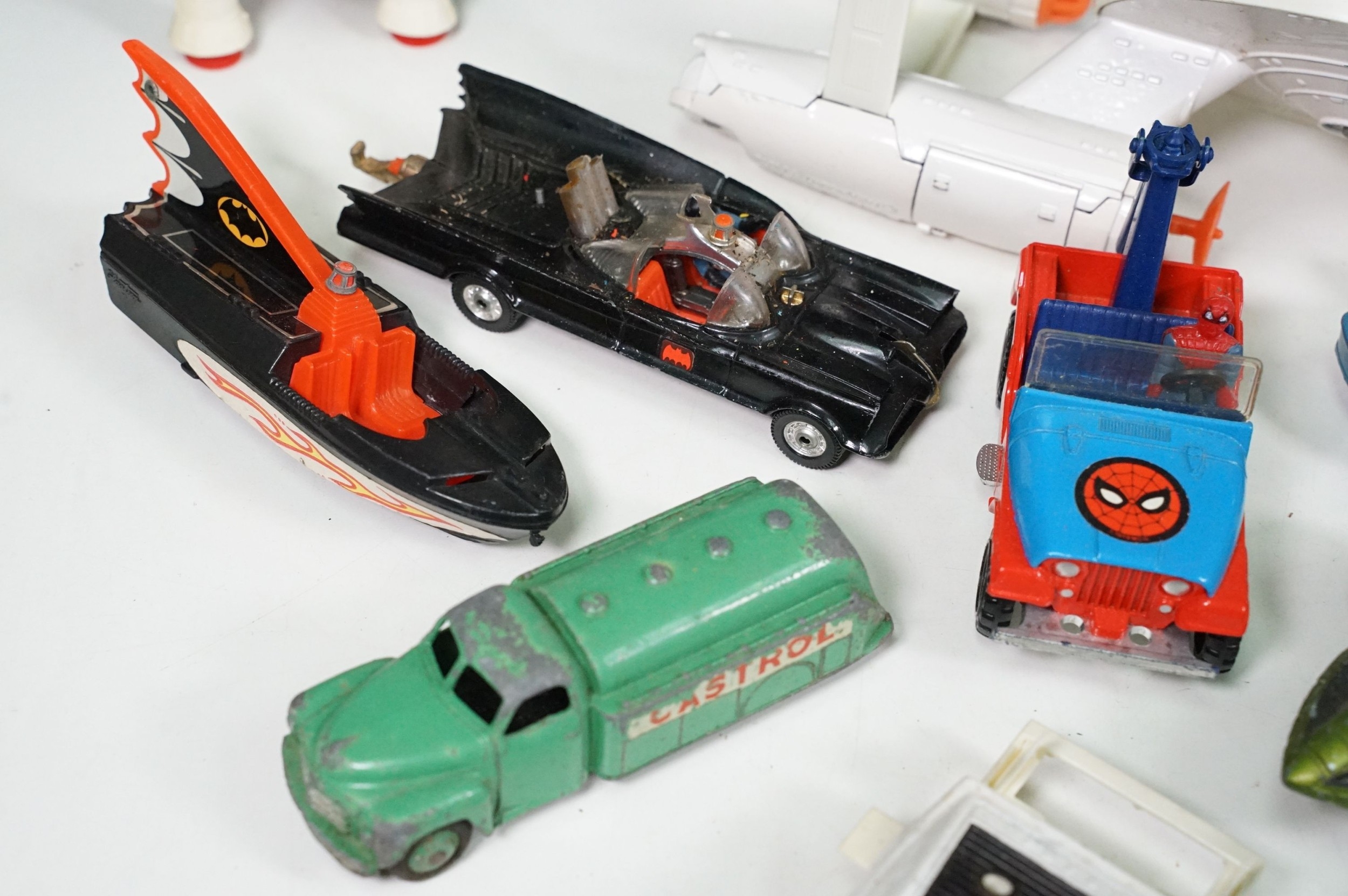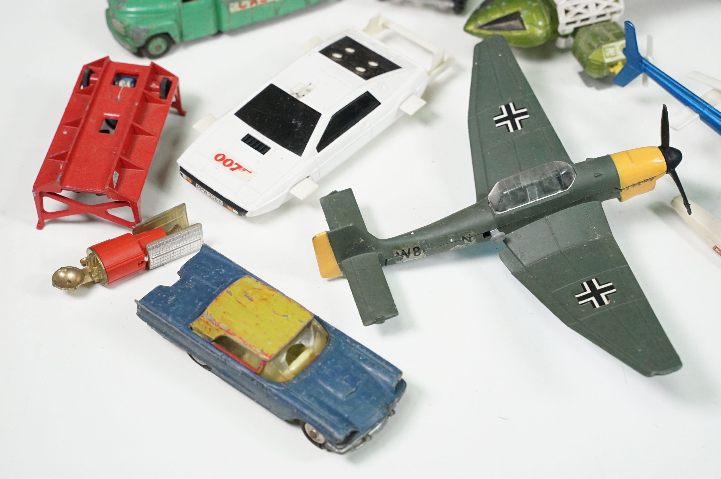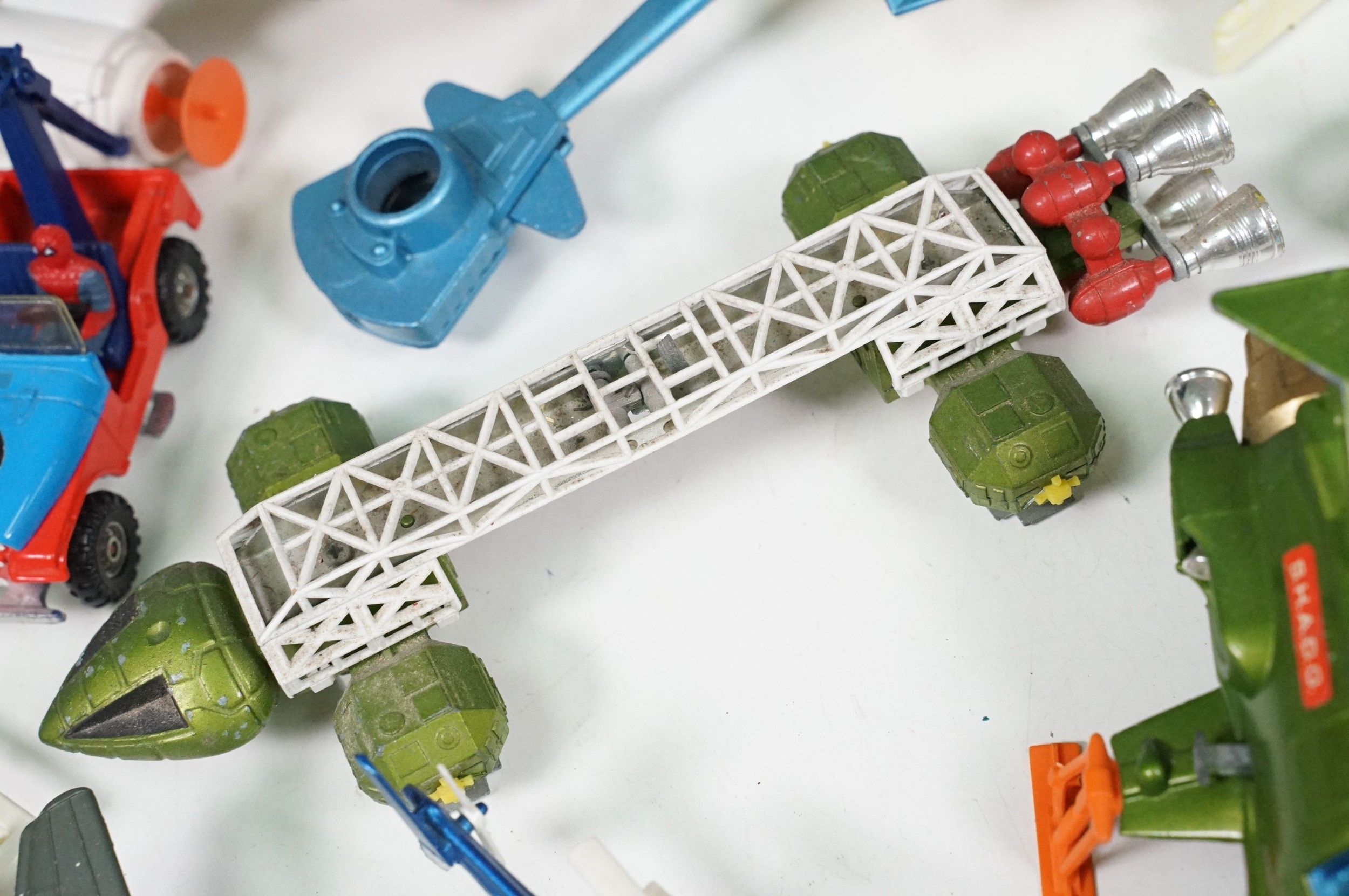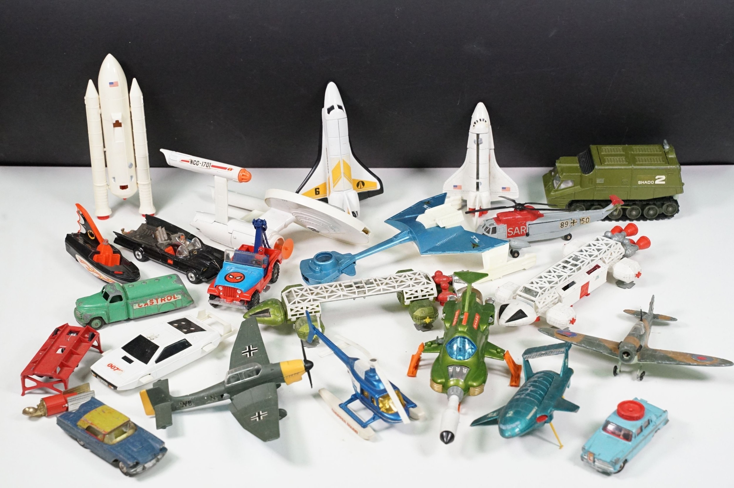 20 Mid 20th C playworn diecast models to include mainly TV / Film related examples featuring Corgi and Dinky including Corgi Batman Batmobile and Batboat, Dinky Klingon Battle Cruiser, Dinky UFO SHADO 2, etc
