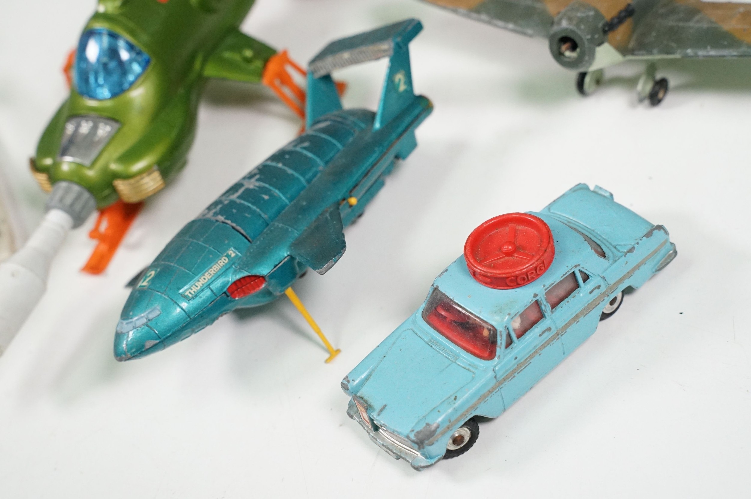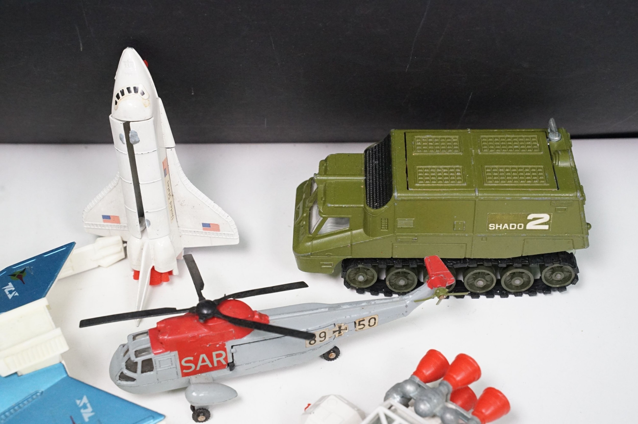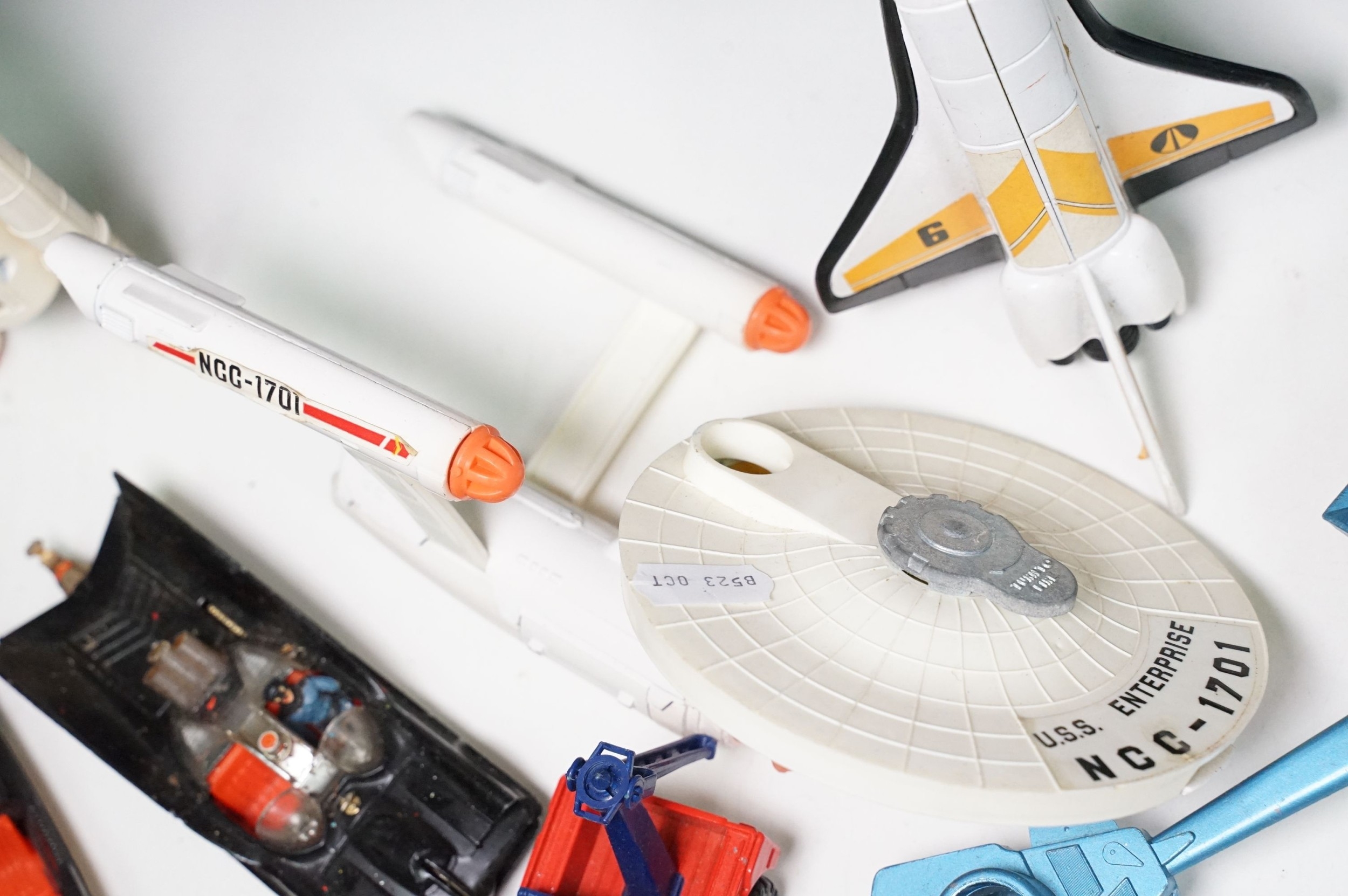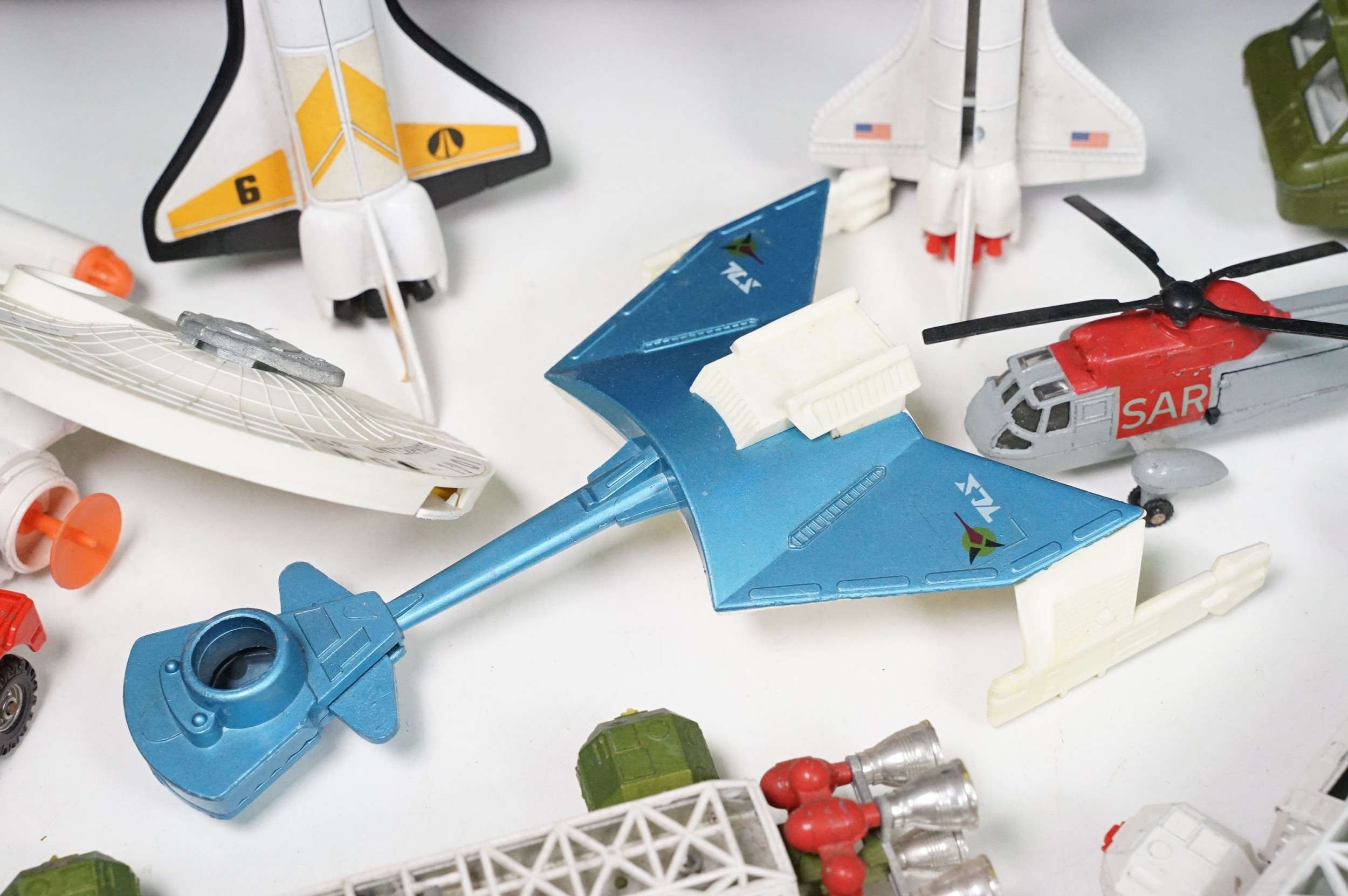 20 Mid 20th C playworn diecast models to include mainly TV / Film related examples featuring Corgi and Dinky including Corgi Batman Batmobile and Batboat, Dinky Klingon Battle Cruiser, Dinky UFO SHADO 2, etc