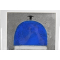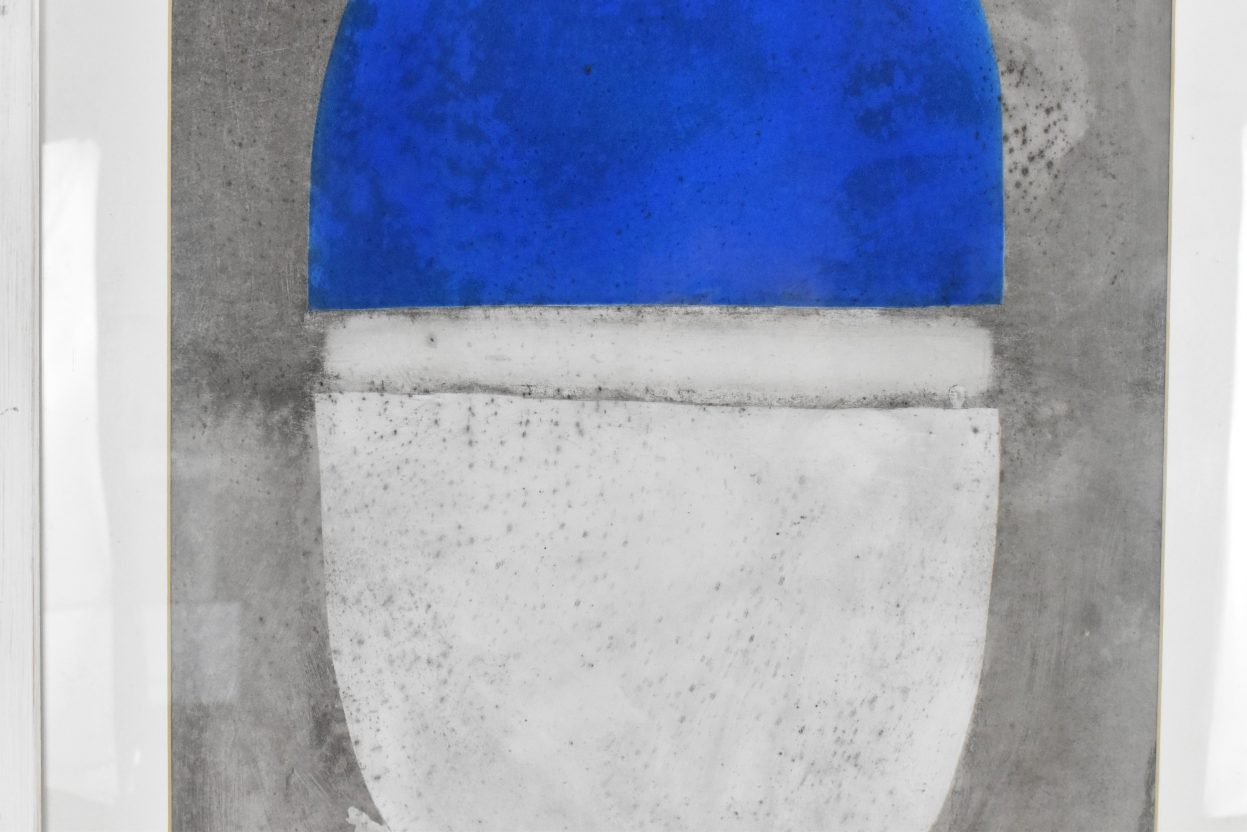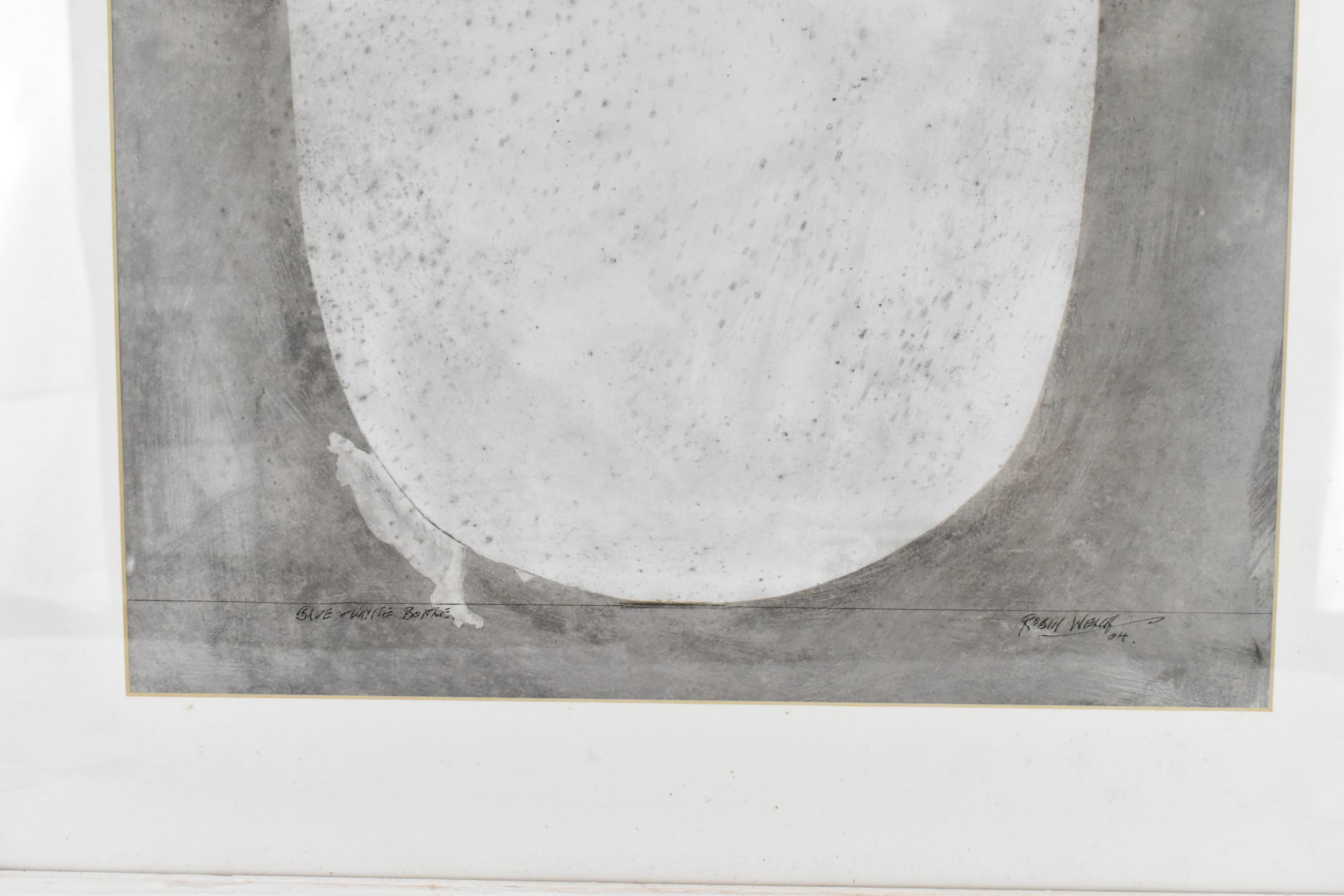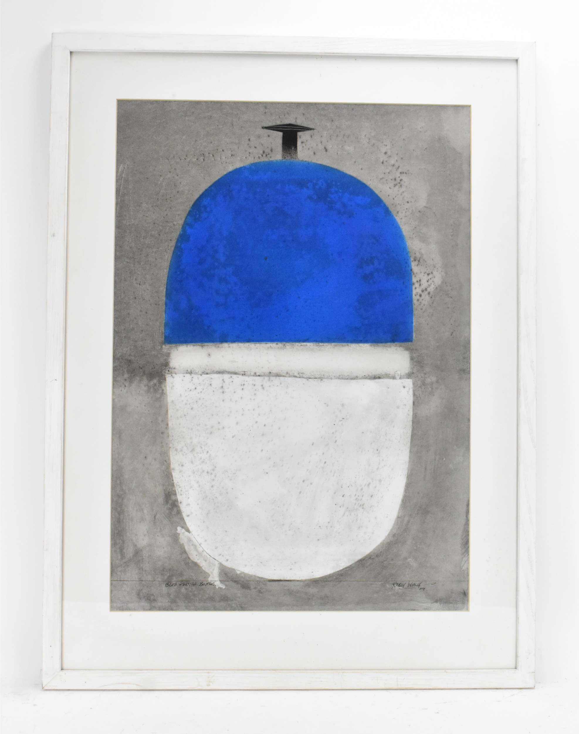 Robin Welch (1936-2019) - Blue & White Bottle - a large acrylic painting depicting a studio pottery pot, titled, signed and dated 04 to lower edge in ink, 61.5cm x 43cm, mounted and glazed in a white painted wood frame