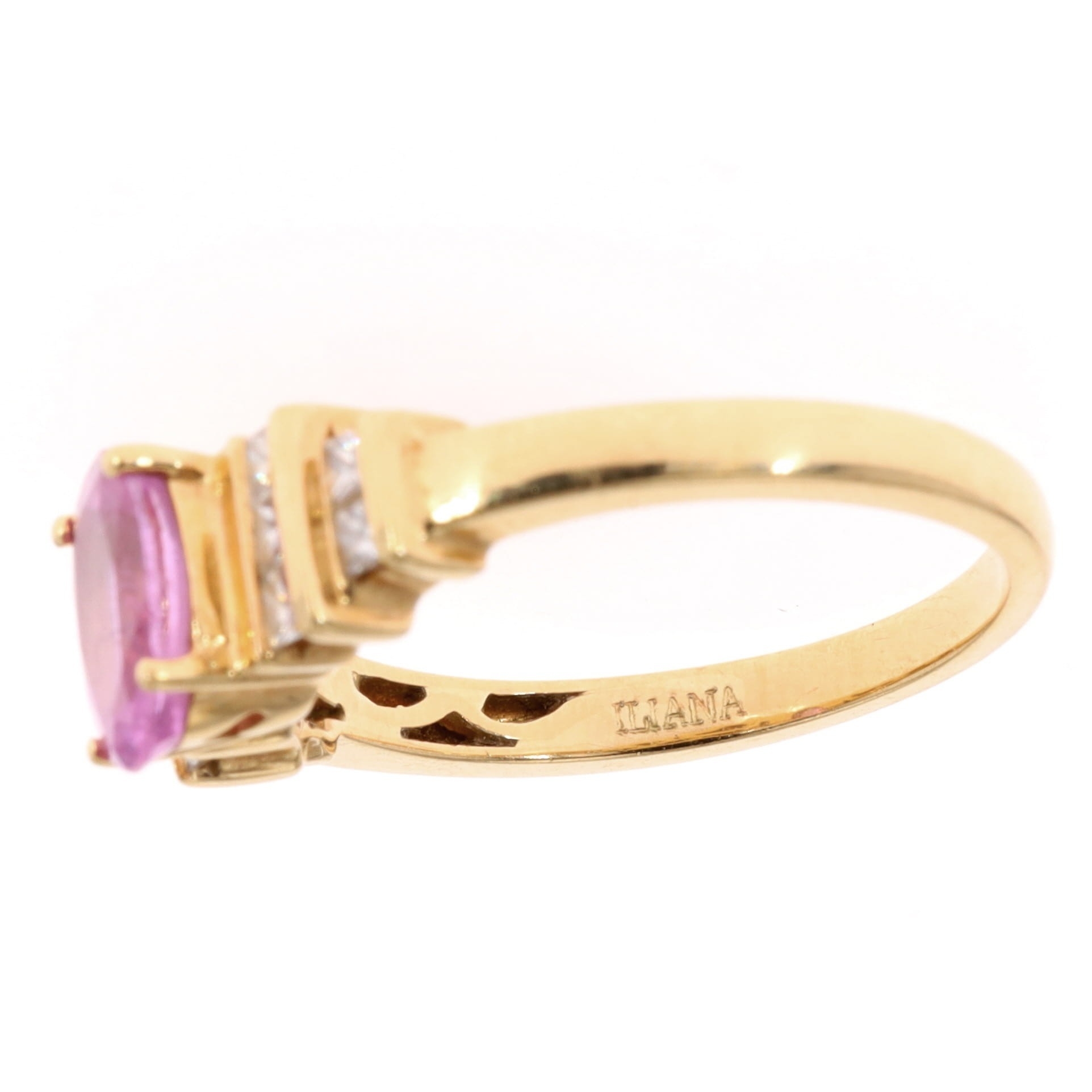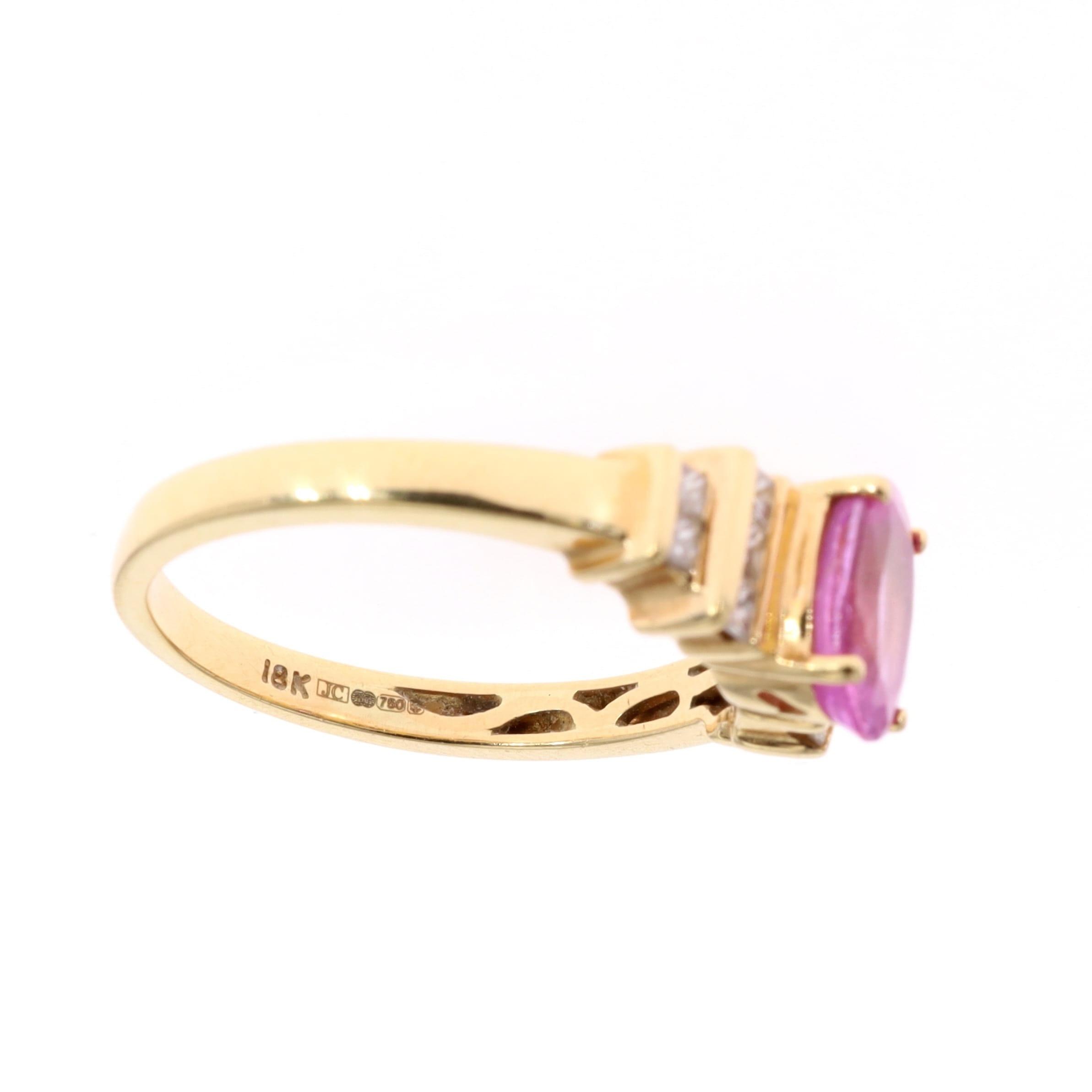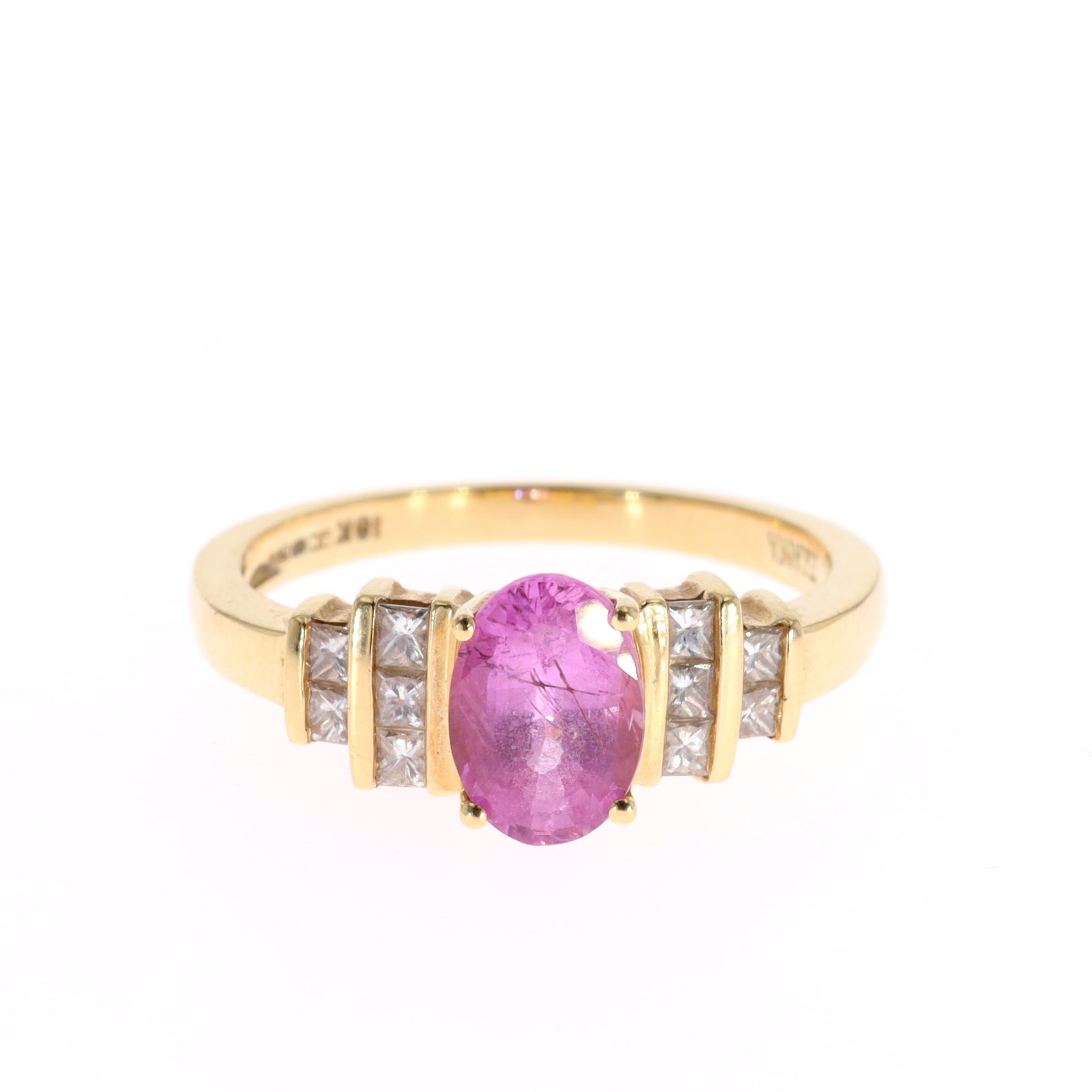 Pink Sapphire and Diamond 18ct Gold Dress Ring. The ring features an oval cut pink sapphire with ten princess cut diamonds. This ring is hallmarked 18ct gold. Weighs 4.7g. Uk finger size O 1/2