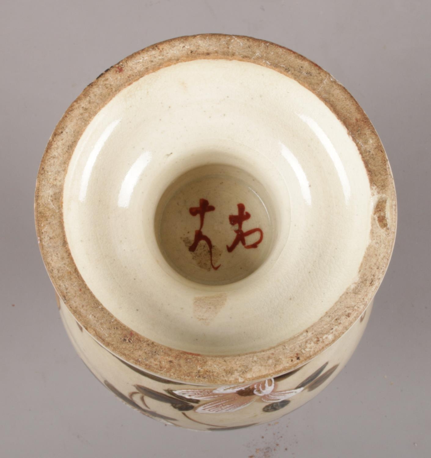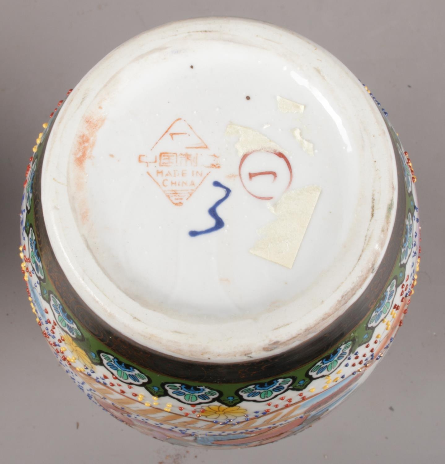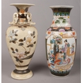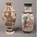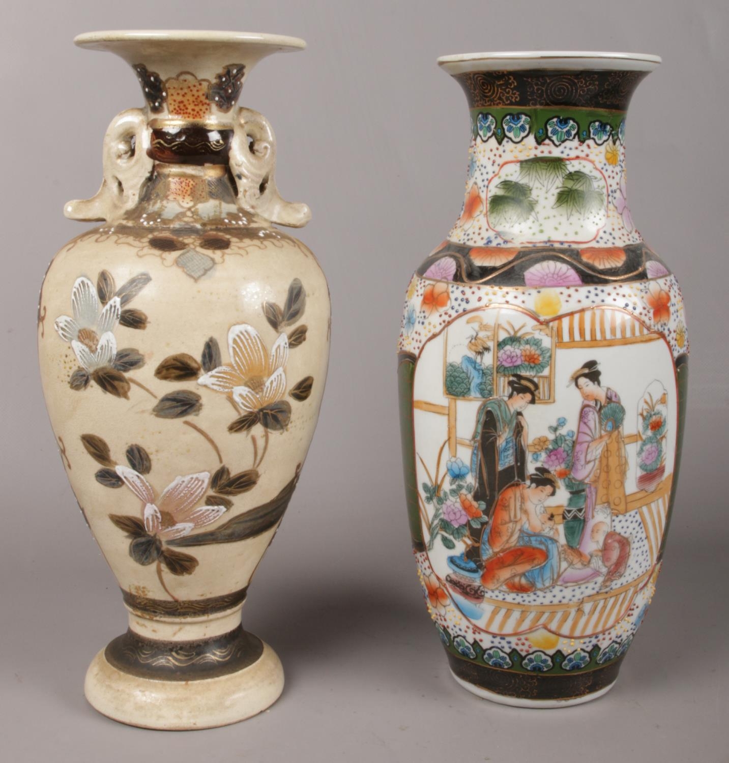 Two Japanese ceramic vases. To include a Satsuma style vase depicting a warrior, along with a vase depicting Japanese women & children. H: 31cm, W: 14cm.