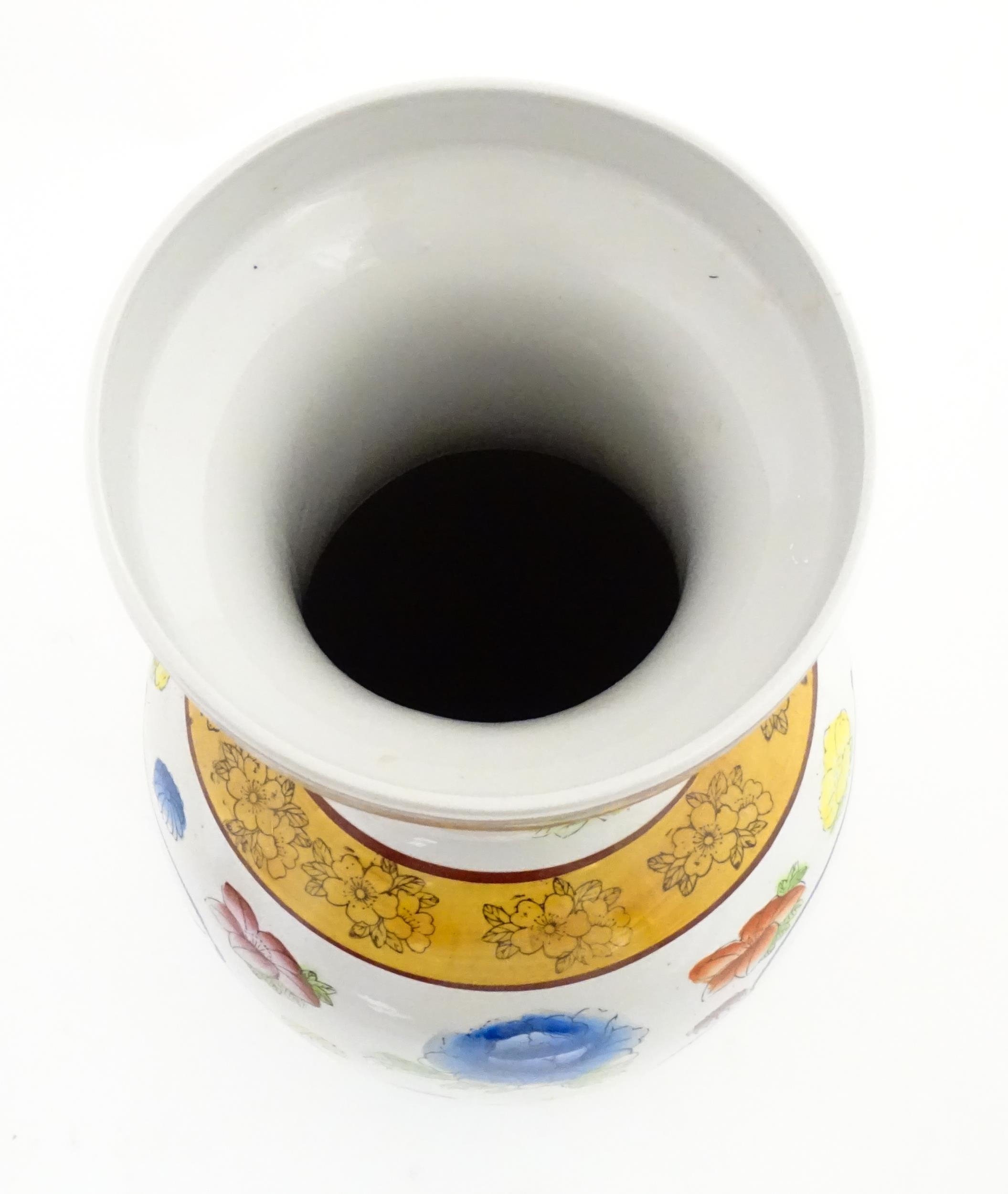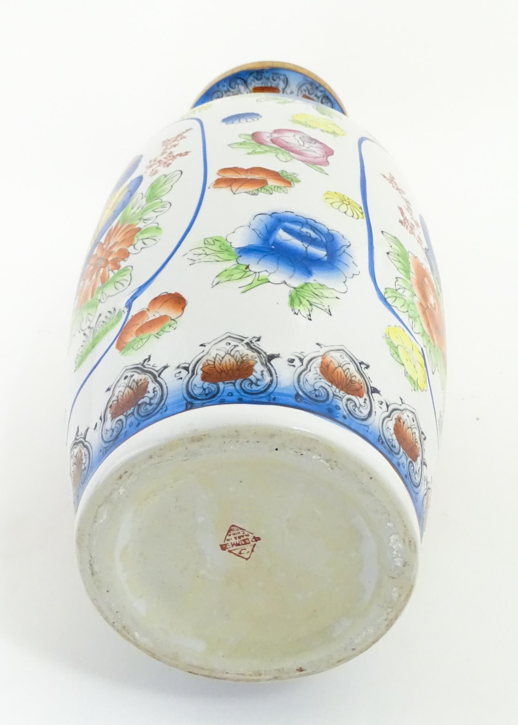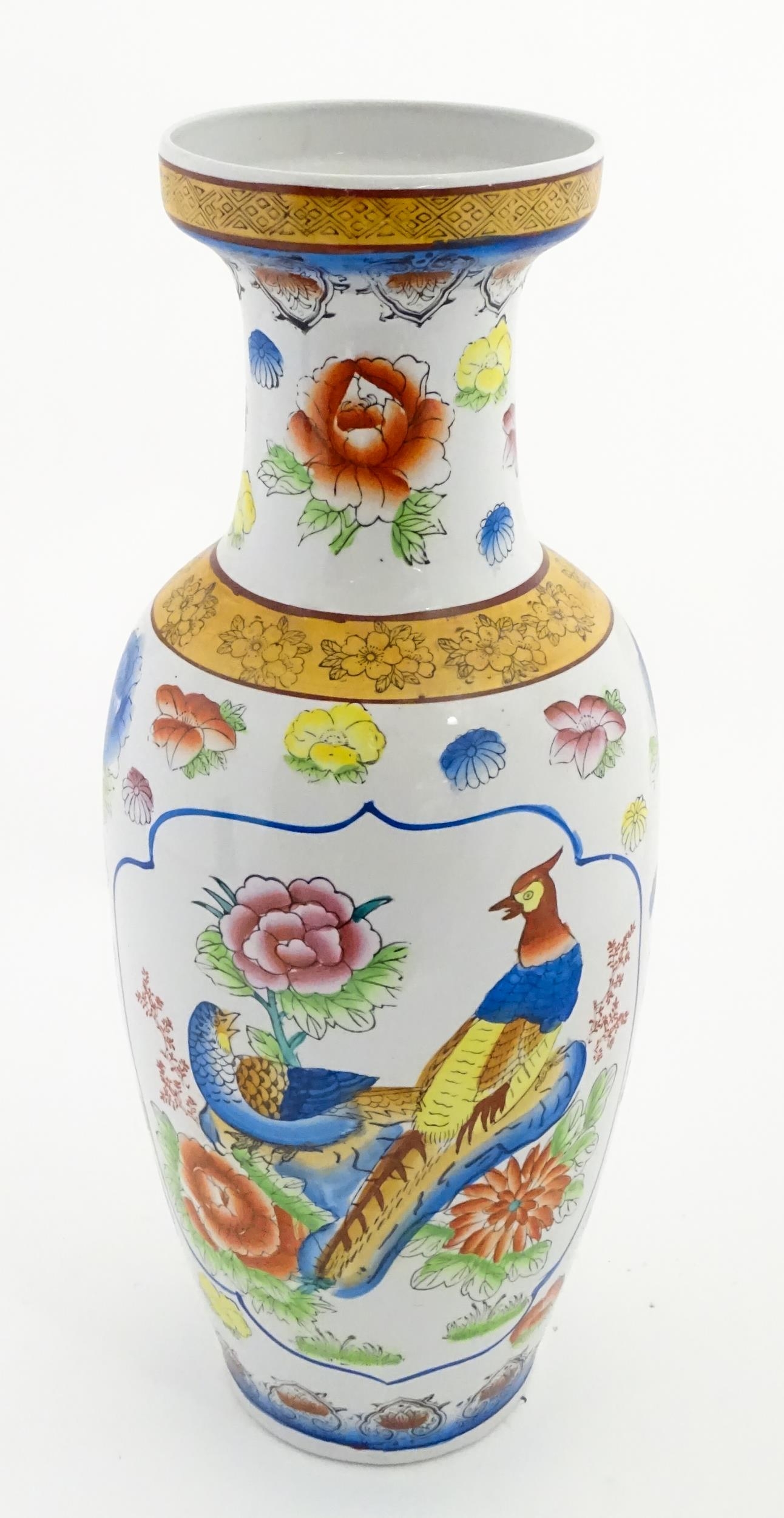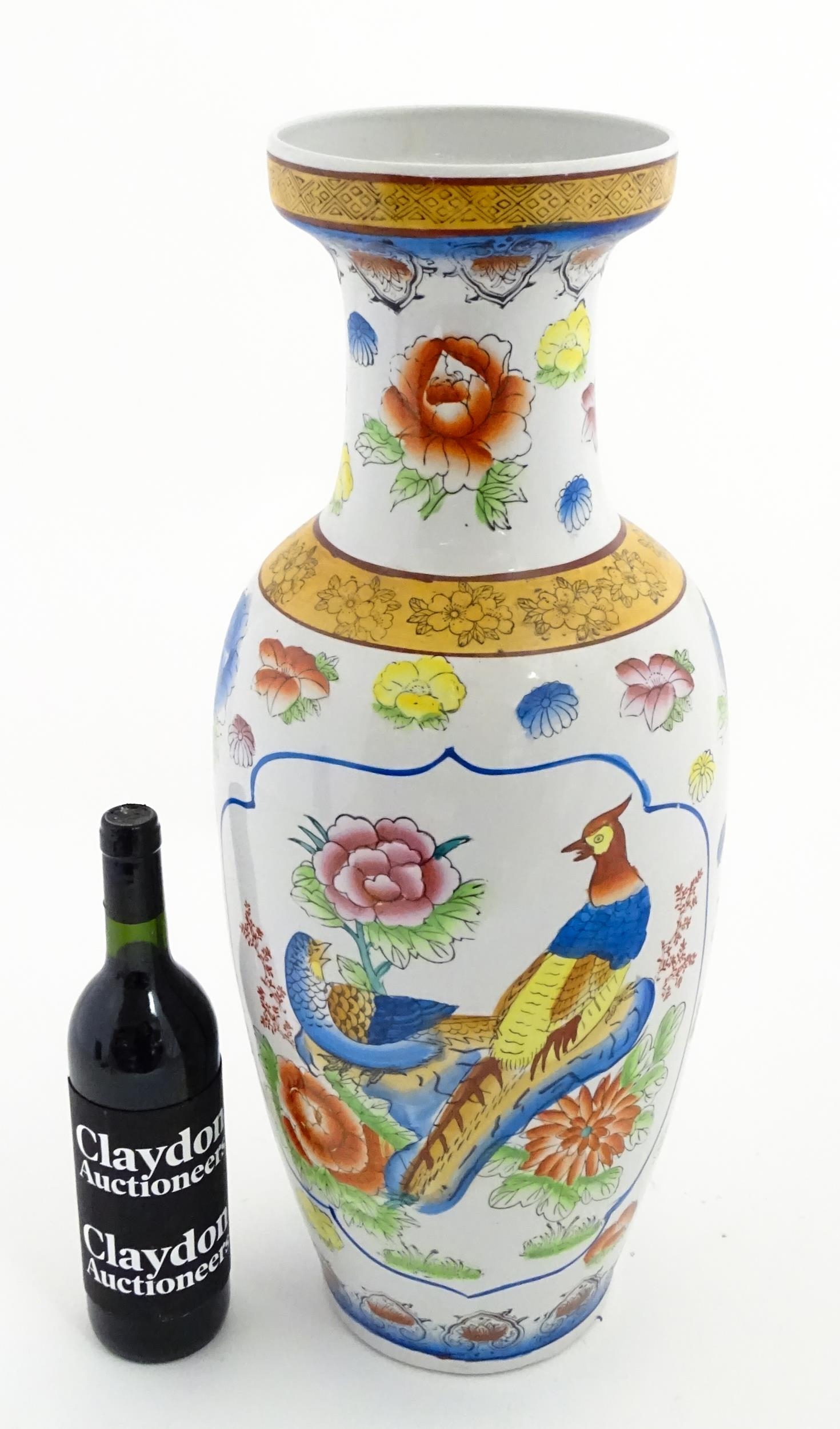 A large Chinese vase decorated with birds and flowers. Marked under. Approx. 24" high
