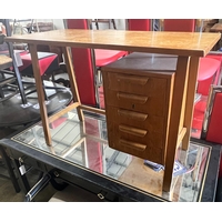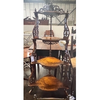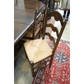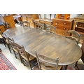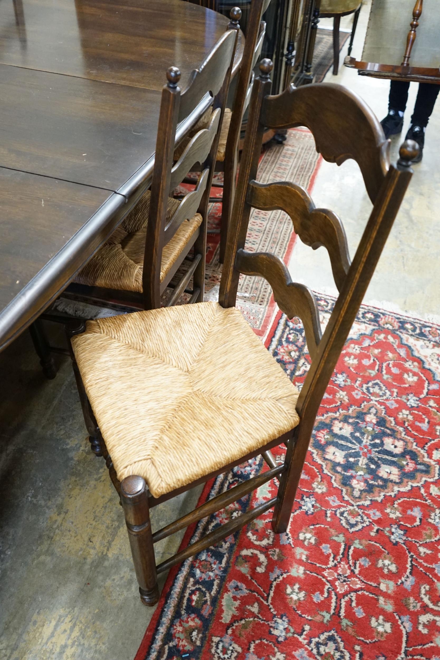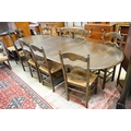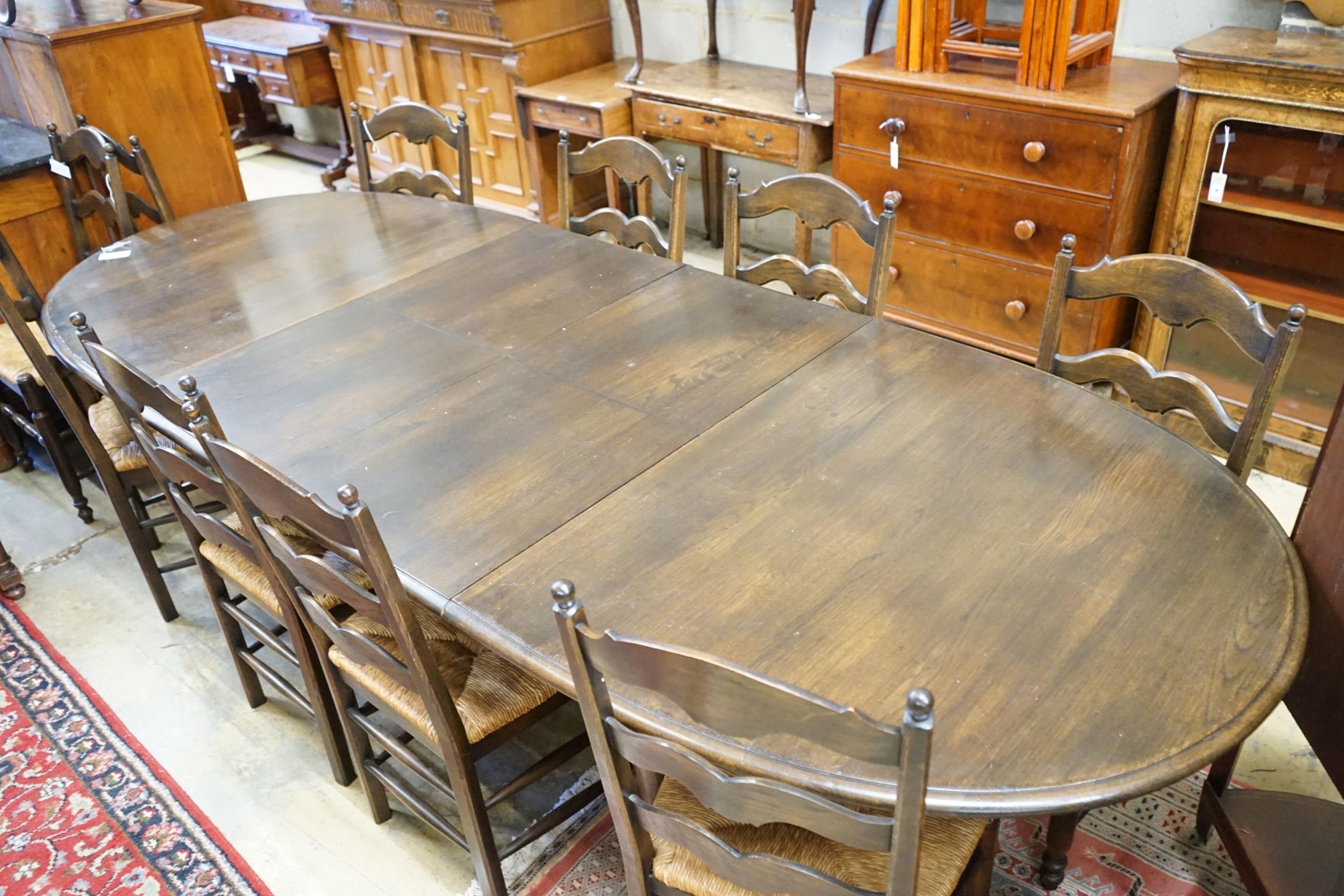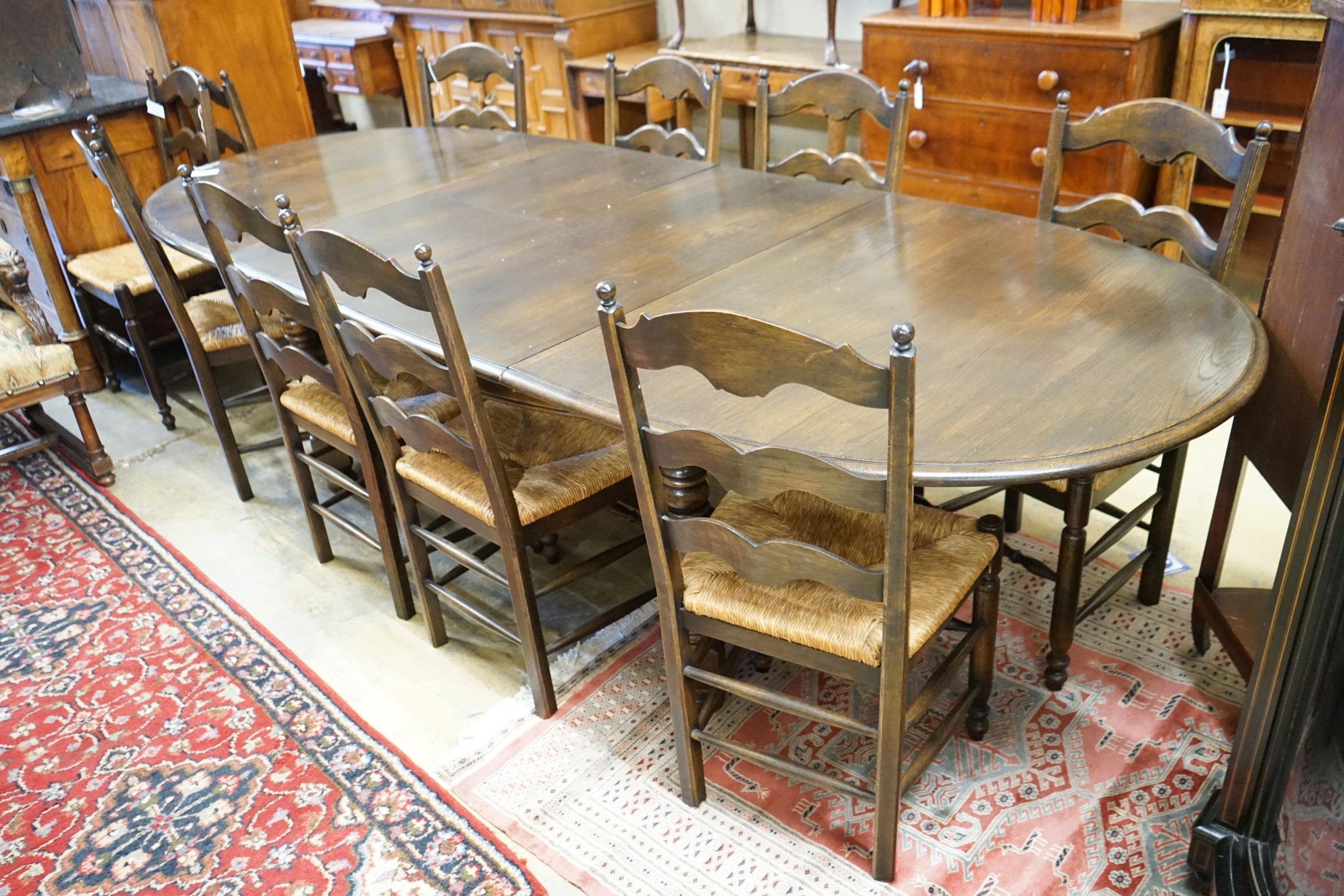 A French style oak extending dining table, with two spares leaves, 280cm extended, width 11cm, height 74cm together with a set of ten ladder backed rush seated chairs