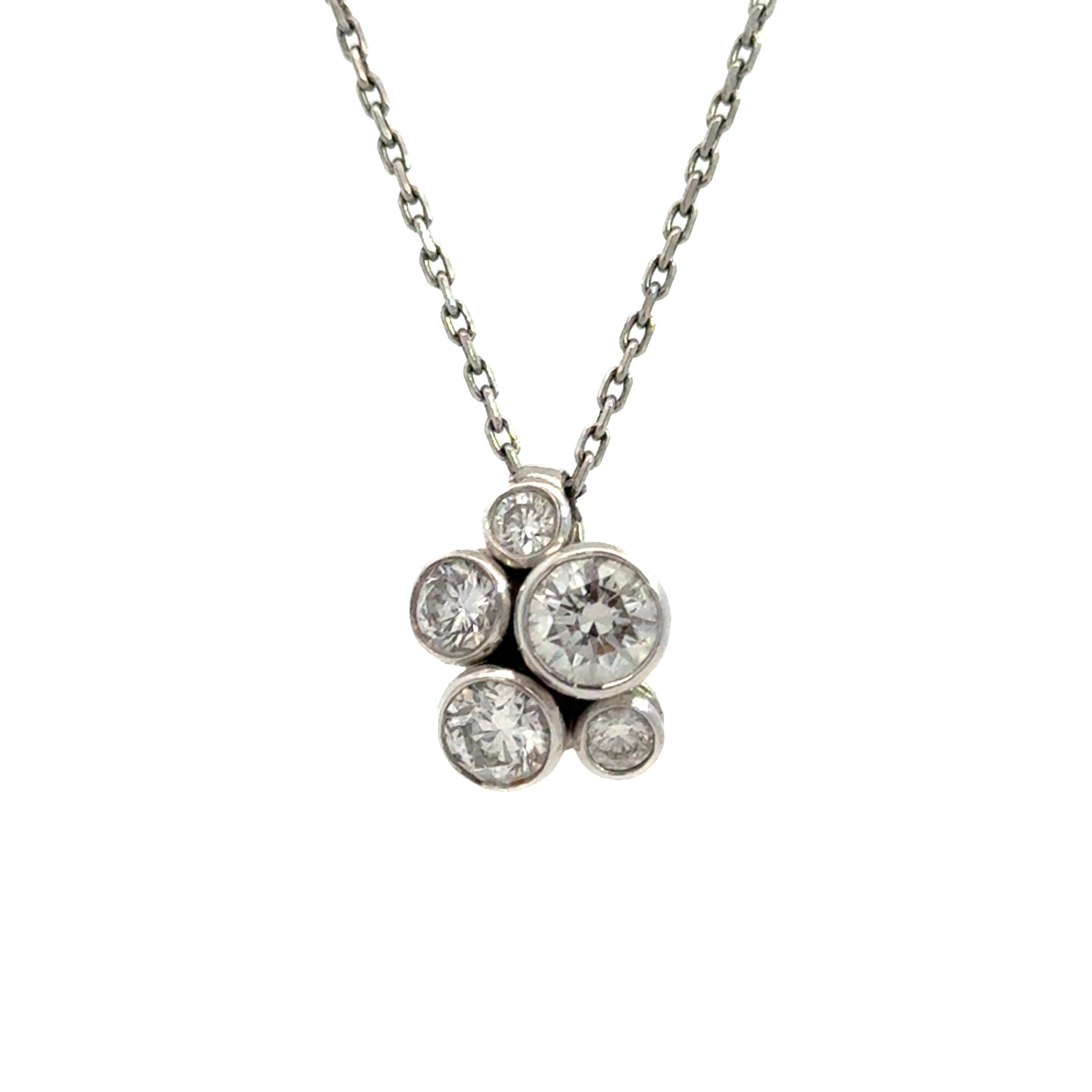 Boodles: Raindance Cluster Pendant. Comprised of 1.25ct round brilliant diamonds. In platinum, with platinum chain set with two diamonds. Complete with original box. Available to purchase from Boodles, RRP: £14,800