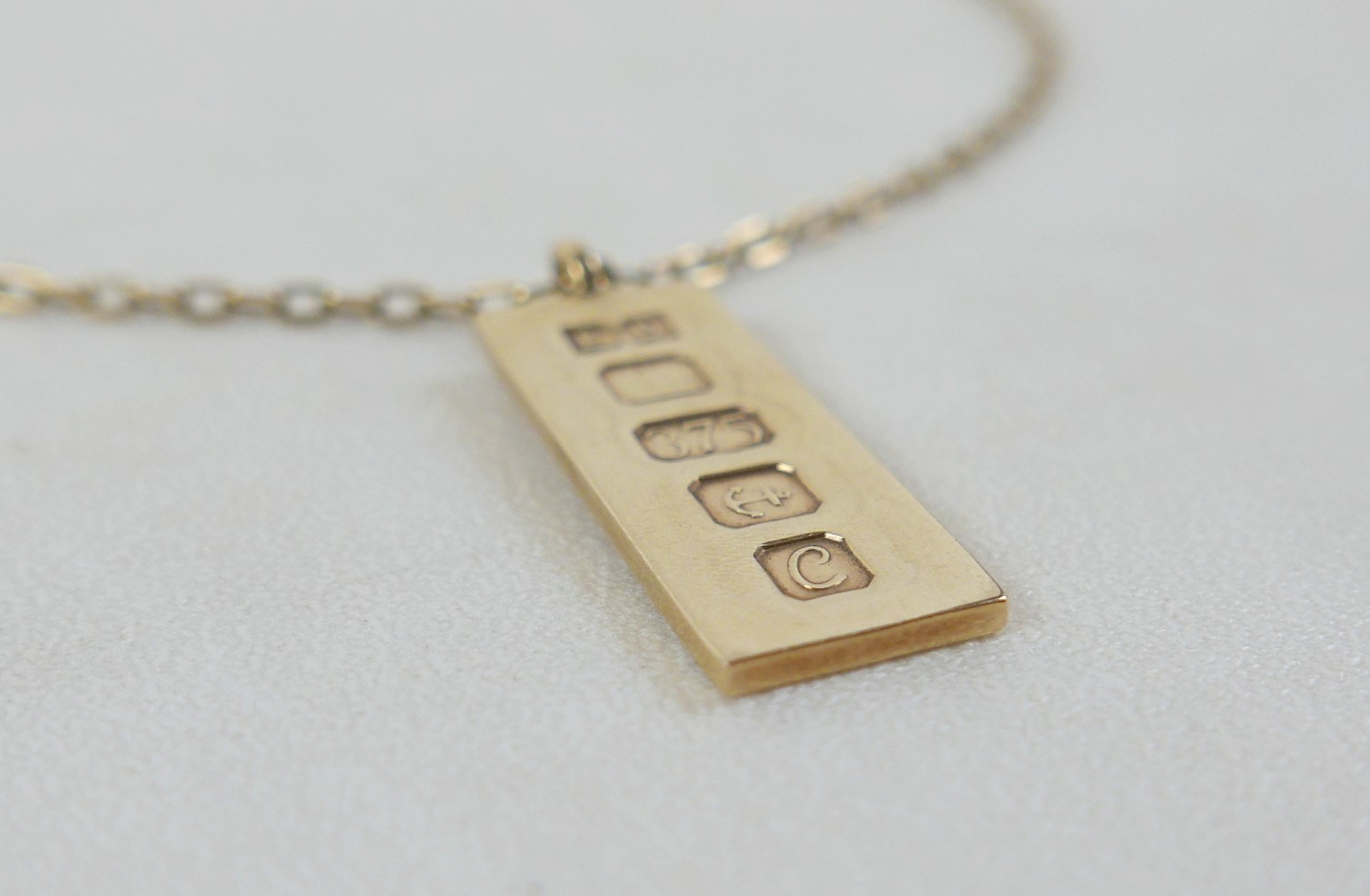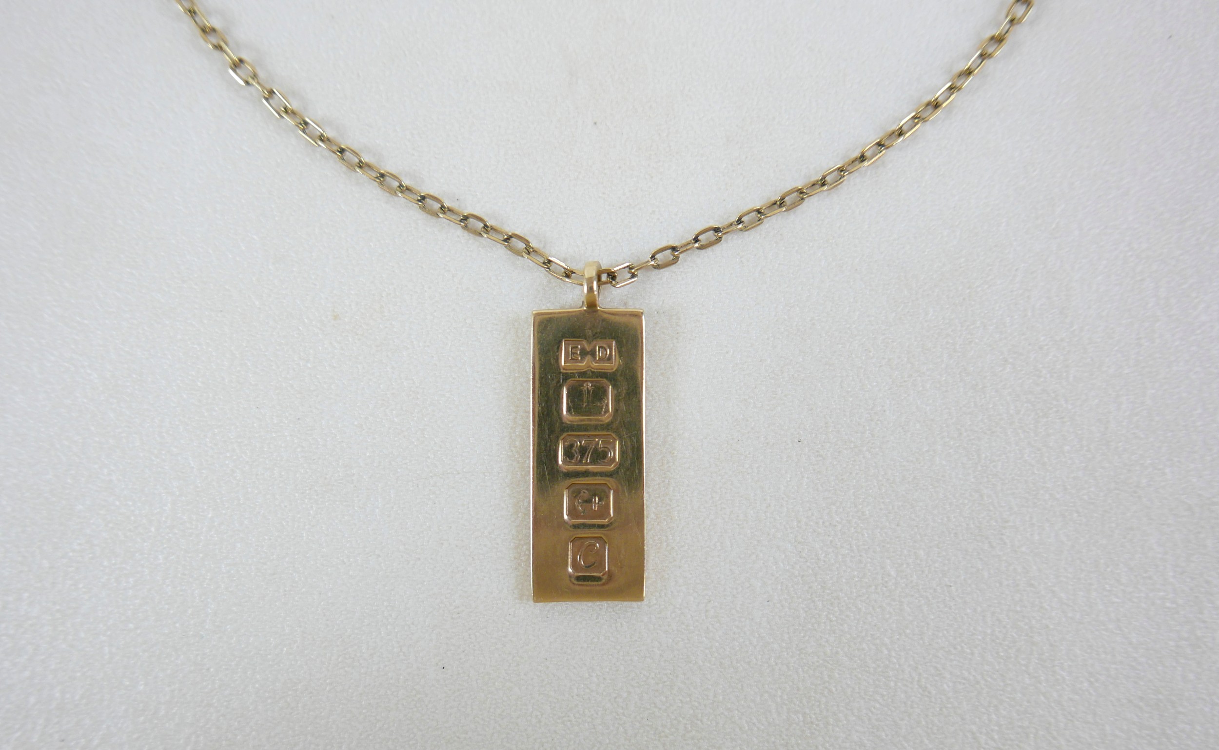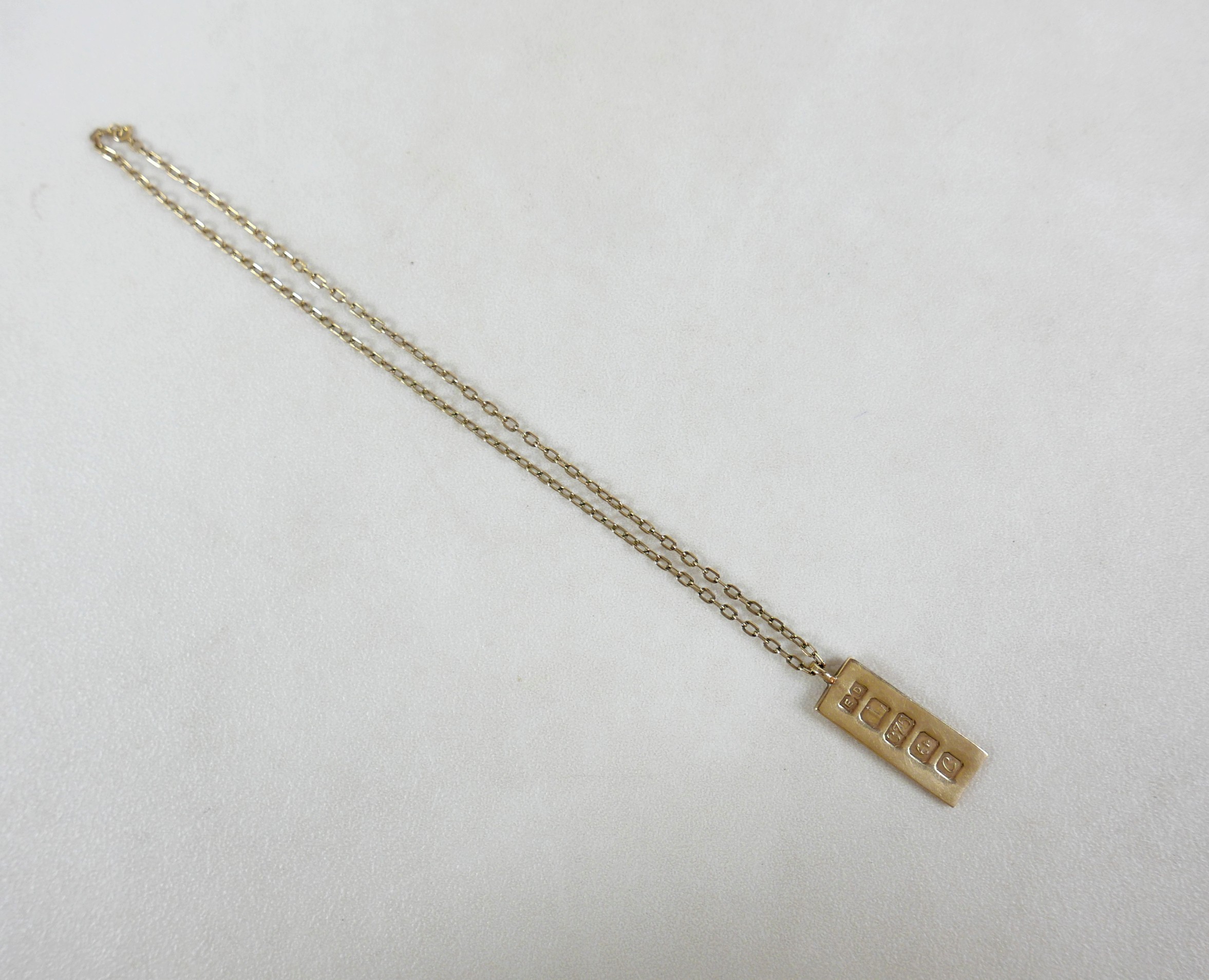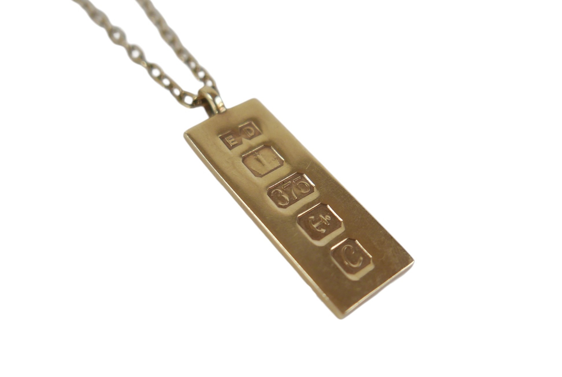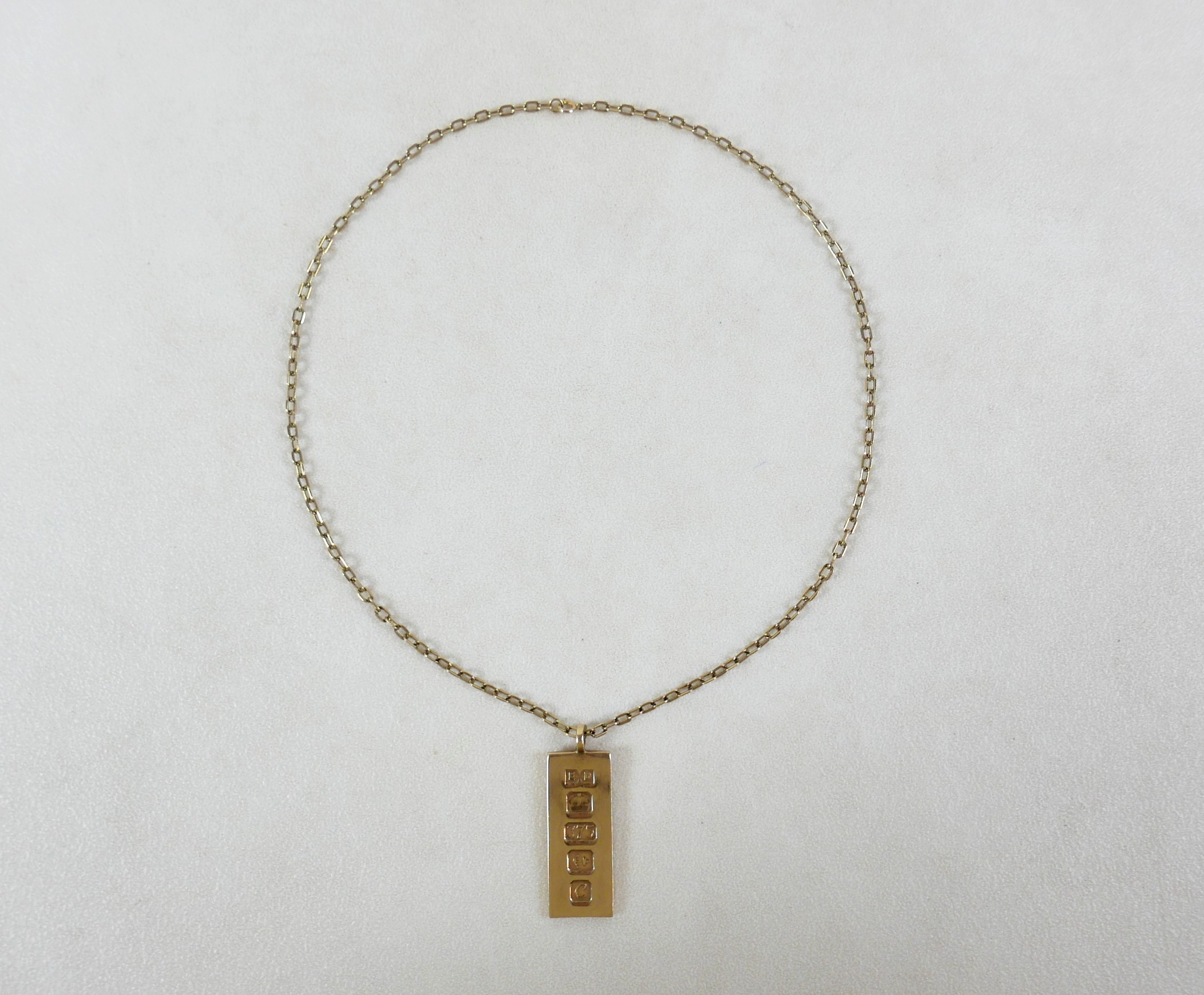 A 9ct gold ingot pendant with chain necklace, 47.5cm long, 22.2g overall.