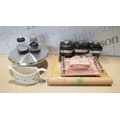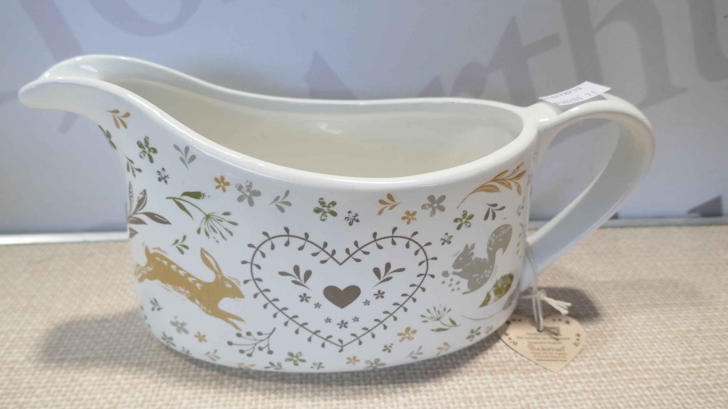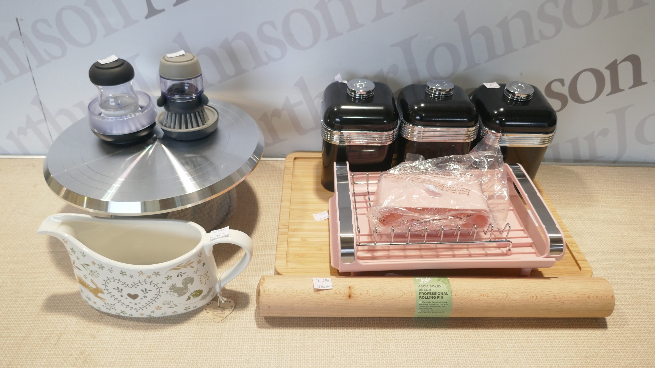 A Chopping board and rolling pin, set of 3 tea and coffee storage containers, metal cake stand, 2 pot scrubbers, small washing up stand and a gravy boat etc. * This lot is subject to VAT