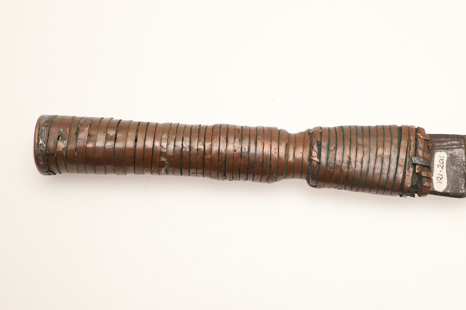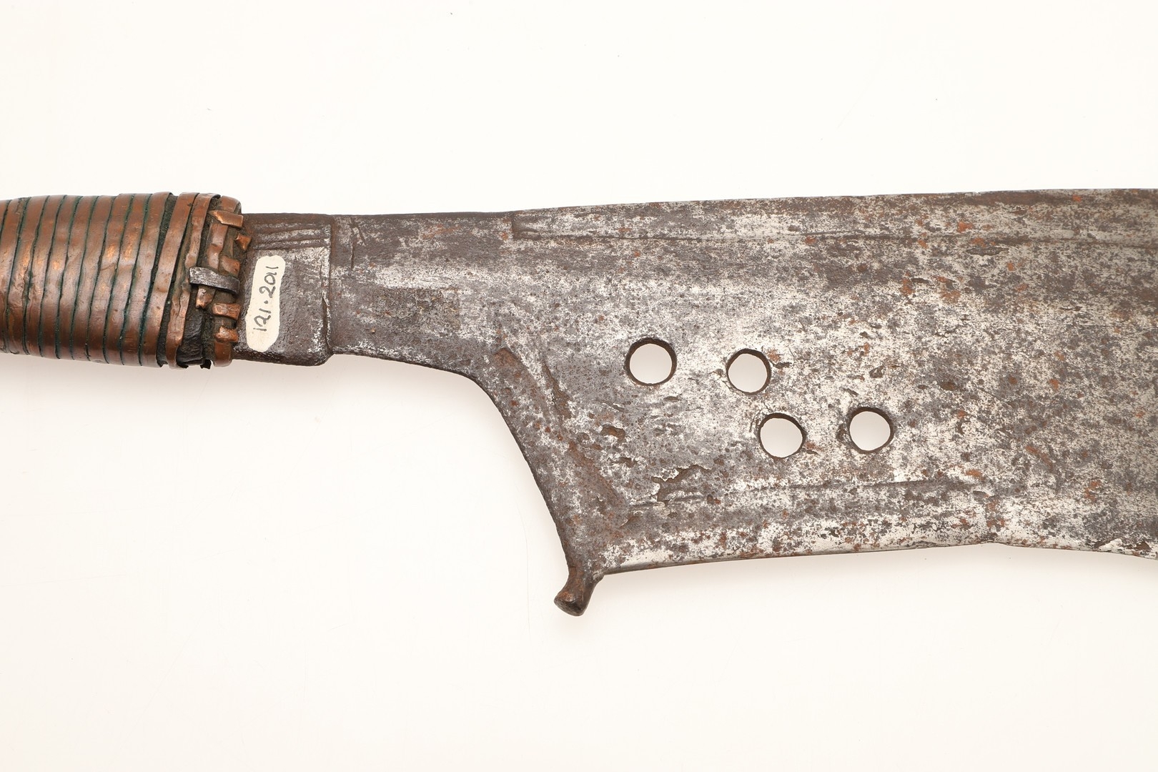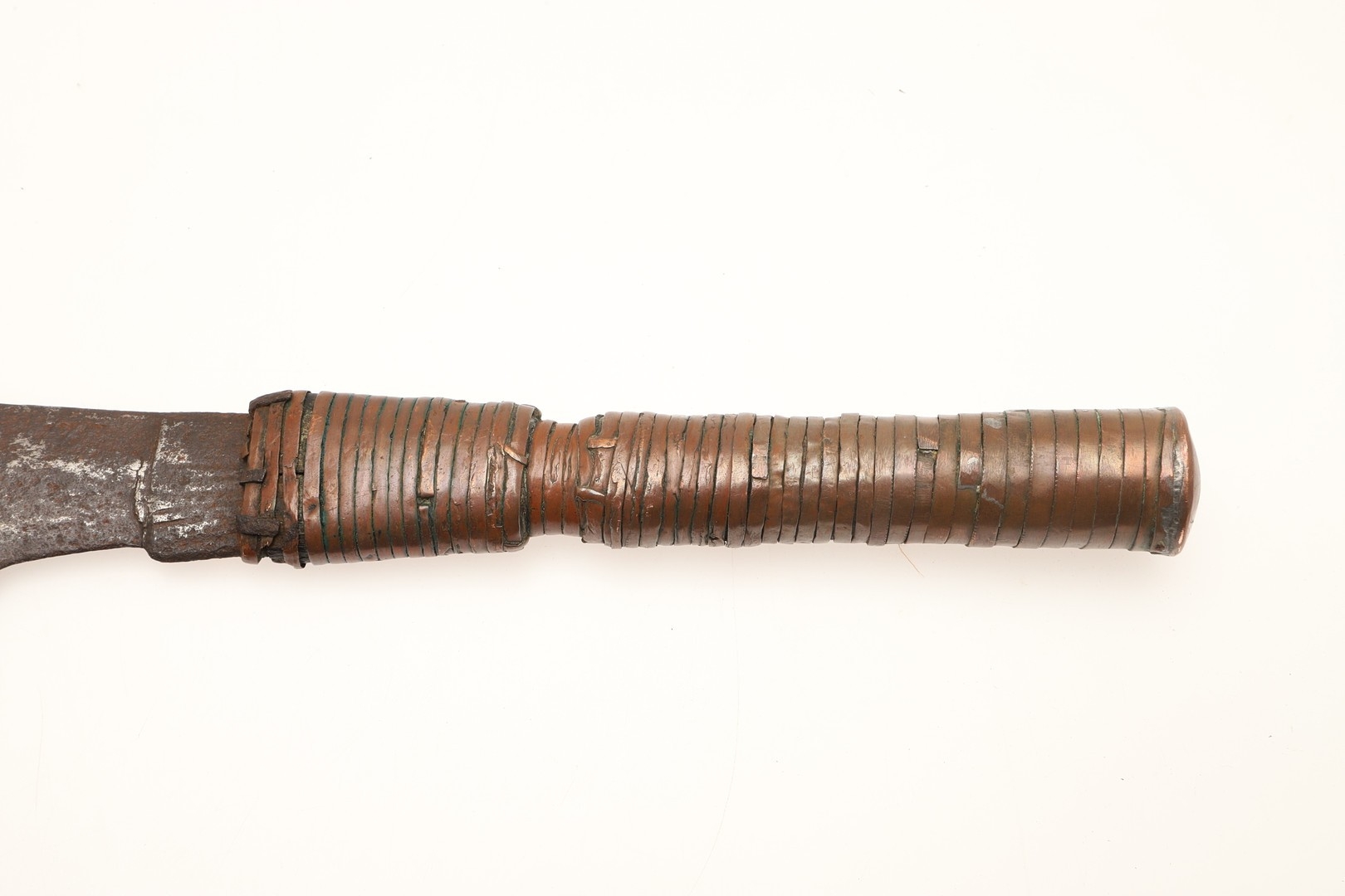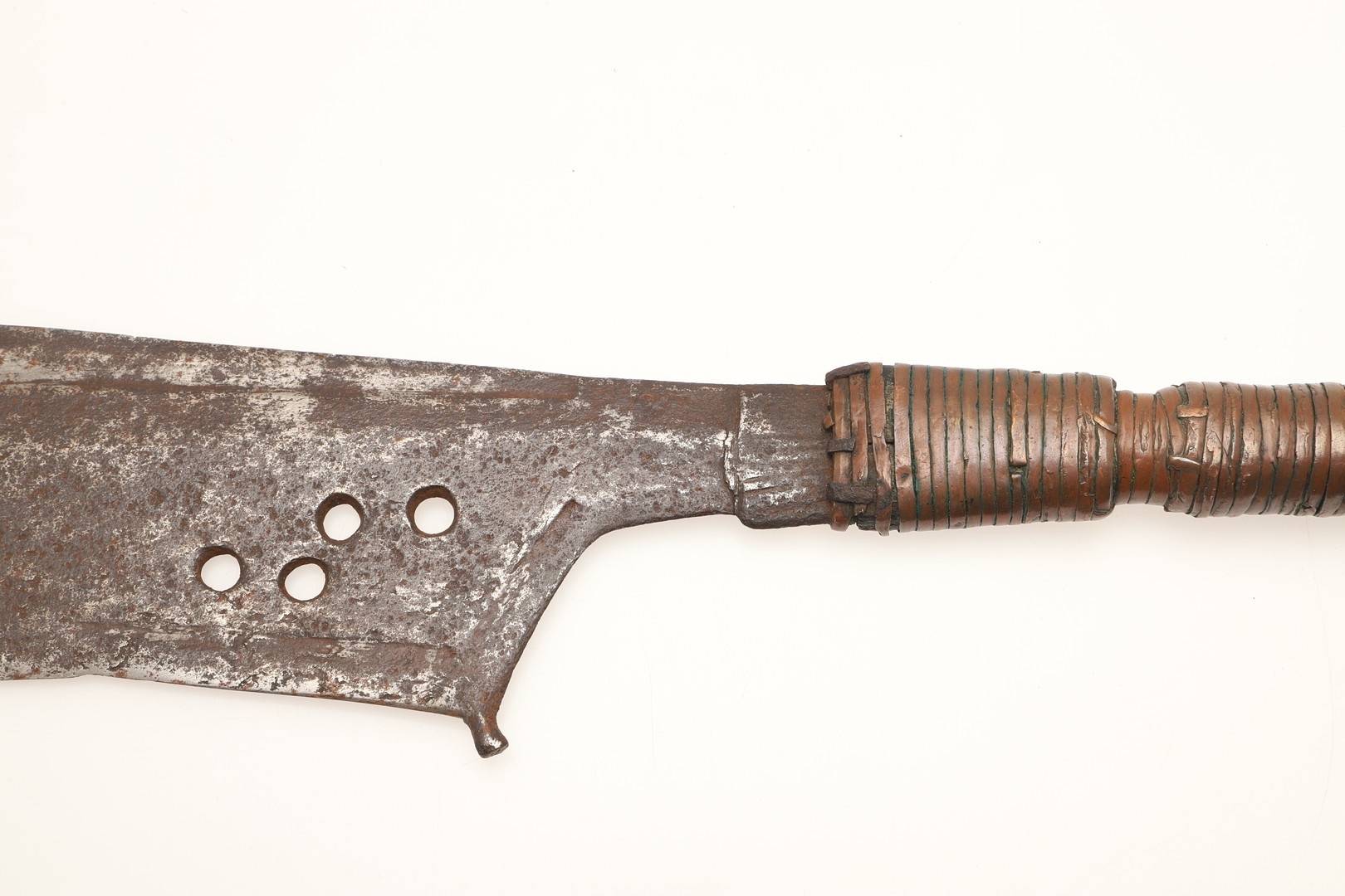 A TROMBASH THROWING KNIFE OF THE MANGEBUTI PEOPLE. The blade 27 x 19 cm of a pronounced hook form, with slender tapering point and four pierced holes towards the grip. On a flattened copper bound grip. 44.5 cm. "The Mangbetuti call their language mangbetuti, a language of the Nilo-Saharan group. There is a tradition that this tribe practiced cannibalism. In the mid ninetieth century when first discovered by the German explorer botanist and ethnologist Georg Schweinfurth, the King Munsa looked not unlike an Egyptian Pharaoh, Seated on a copper covered throne wearing a double crown and holding a copper trombash".