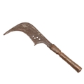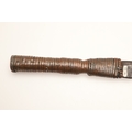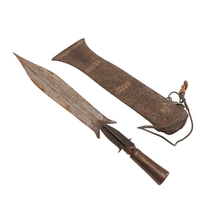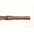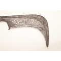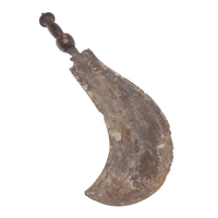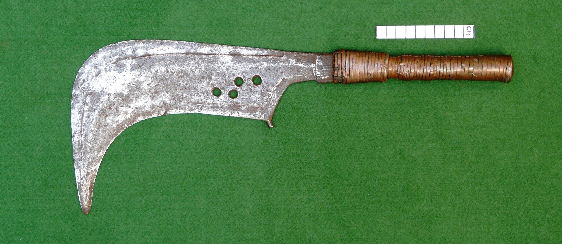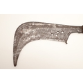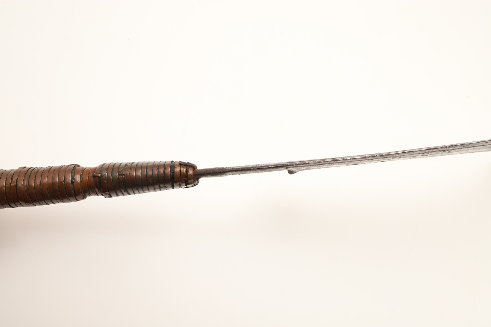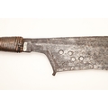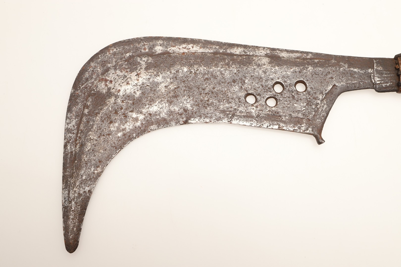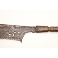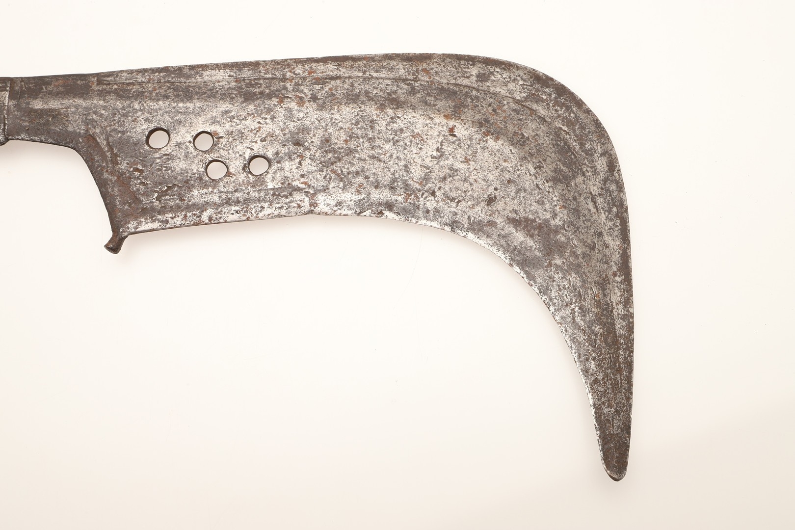 A TROMBASH THROWING KNIFE OF THE MANGEBUTI PEOPLE. The blade 27 x 19 cm of a pronounced hook form, with slender tapering point and four pierced holes towards the grip. On a flattened copper bound grip. 44.5 cm. "The Mangbetuti call their language mangbetuti, a language of the Nilo-Saharan group. There is a tradition that this tribe practiced cannibalism. In the mid ninetieth century when first discovered by the German explorer botanist and ethnologist Georg Schweinfurth, the King Munsa looked not unlike an Egyptian Pharaoh, Seated on a copper covered throne wearing a double crown and holding a copper trombash".