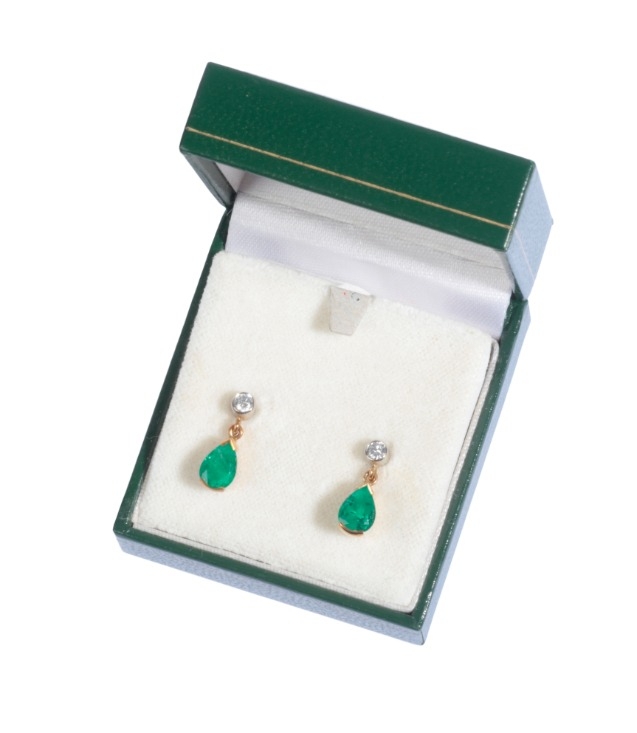 A PAIR OF EMERALD AND DIAMOND DROP EARRINGS