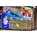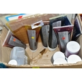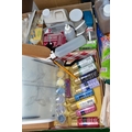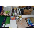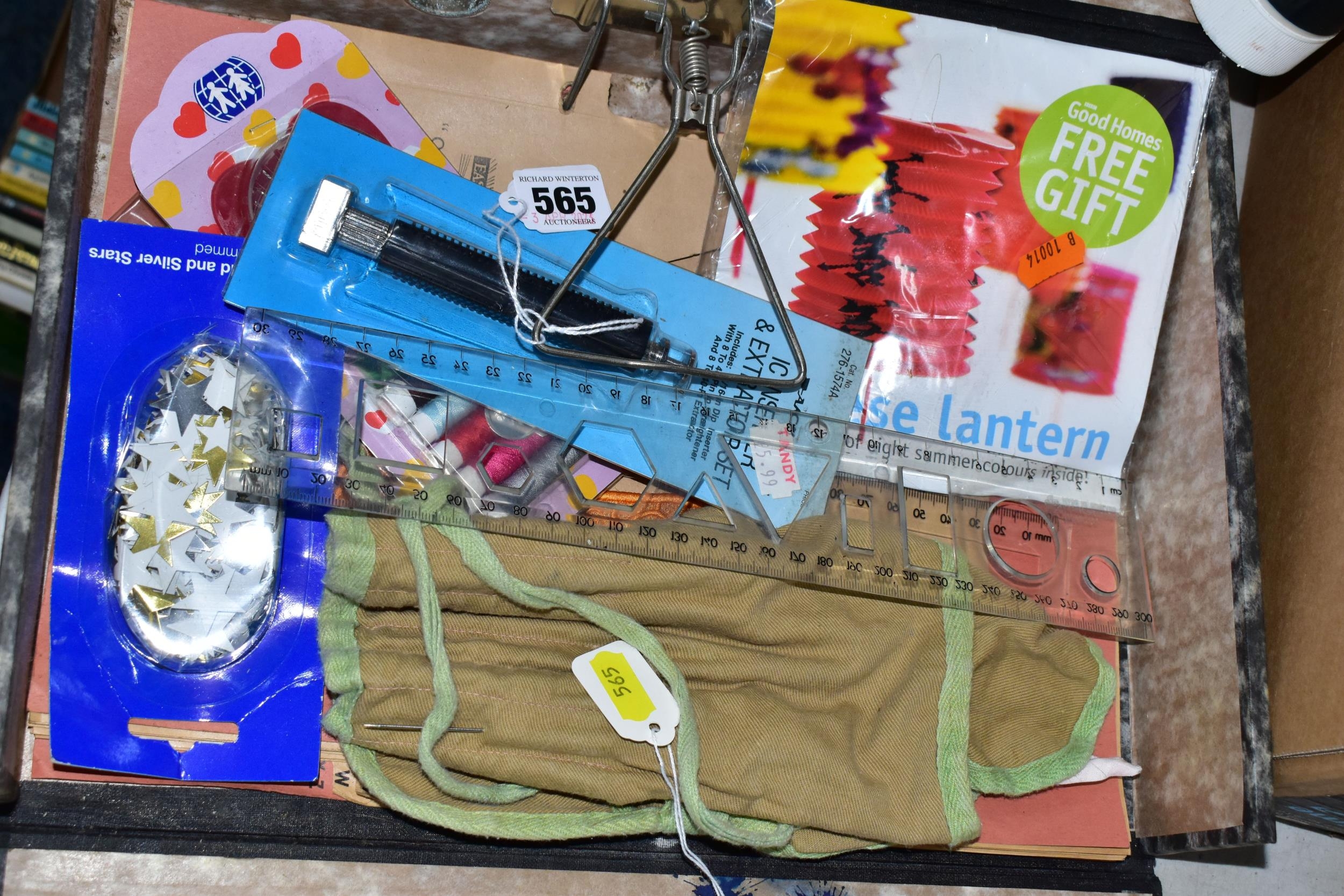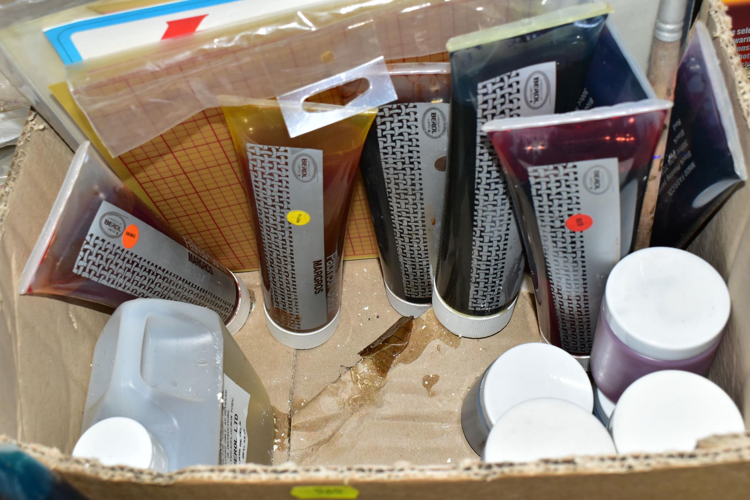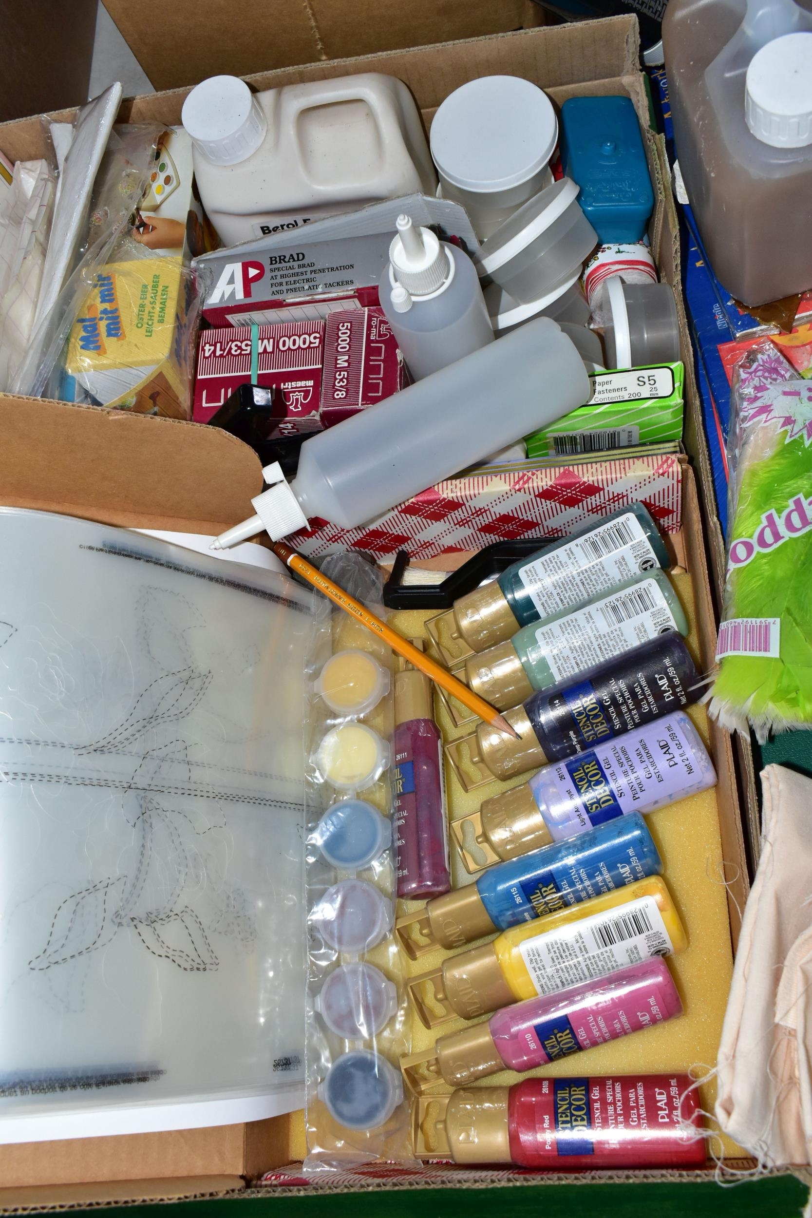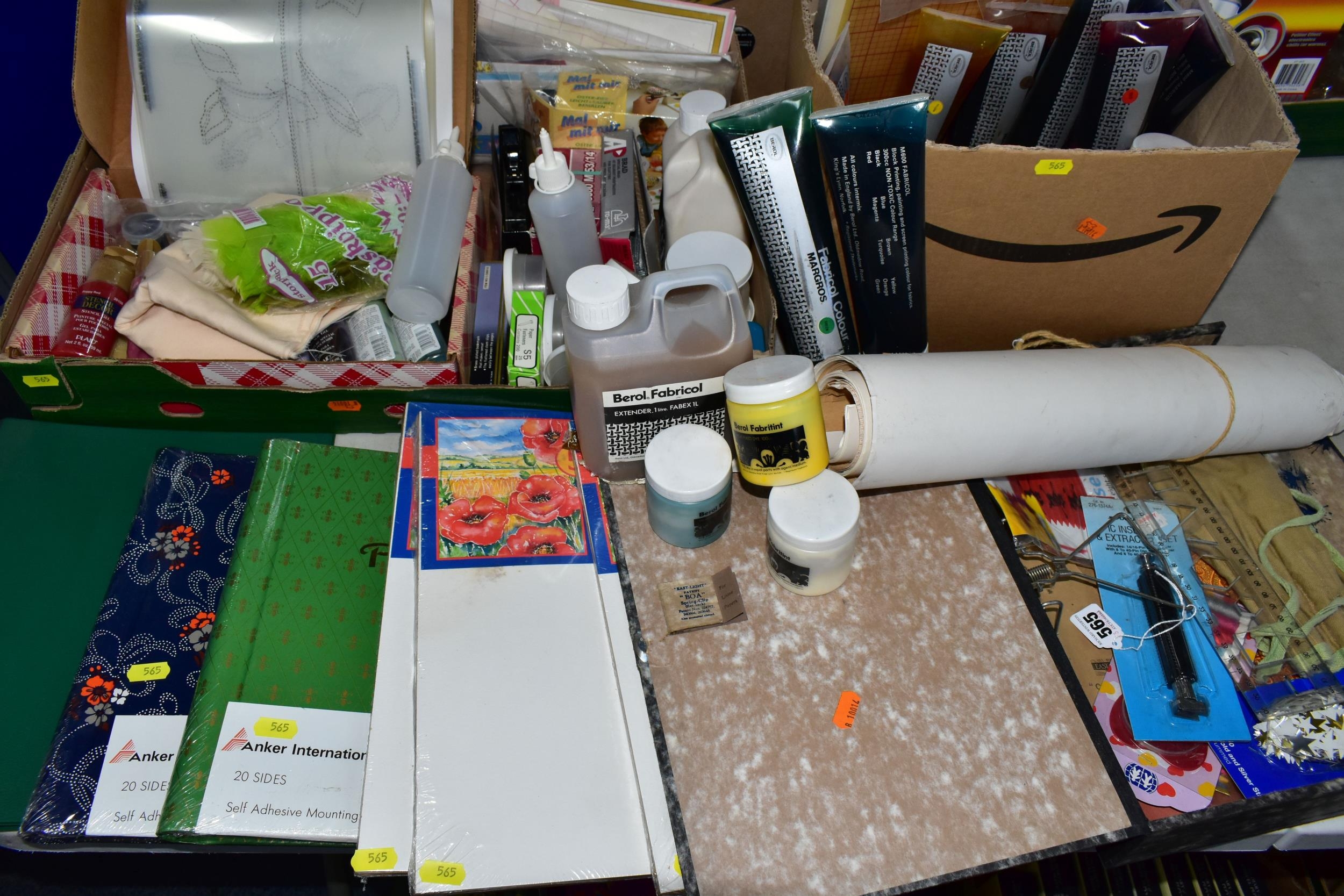 TWO BOXES, A BOX FILE AND LOOSE ART AND CRAFTS EQUIPMENT, ETC, including stencil decor, sealed packs of watercolour painting boards, sealed photograph albums, template sheets, fabric dyes, etc (2 boxes, box file and loose)