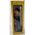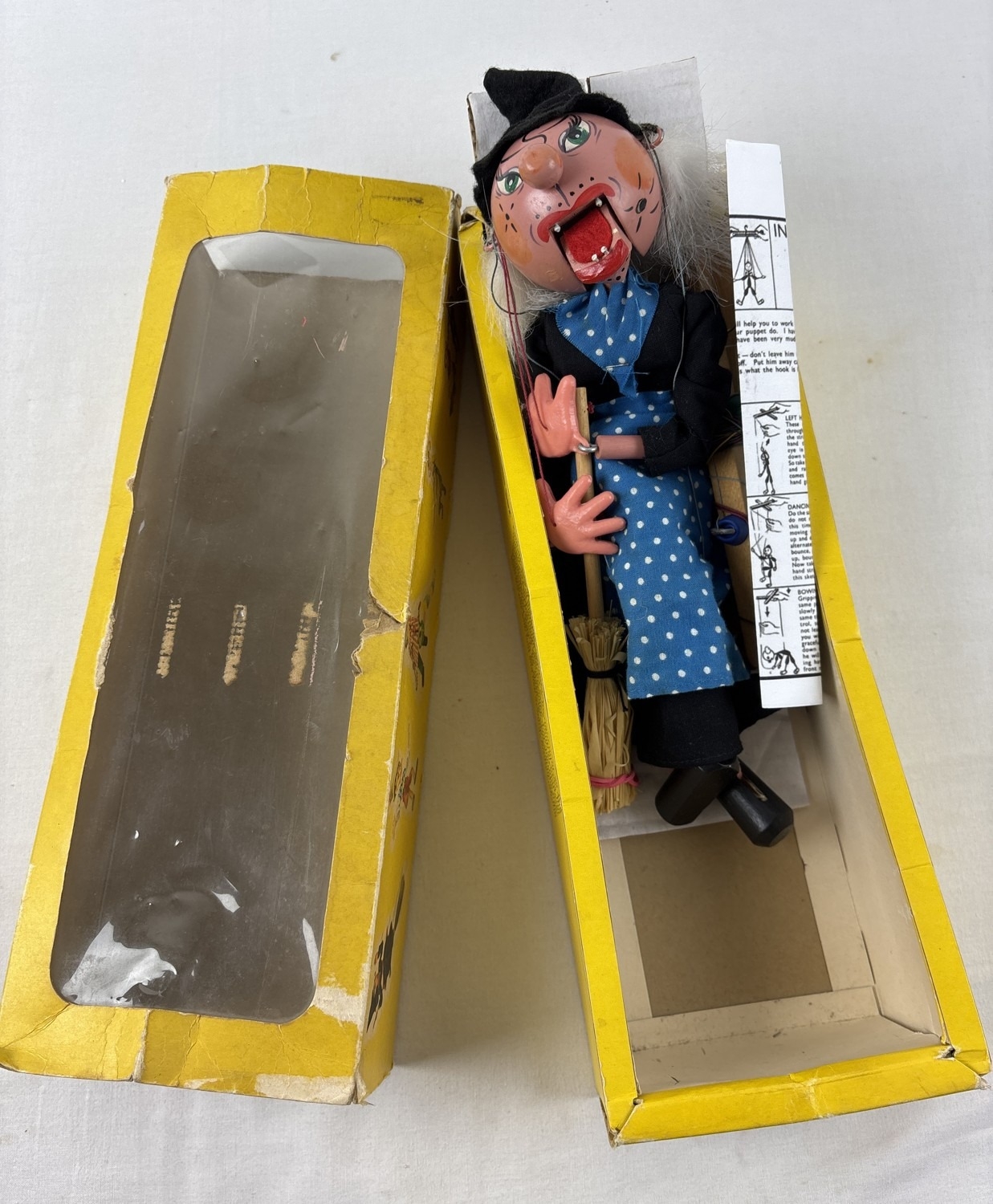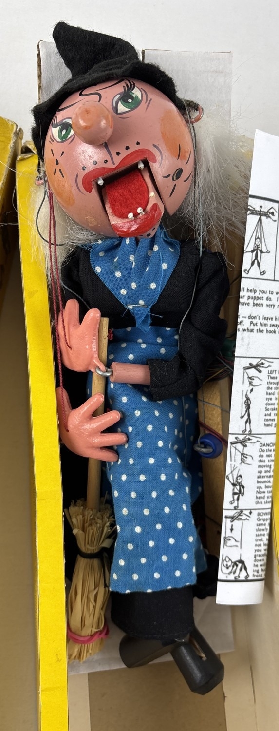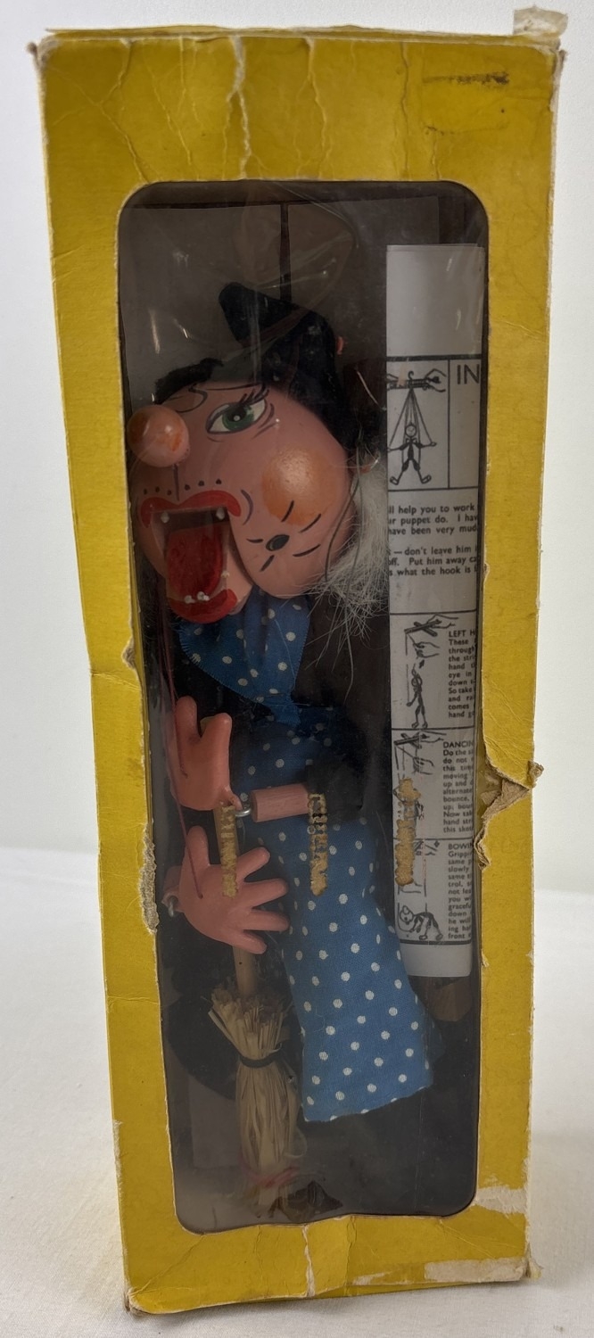 A boxed vintage wooden Pelham Puppets marionette puppet of a witch. Comes with printed instructions.
