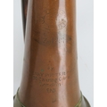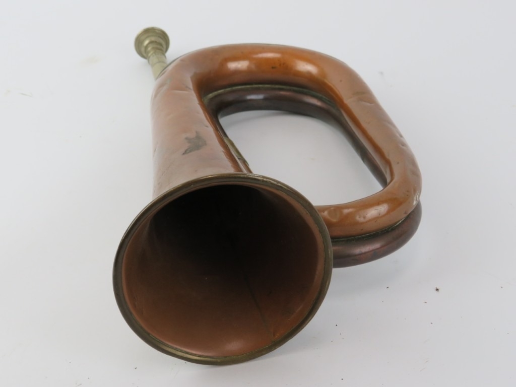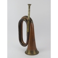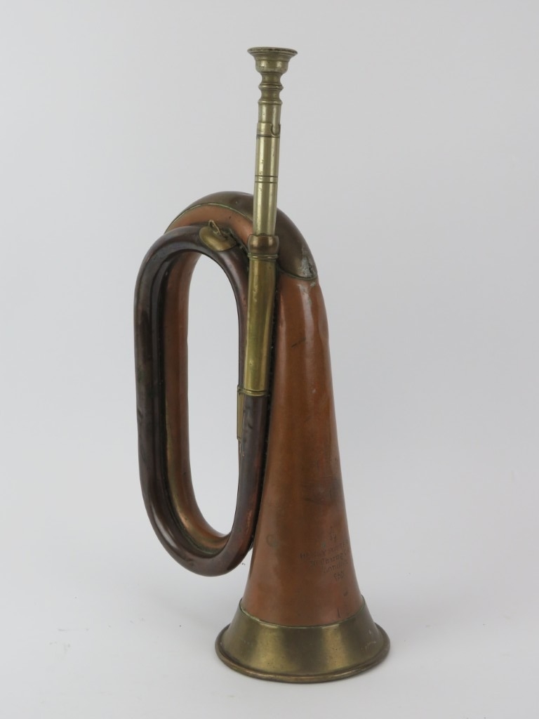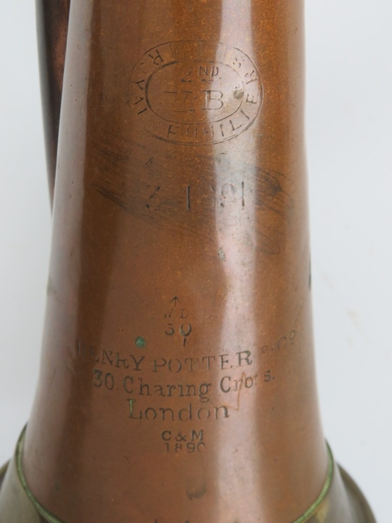 A British Royal Fusiliers 2nd Battalion, City of London regiment copper and brass bugle horn, 19th century. Dated 1890. 34 cm length.