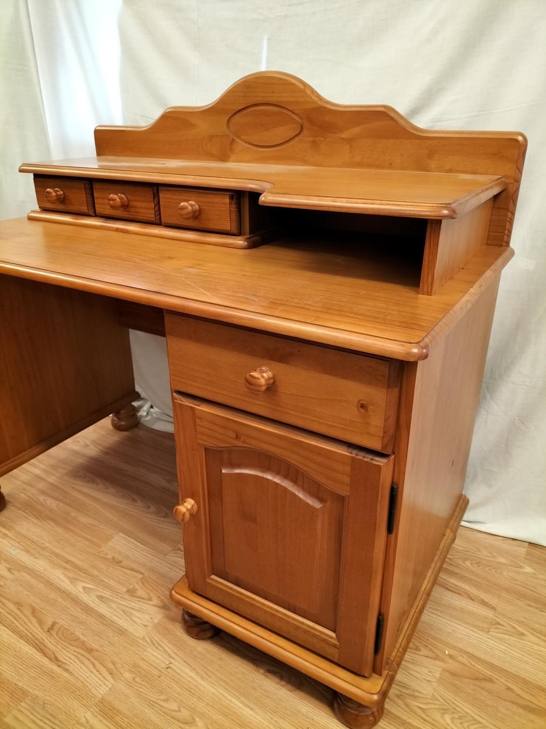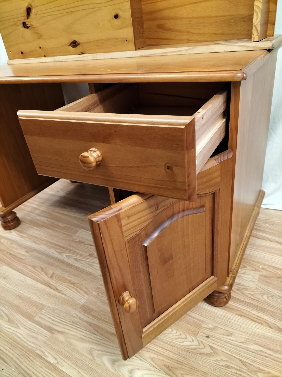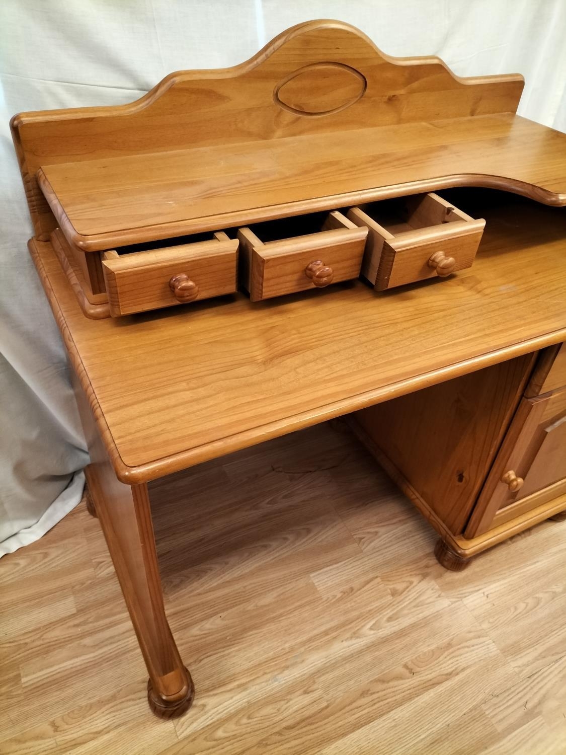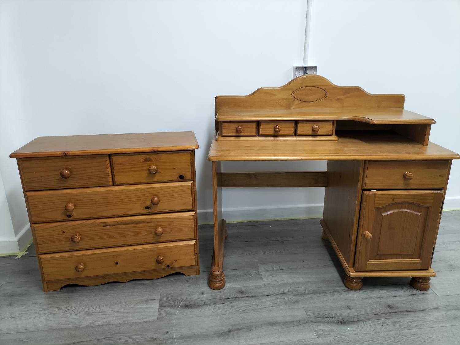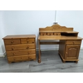 Pine Dressing Table with Side Drawer Over Cupboard and Removeable Three Drawer Top Section plus a Set of Pine Two Over Three Drawers (75cm High, 85cm x 39cm). Desk Measures 73cm High (Without Top), 104cm (With Top), 113cm x 61cm. Collection Only.