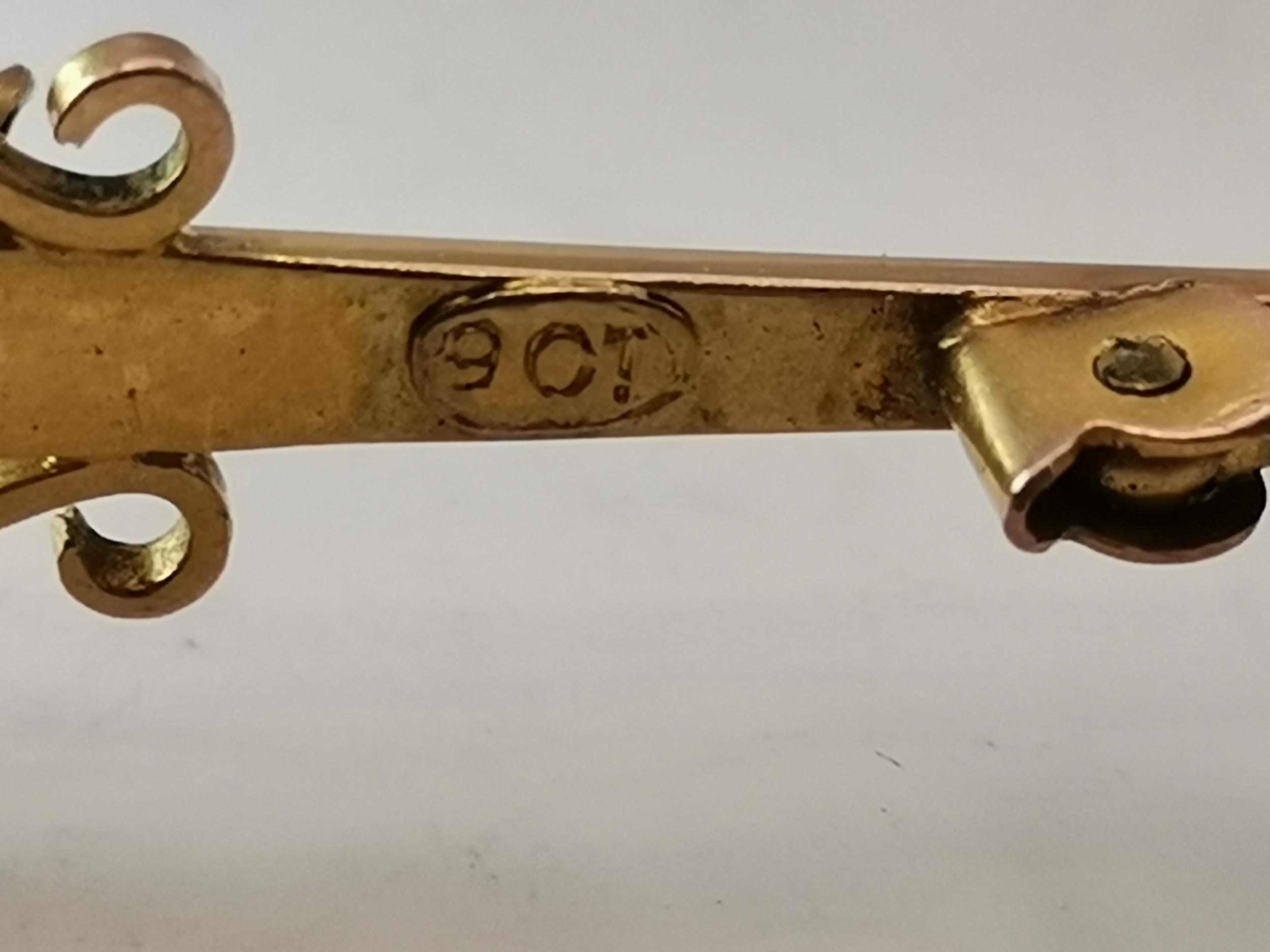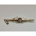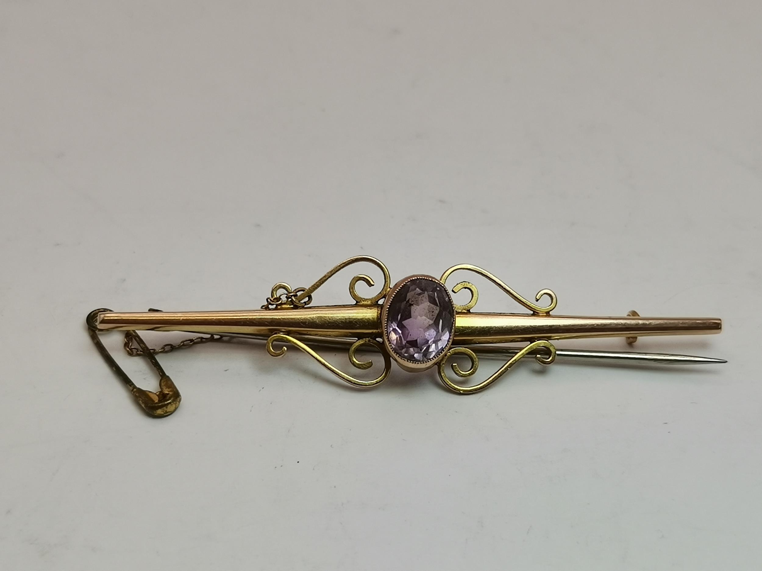 A 9 carat gold gem-set bar brooch, the central oval pink stone enclosed within s-scroll supports, stamped 9CT. 69mm wide, 3.6g gross