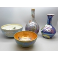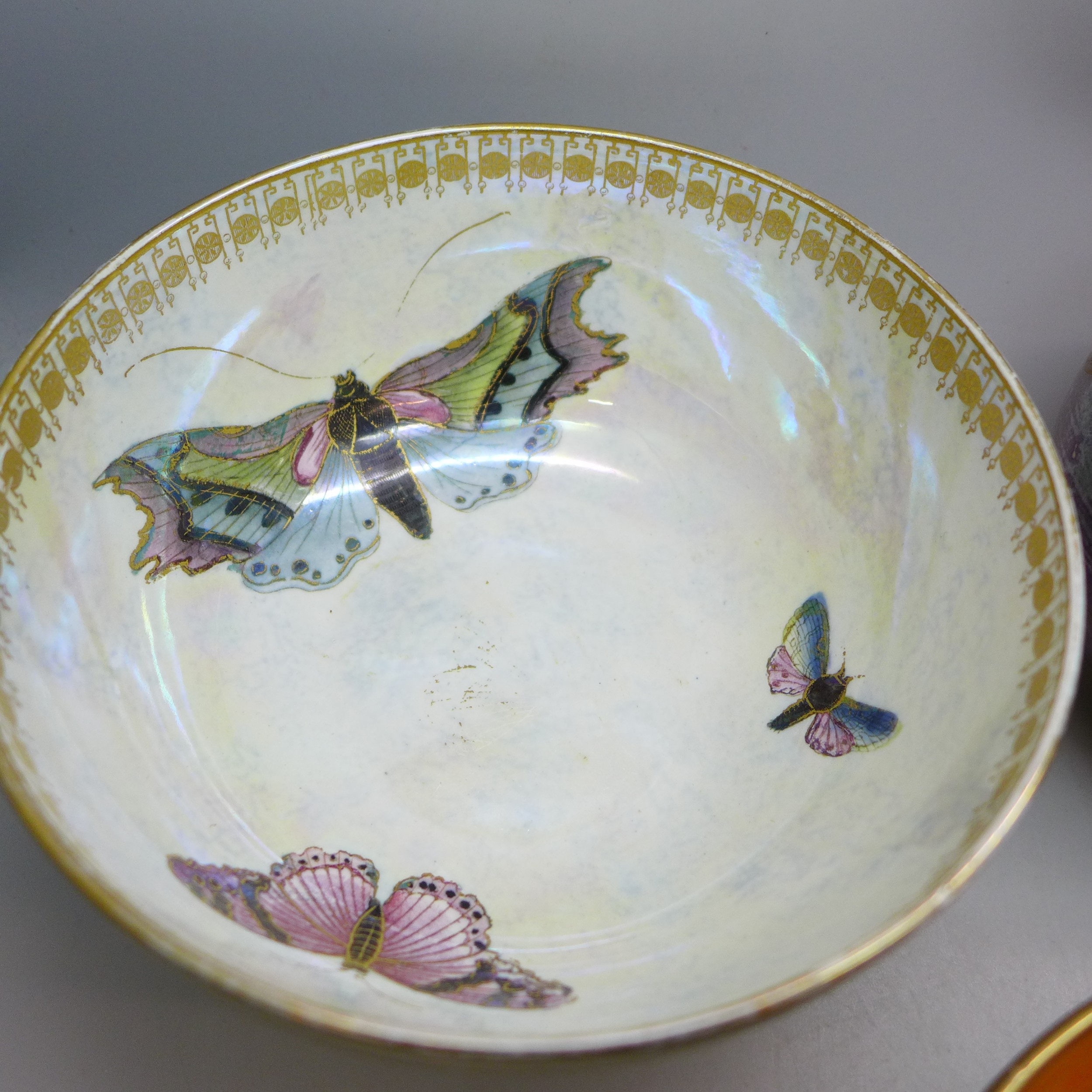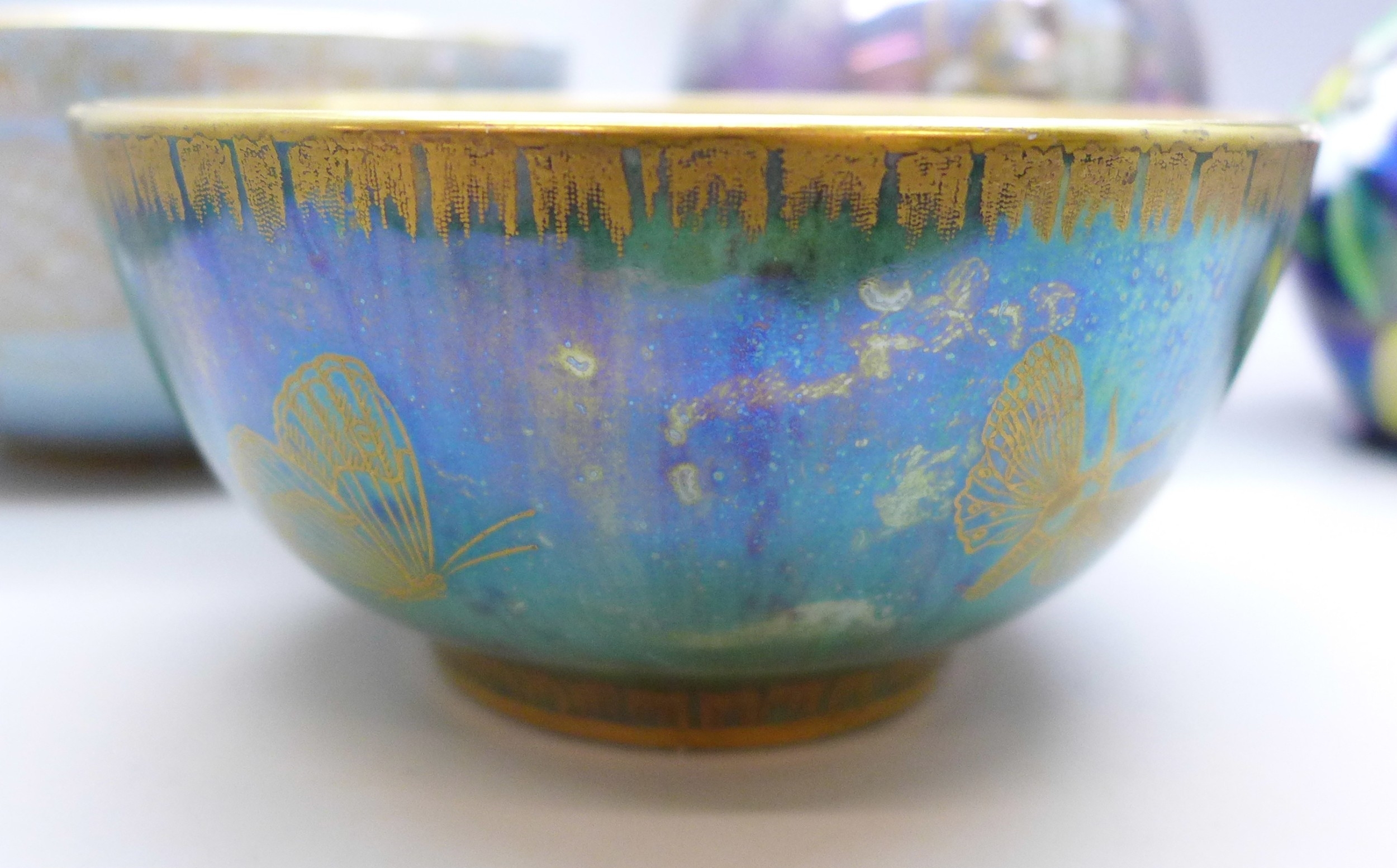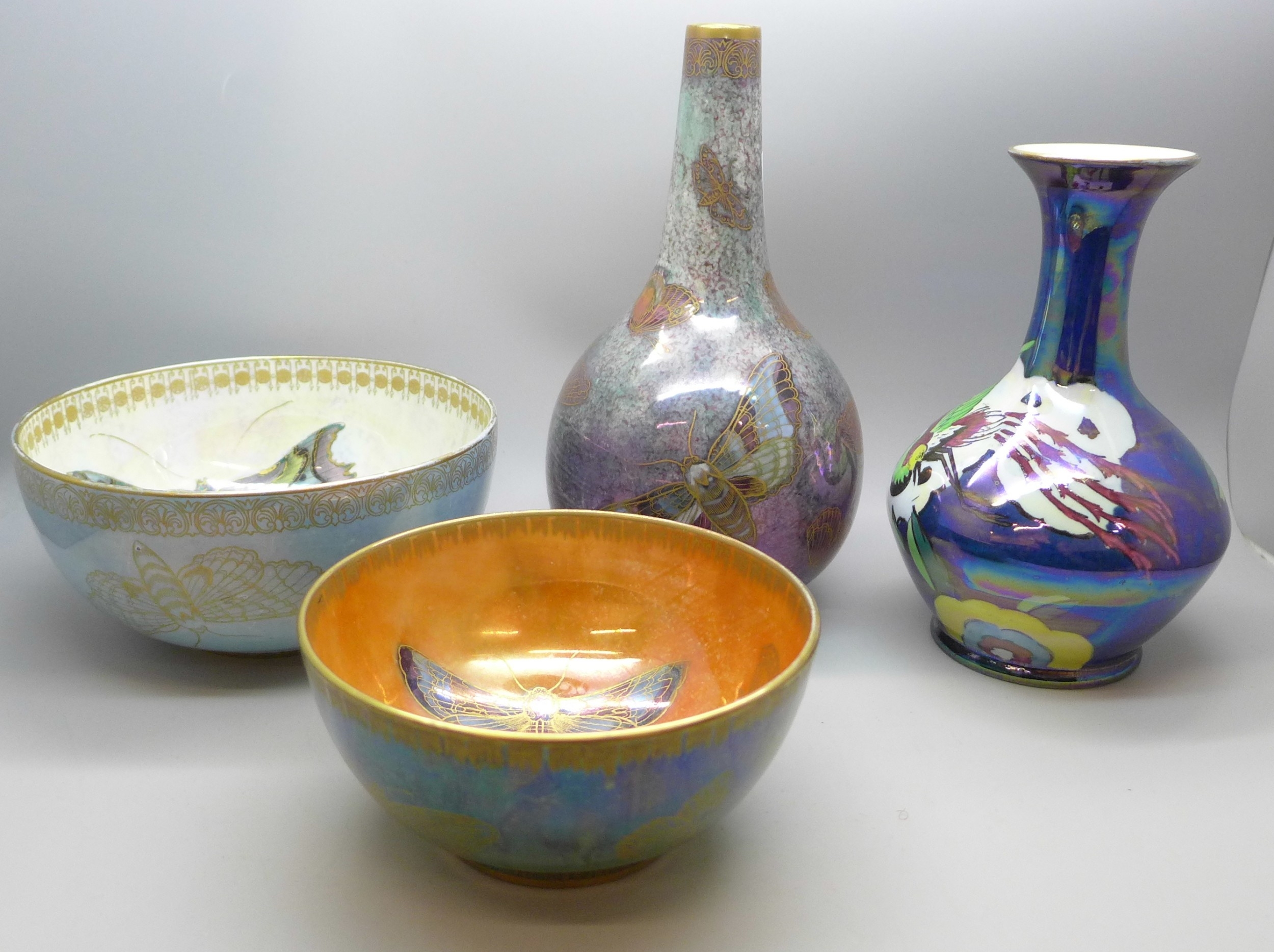 Collection of Carlton Ware lustre pottery to include 1920s Armand Lustre Ware bowl and vase both with butterfly detail, a pale blue and white moth lustre bowl, and a later Art Deco vase, tallest vase 19cm